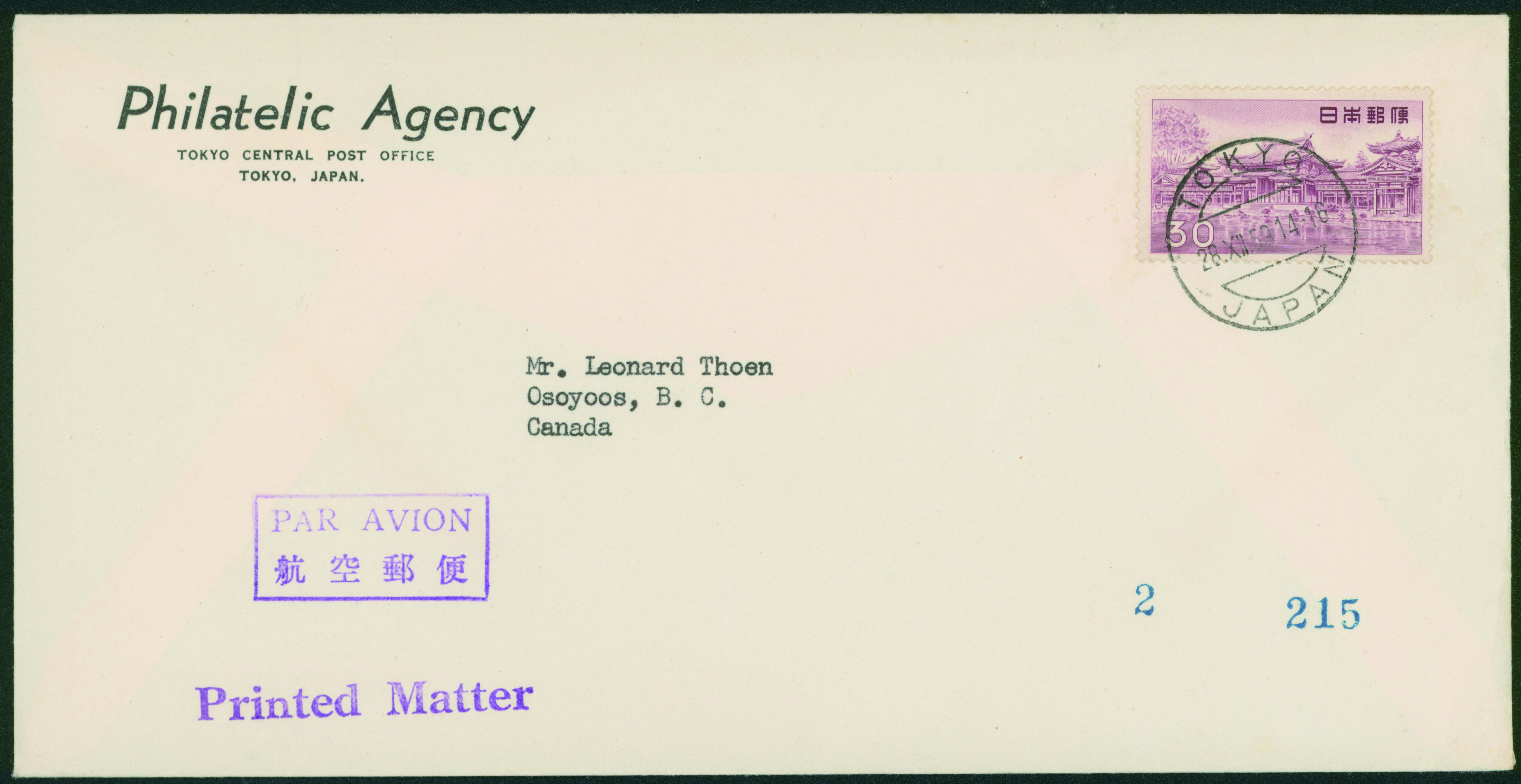 370 362 image1952-1959 issue 30 Yen single franking cancelled by roman letter sword cds 1959-12-28 TOKYO to Canada (Image1) (Image2) (All Images)