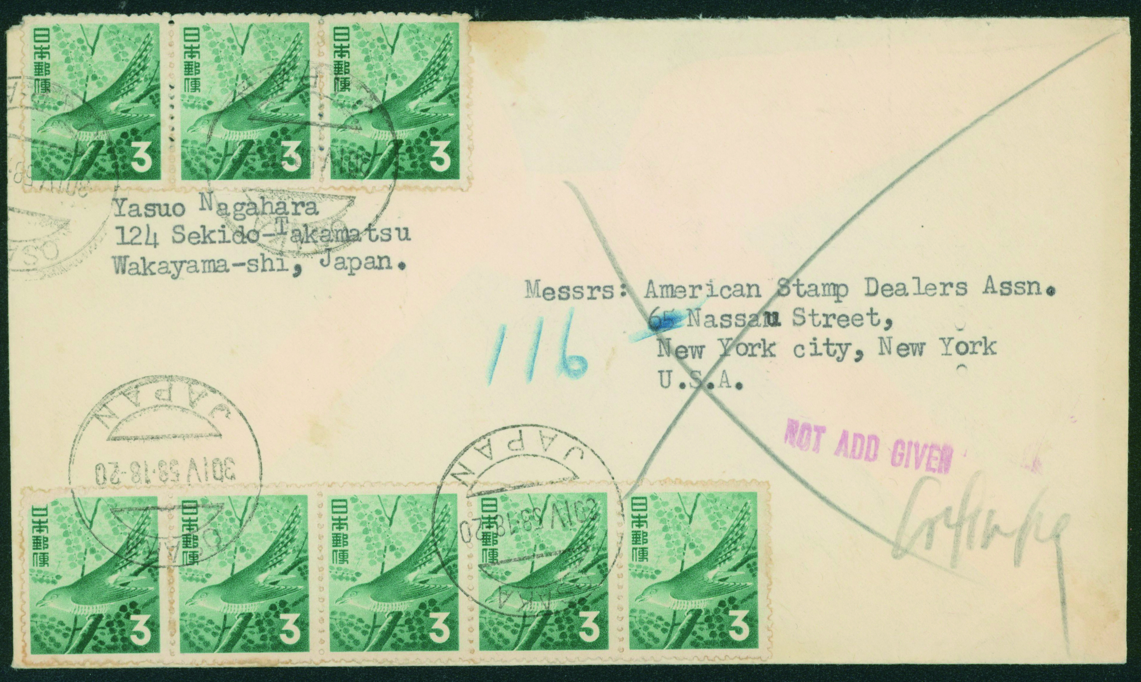 366 354(8) image1952-1959 issue 3 Yen (8) cancelled by roman letter sword cds 1958-04-30 OSAKA to USA (Image1) (Image2) (All Images)