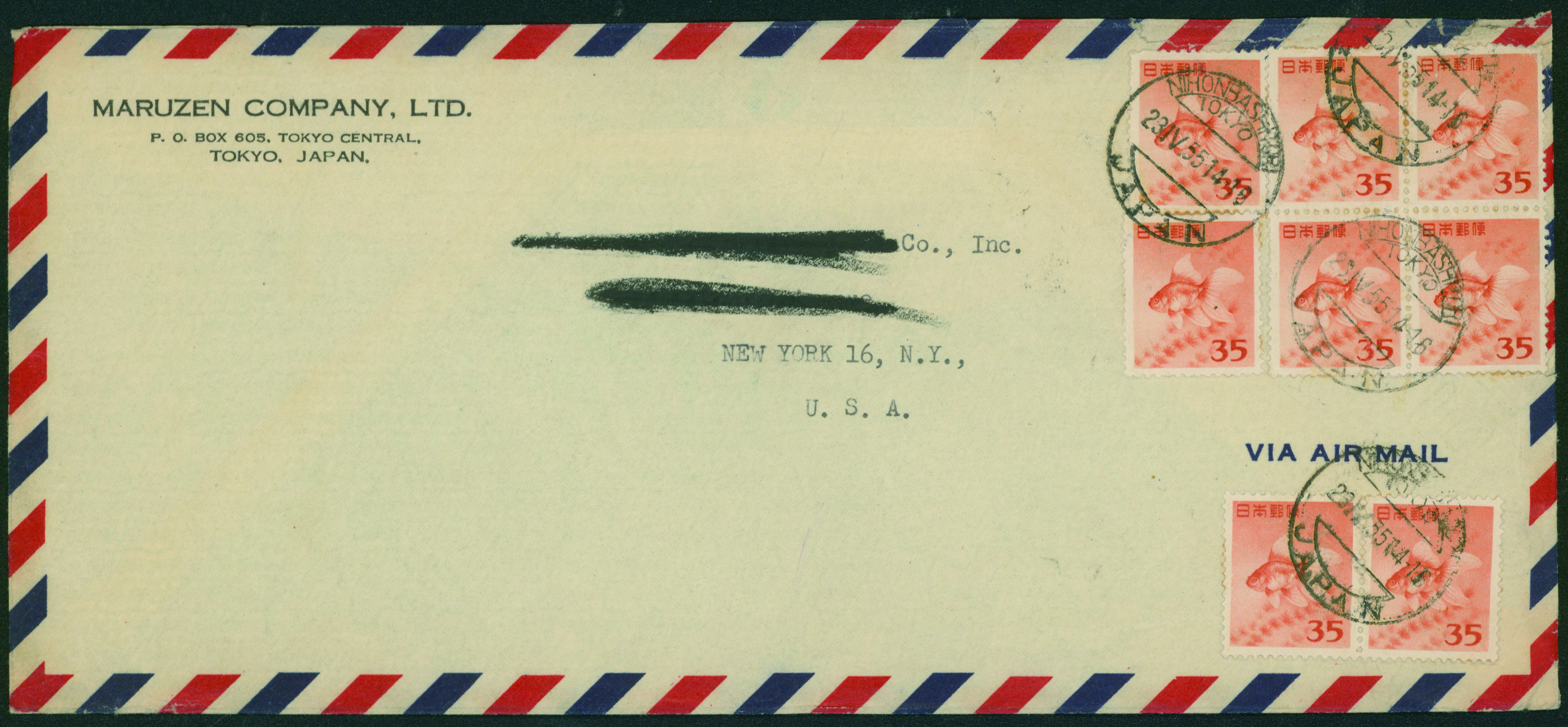 373 363(8) image1952-1959 issue 35 Yen (8) cancelled by roman letter sword cds 1955-04-23 NIHONBASHIDORI to USAweight letter (Image1) (Image2) (All Images)