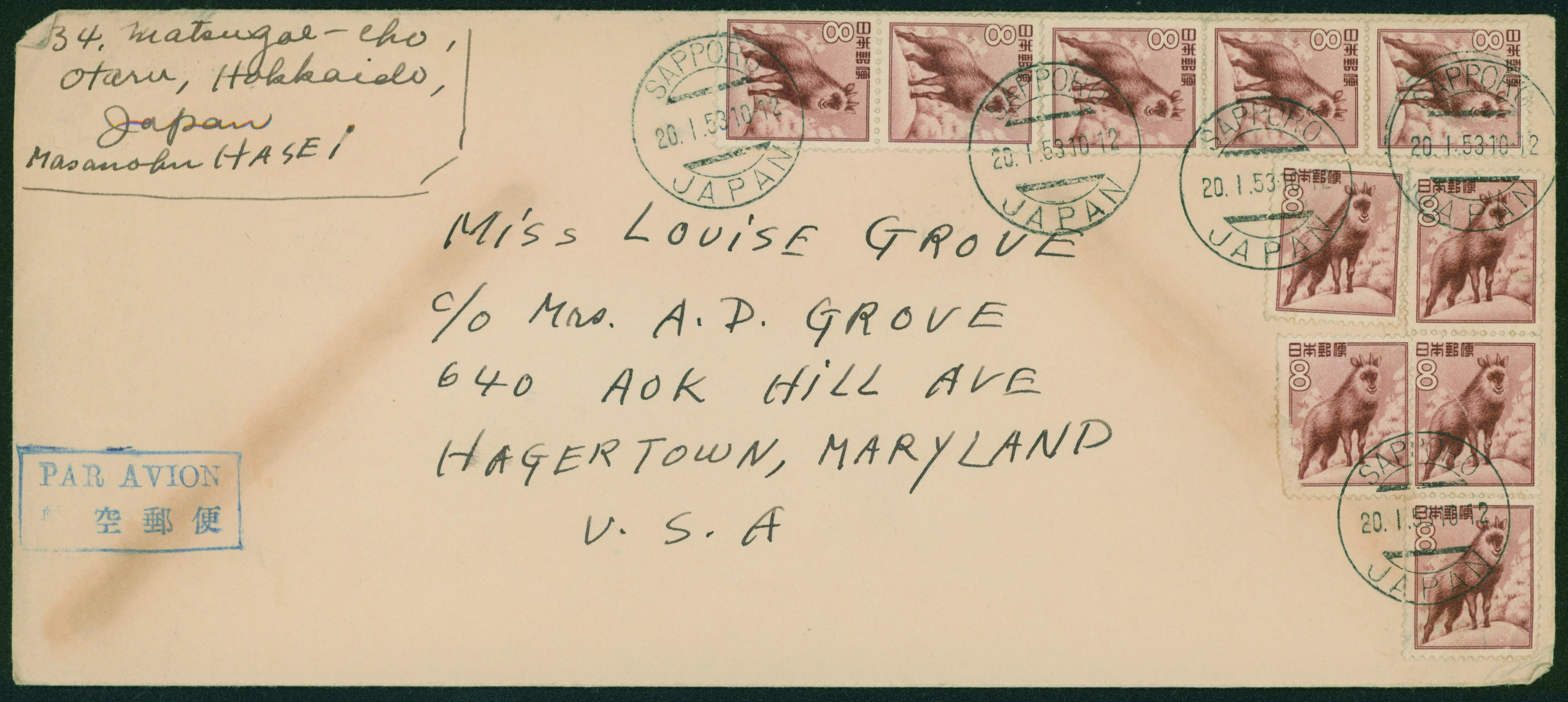 367 357(10) image1952-1959 issue 8 Yen (10) cancelled by roman letter sword cds 1953-01-20 SAPPORO to USA (Image1) (Image2) (All Images)