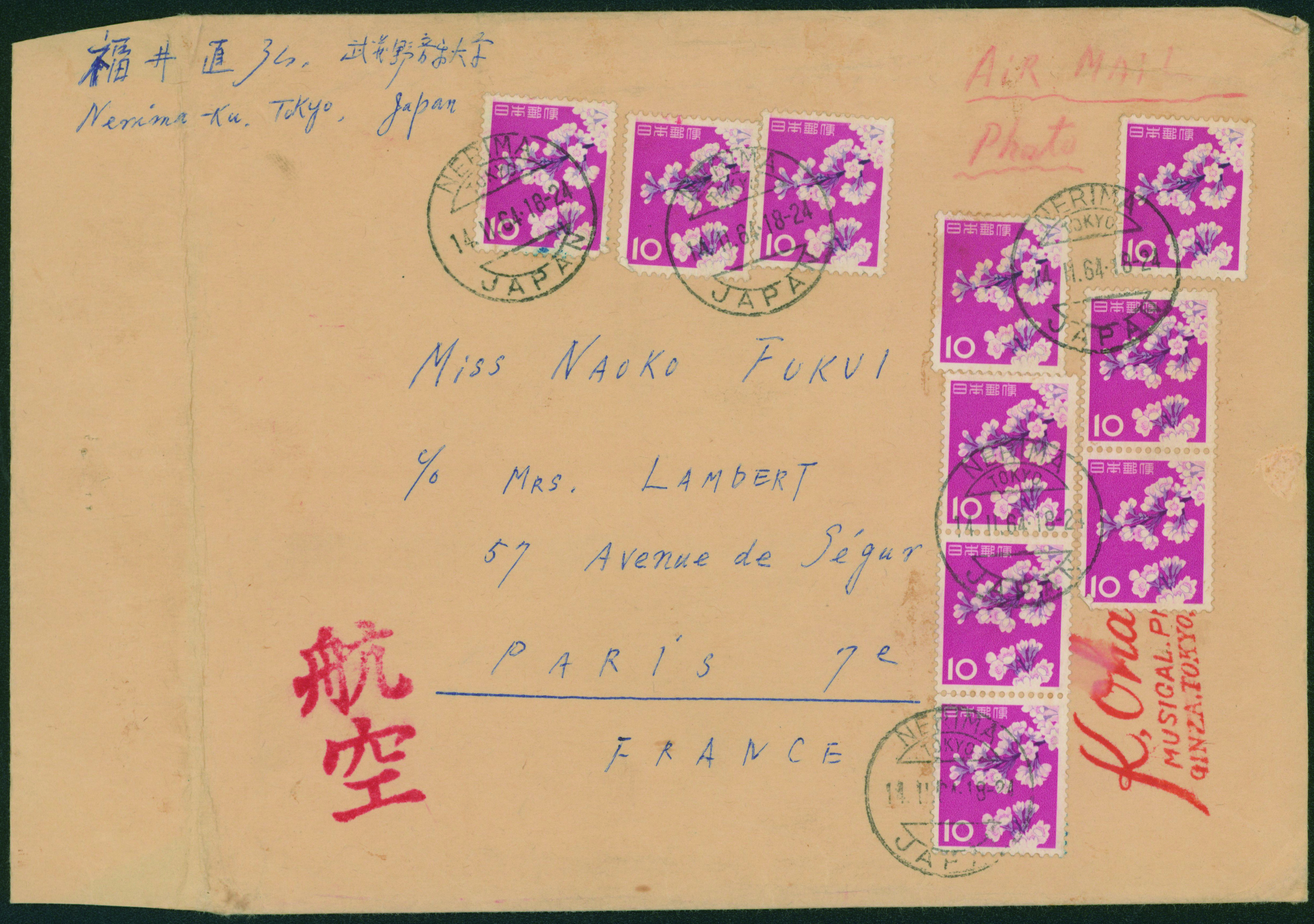 375 374(10) image1961-1965 issue 10 Yen (10) cancelled by roman letter sword cds 1964-02-14 RERIMA to France (Image1) (Image2) (All Images)