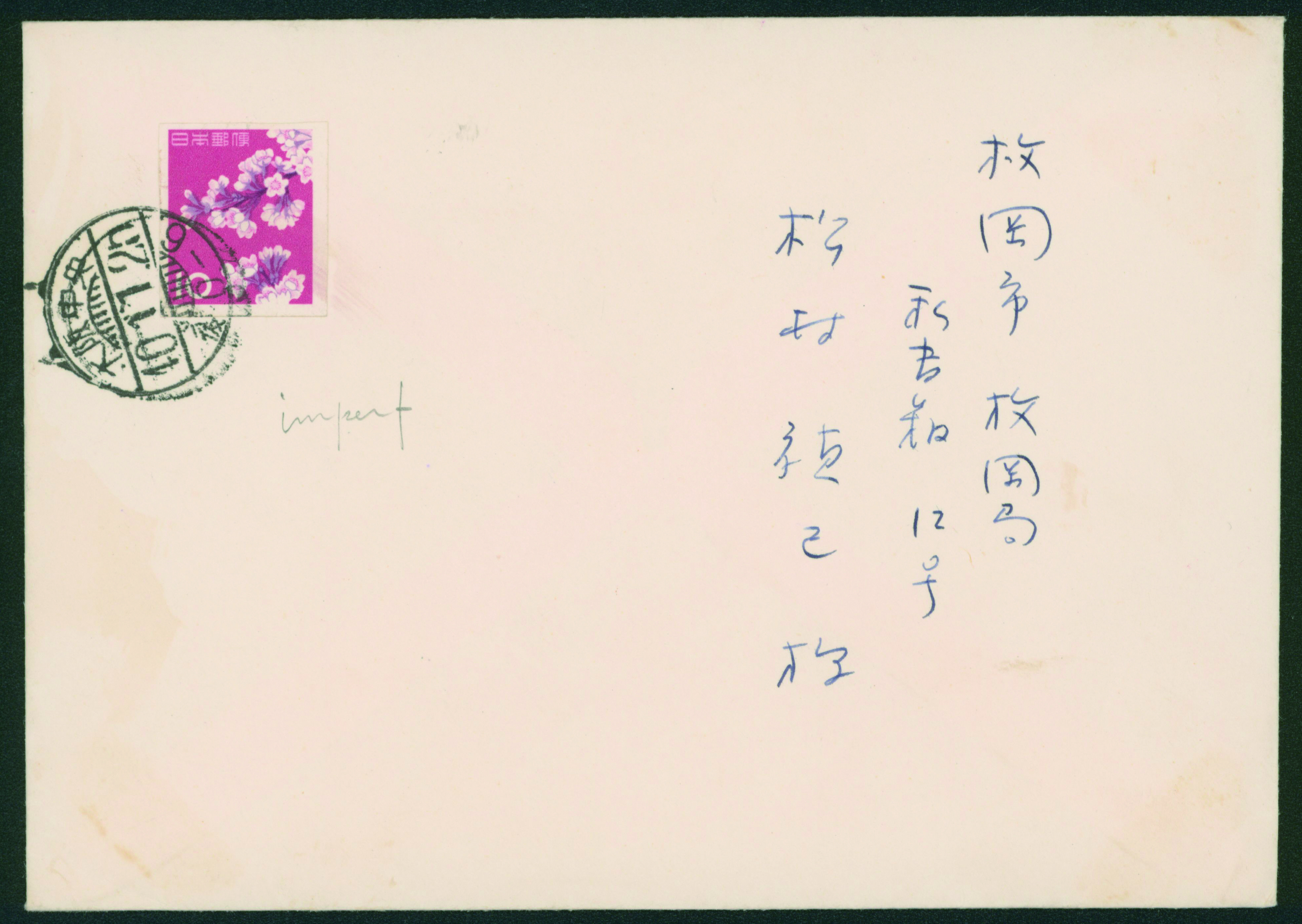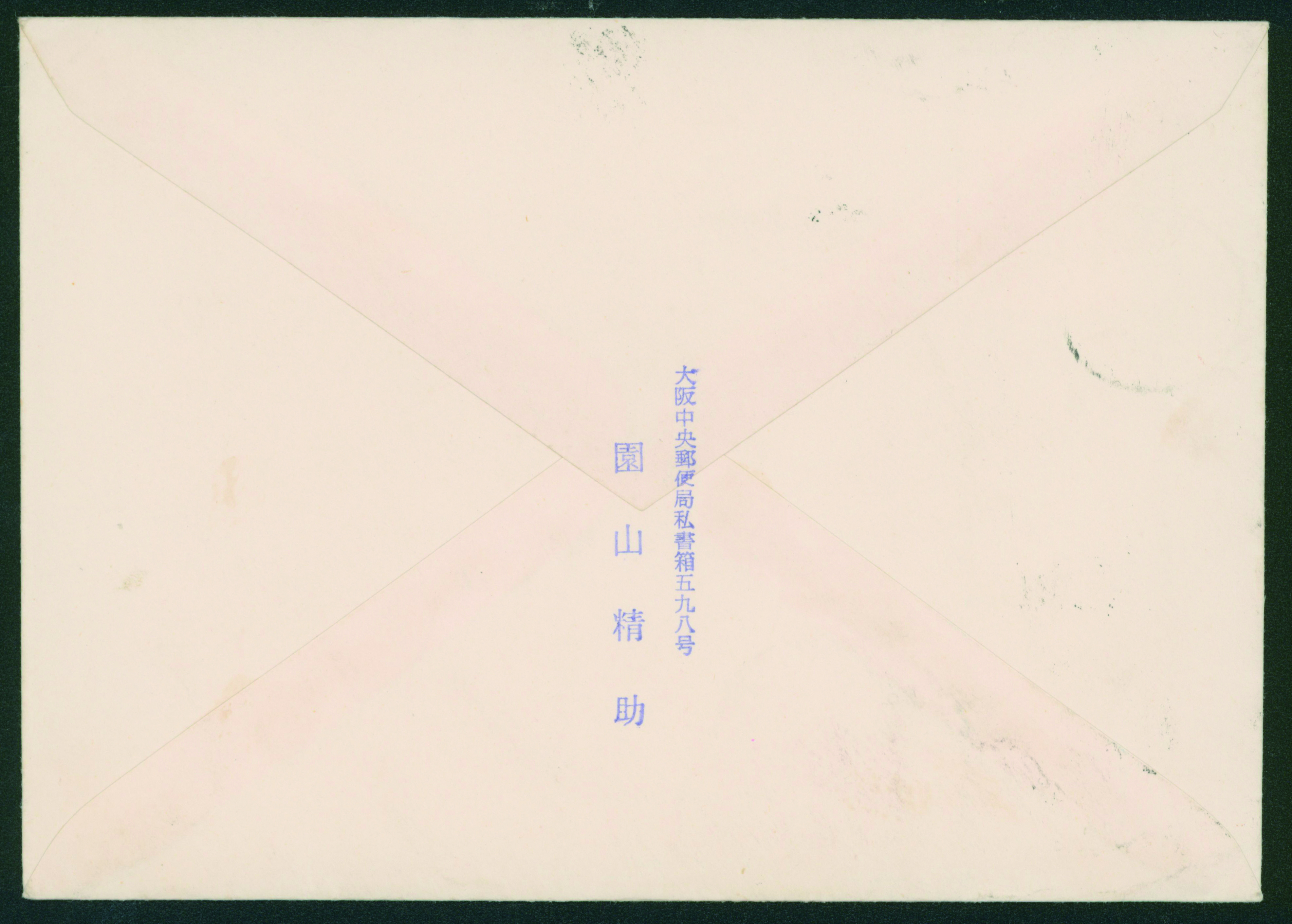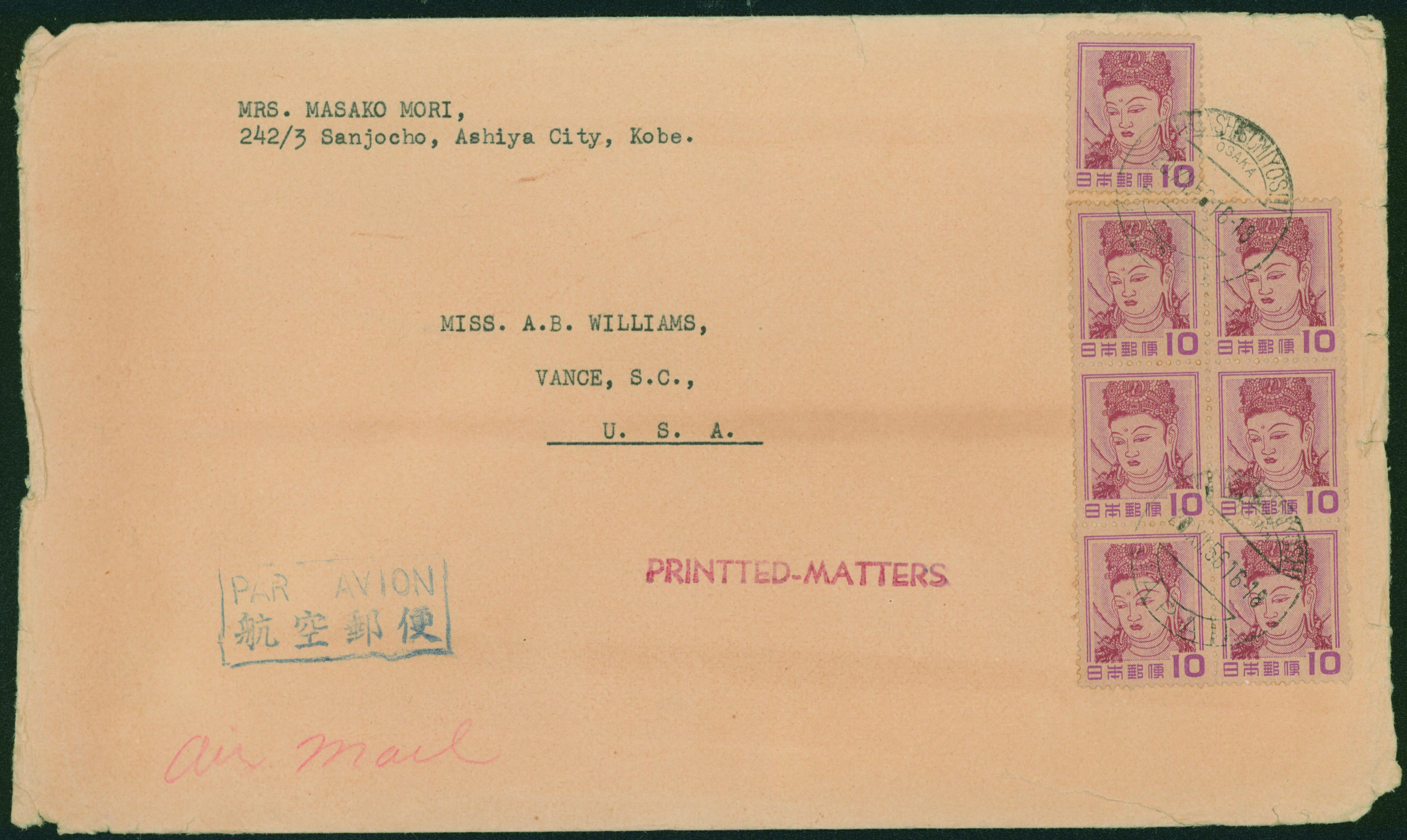 368 358(7) image1952-1959 issue 10 Yen (7) cancelled by roman letter sword cds 1956-12-20 HIGASHISUMIYOSHI to USA (Image1) (Image2) (All Images)