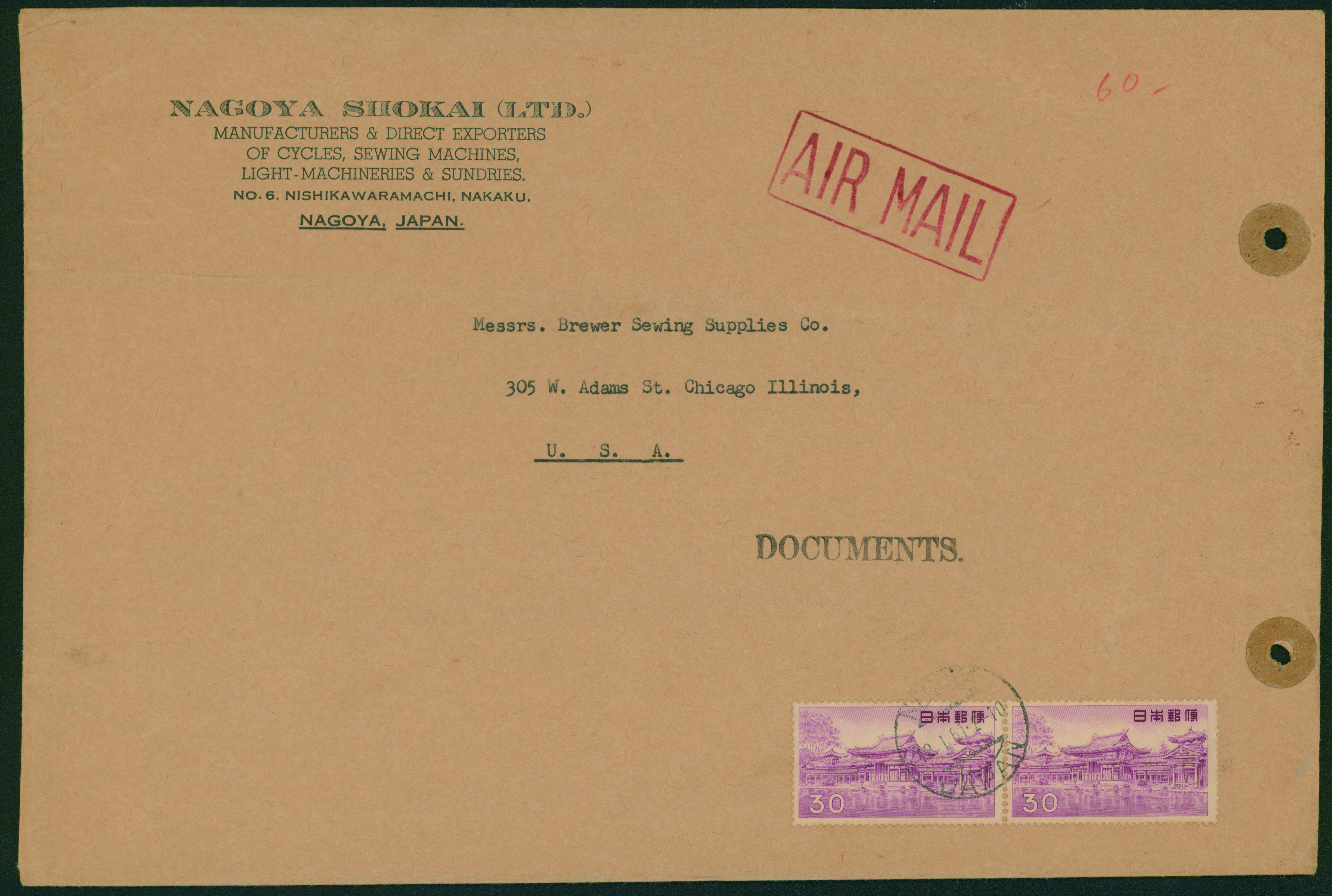 371 362(2P) image1952-1959 issue 30 Yen pair cancelled by roman letter sword cds 1961-01-12 NAGOYA airmail ,weight letter (Image1) (Image2) (All Images)