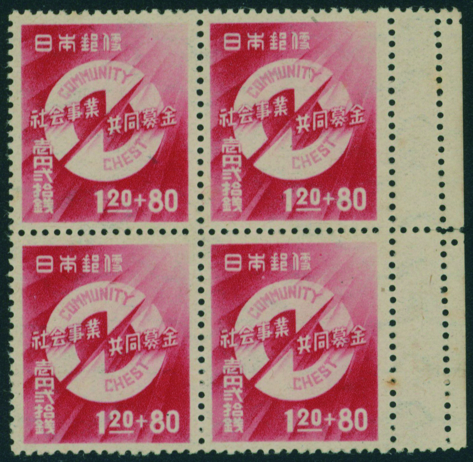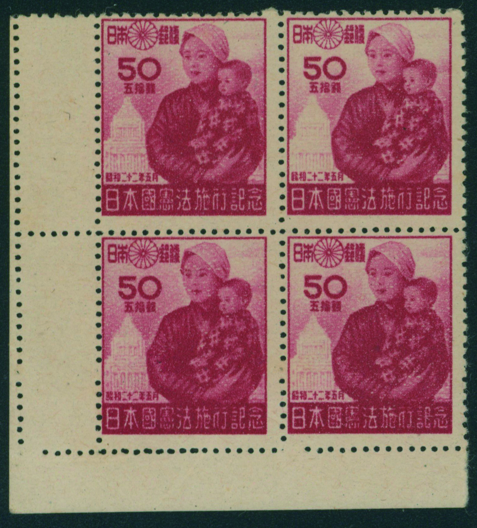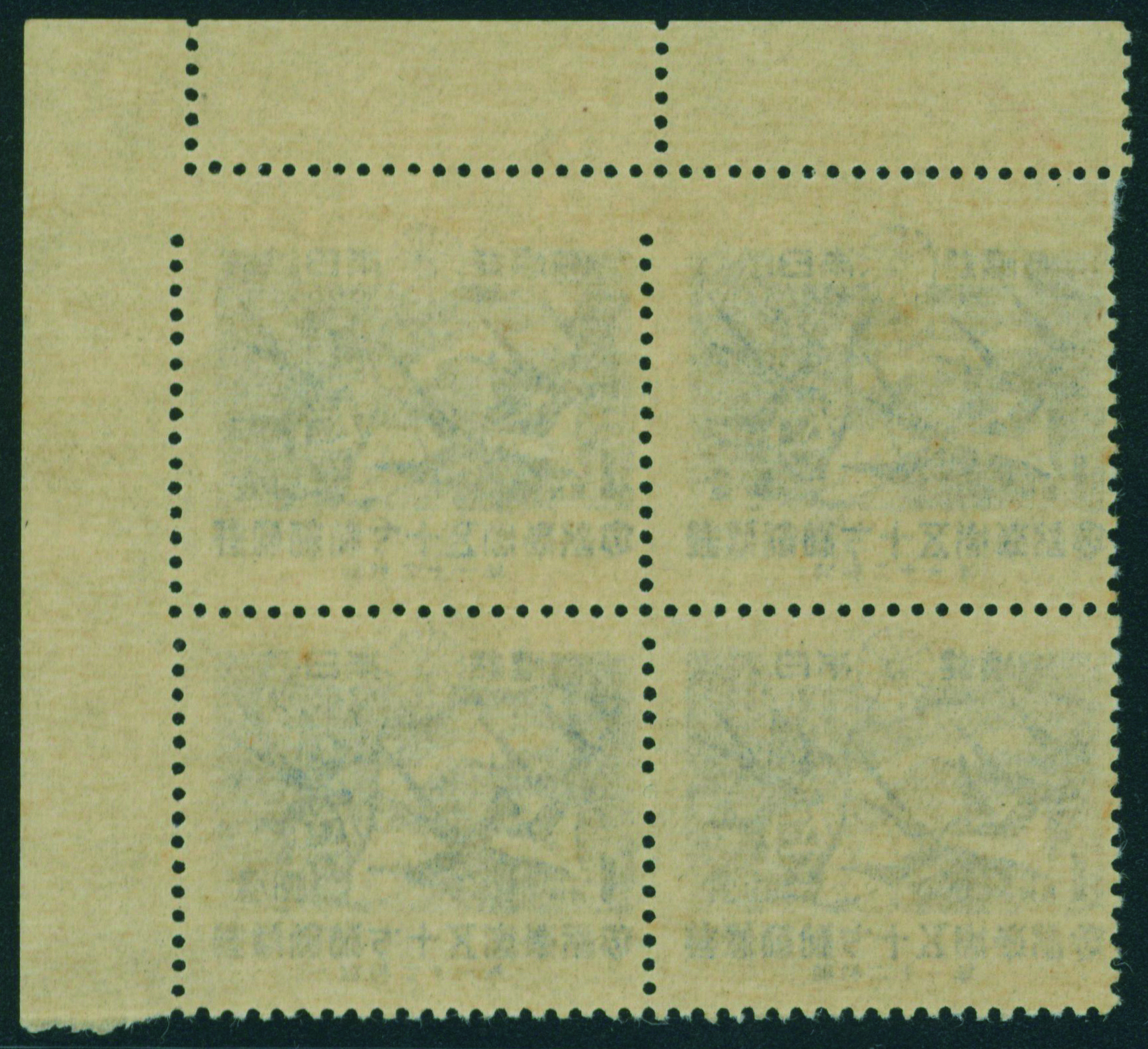 491 C102(4B) image1947 Commemorative stamp 50 Sen block(4) unused full original gum, excess perforation on the left margin (Image1) (Image2) (All Images)