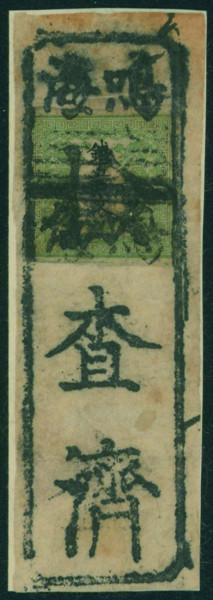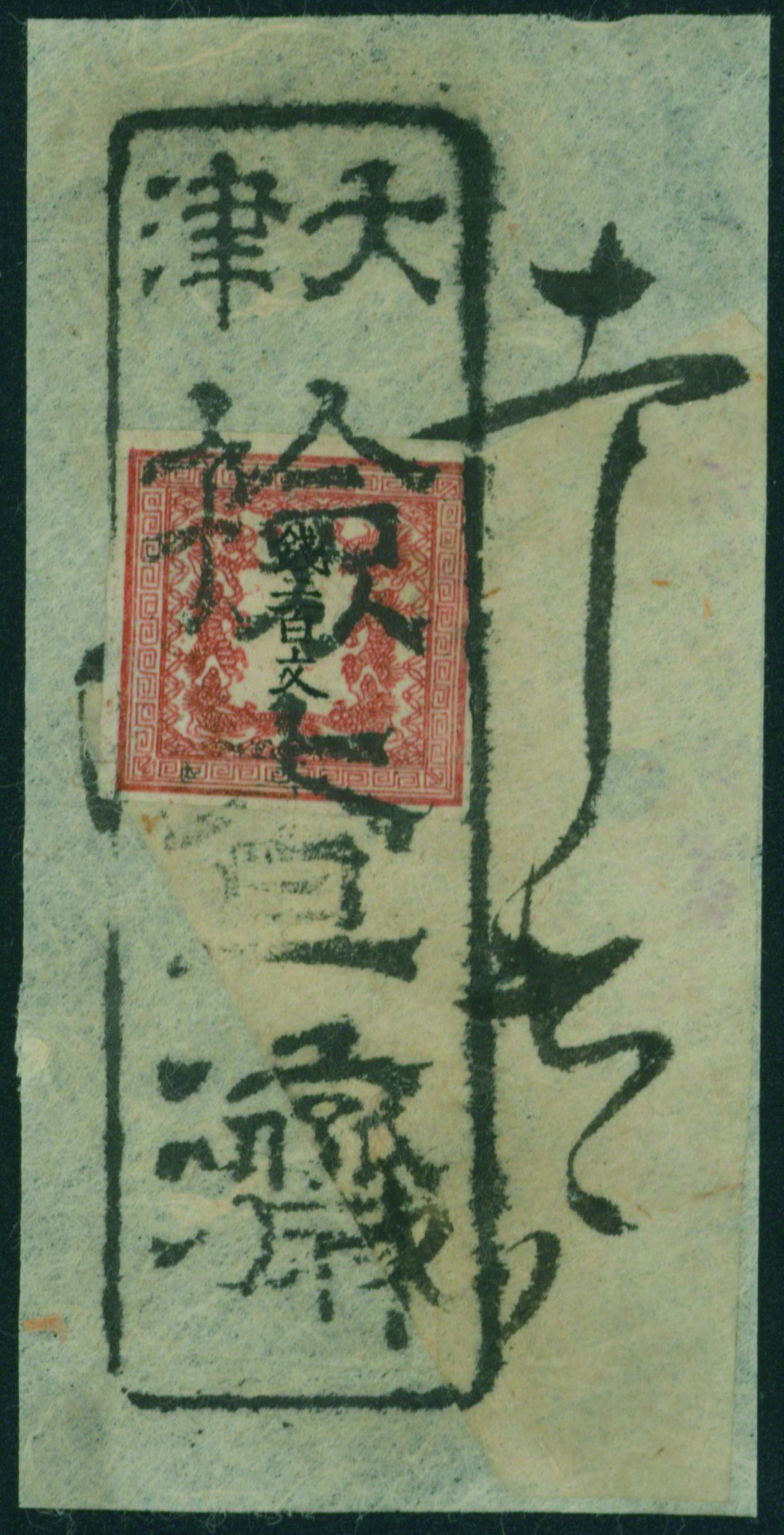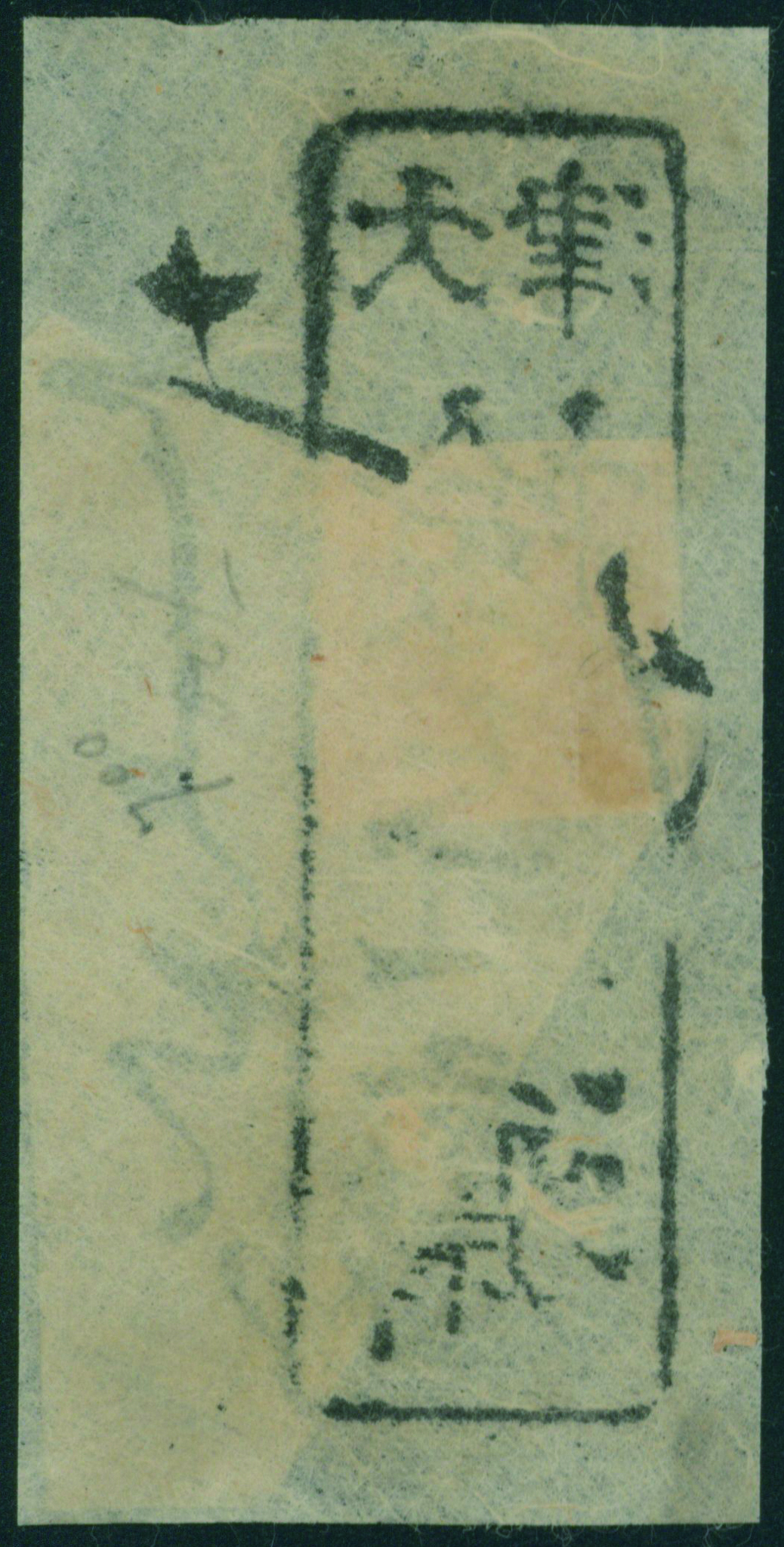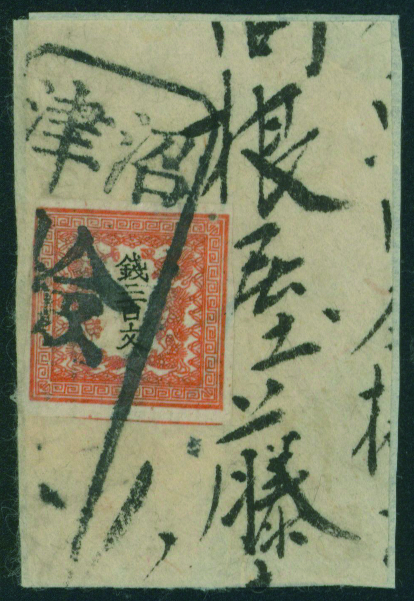 57 3 imageDragon 200 Mon pl.1 pos.31 re-engraved missing arm variety used cancelled by framed three letters cancellation with post-town name in Otsu on piece, (Image1) (Image2) (All Images)