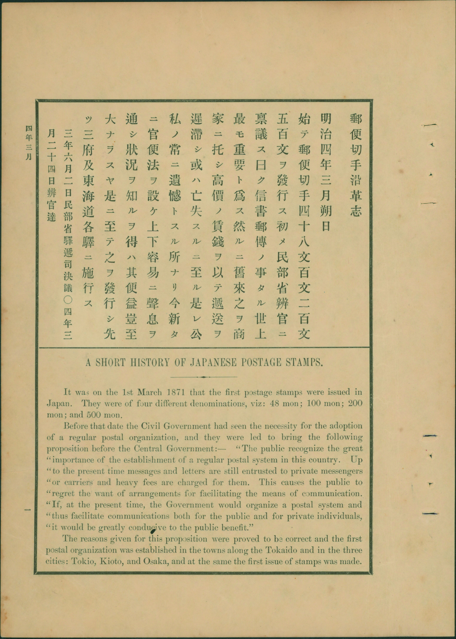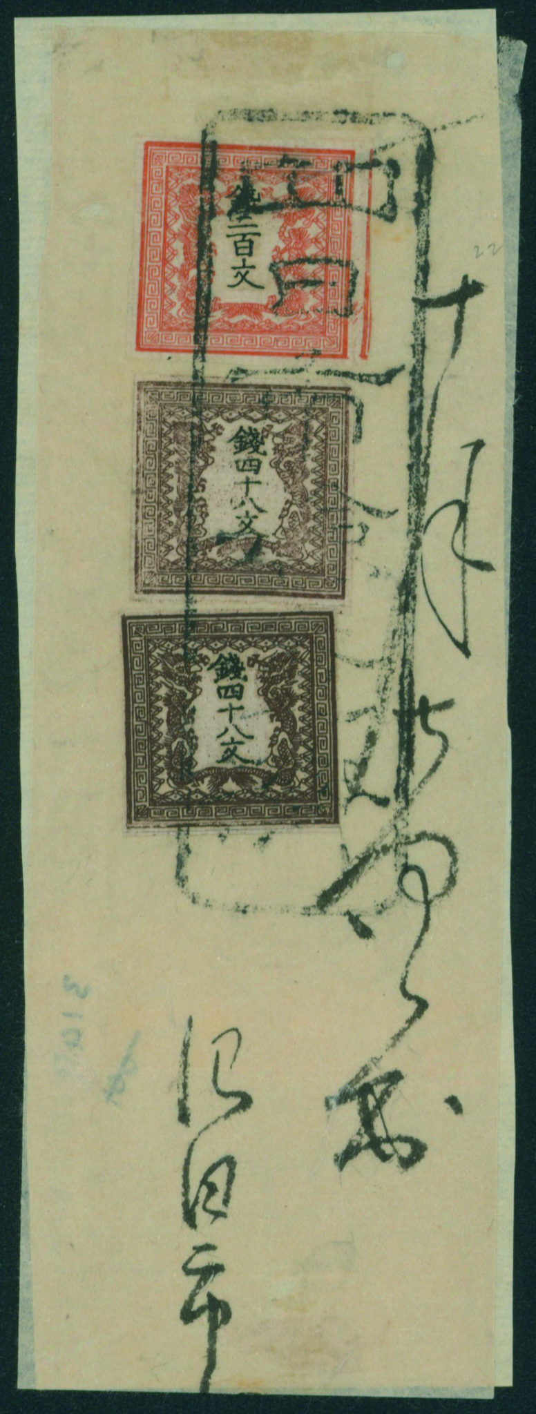 49 3(5S), 2(2P), imageDragon Stamp Nenuple franking, 1400 Mon rate, correctly paid used in the first year. Dragon 200 Mon pl.1 pos.1-9-17-25-33 strip(5) 100 Mon Pl.1 pos.9 39 25-33 cancelled by framed three letters cancellation with post-town name in TOKYO KENSA ZUMI 1871-09-10 Tokyo to Kyoto post box mark of YOKKAICHI post office gate folded paper, open cover, one 200 Mon is torn, pinhole and crease on a 100 Mon, another three 100 Mon have damages, the cover was affixed on another paper for support with two arrow seals (Image1) (Image2) (All Images)