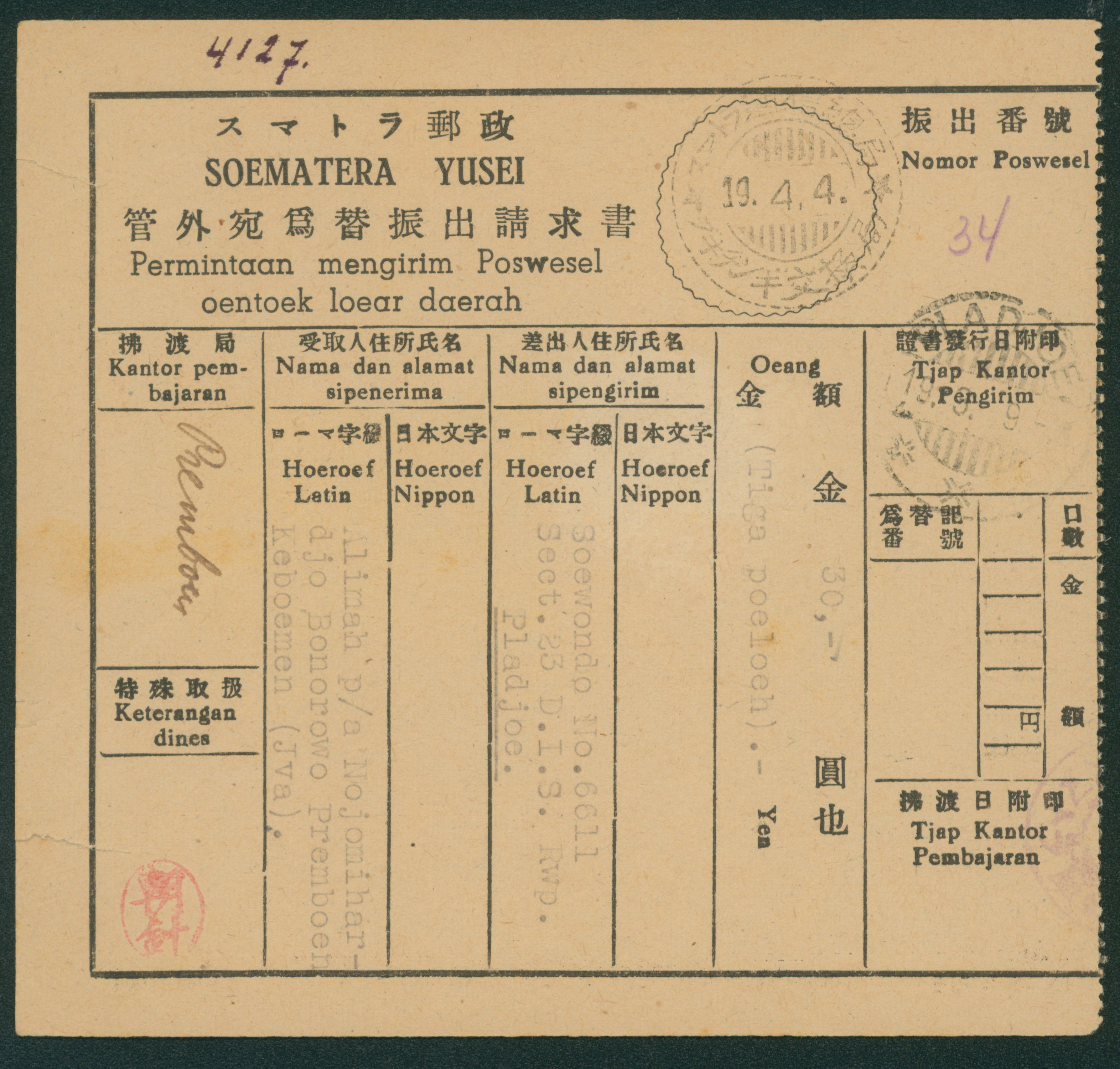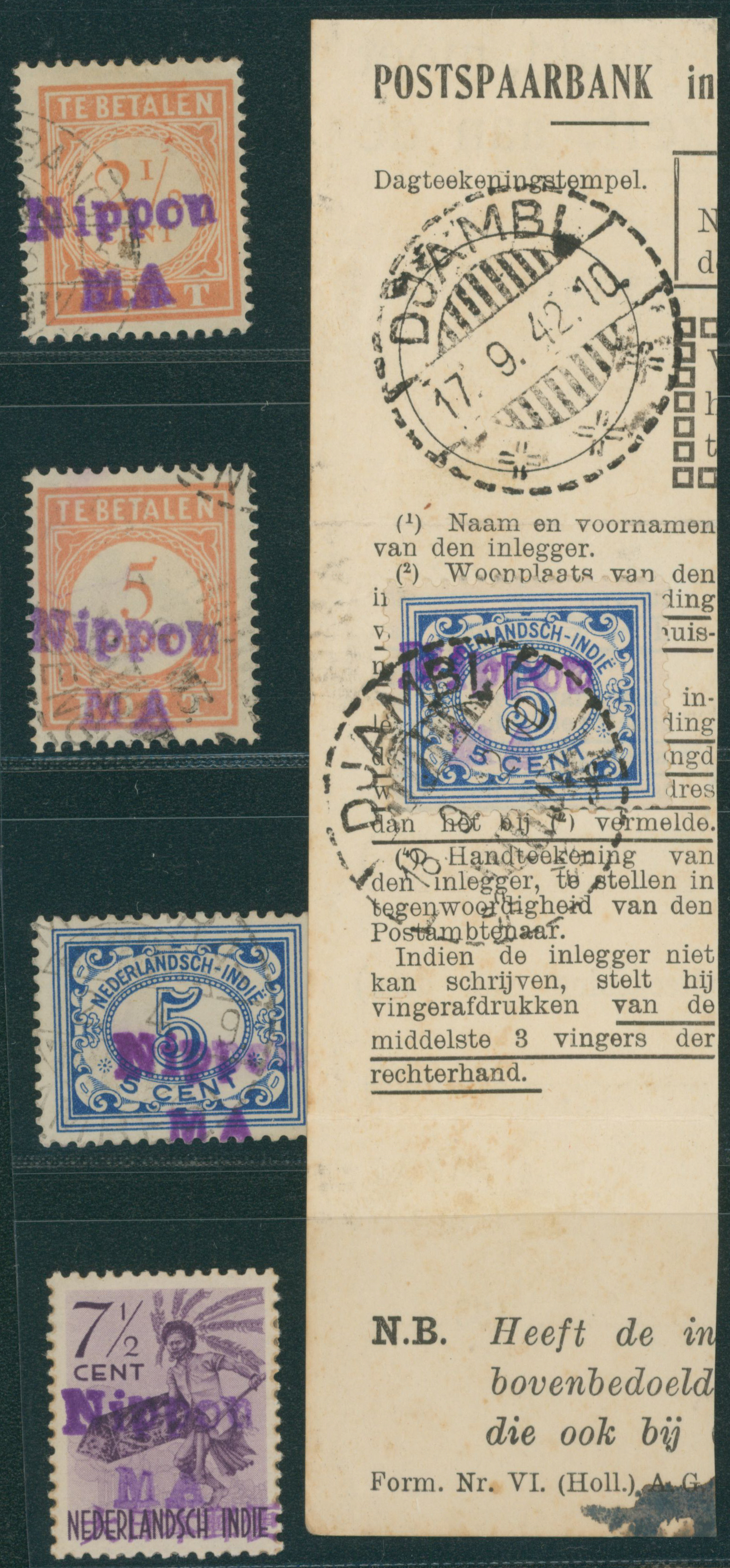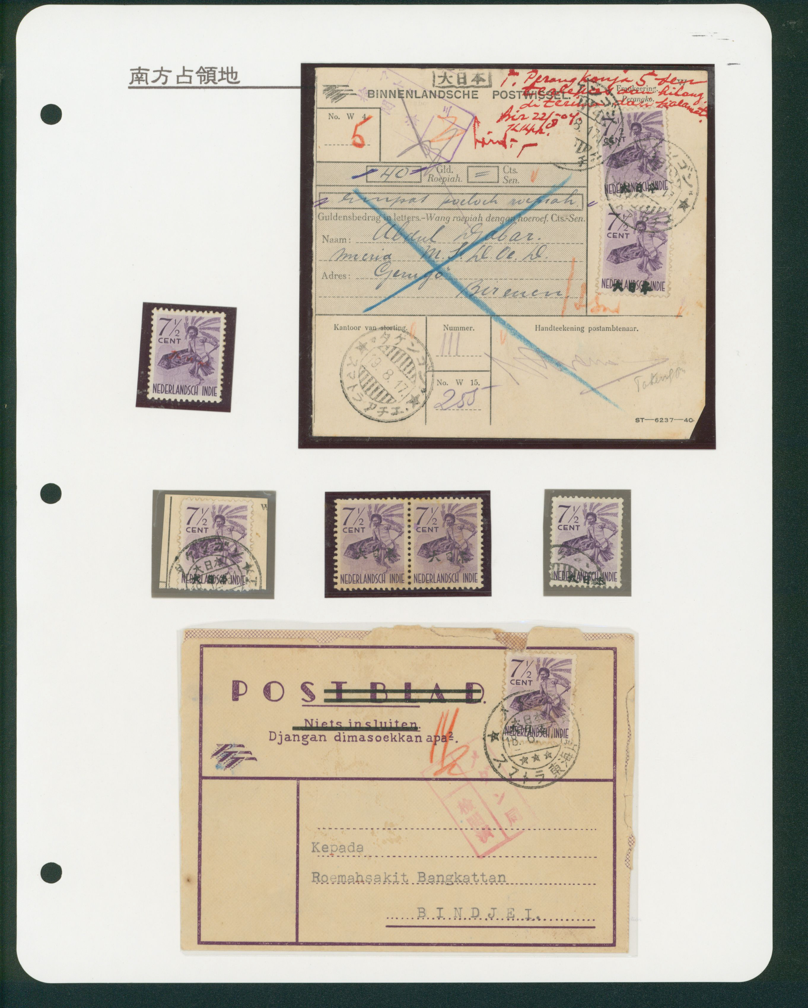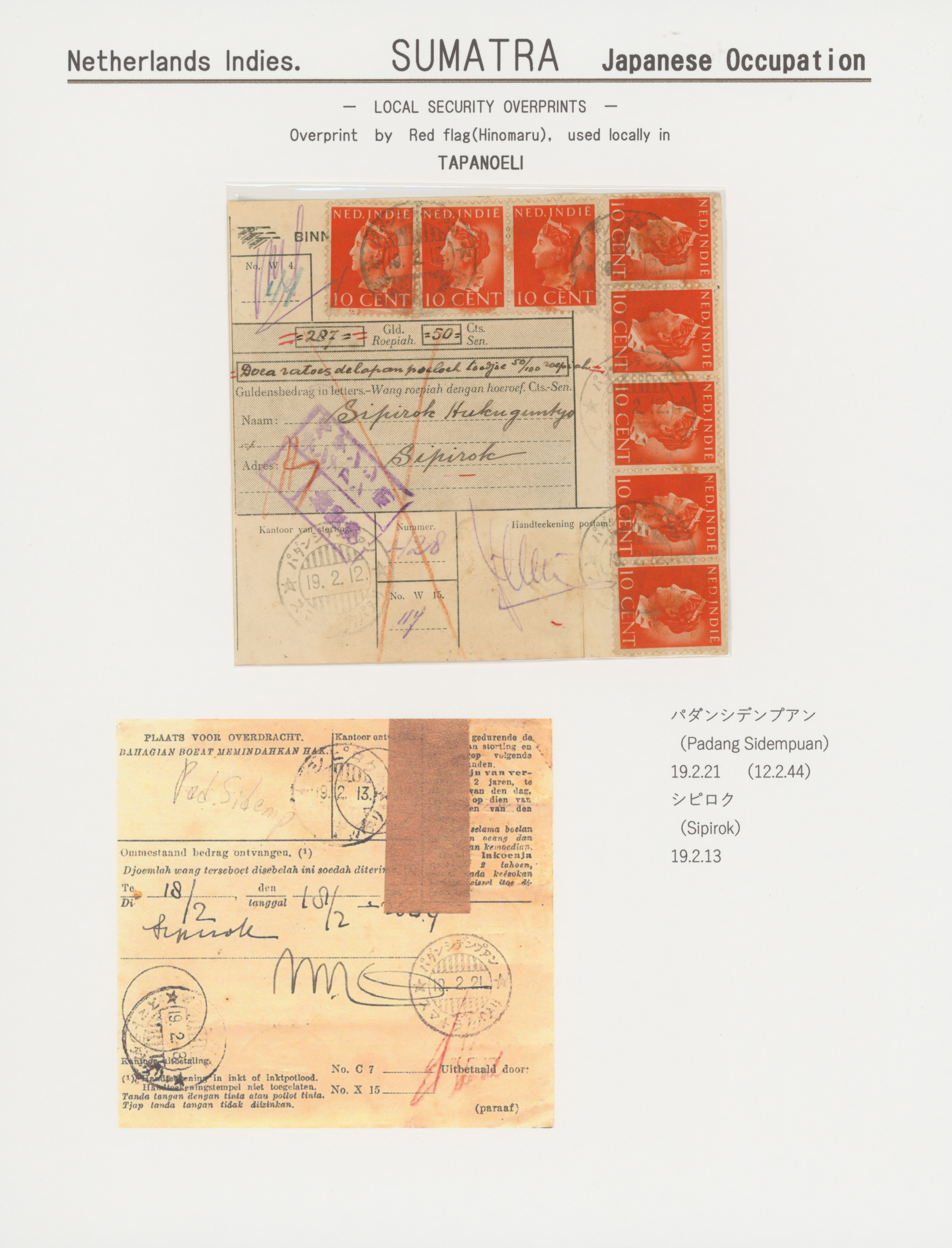 Ned. Indies Tapanoeli 10c *8 cancelled by datestamp 1944-02-12 Padang Sidempuan money order, censored (Image1)