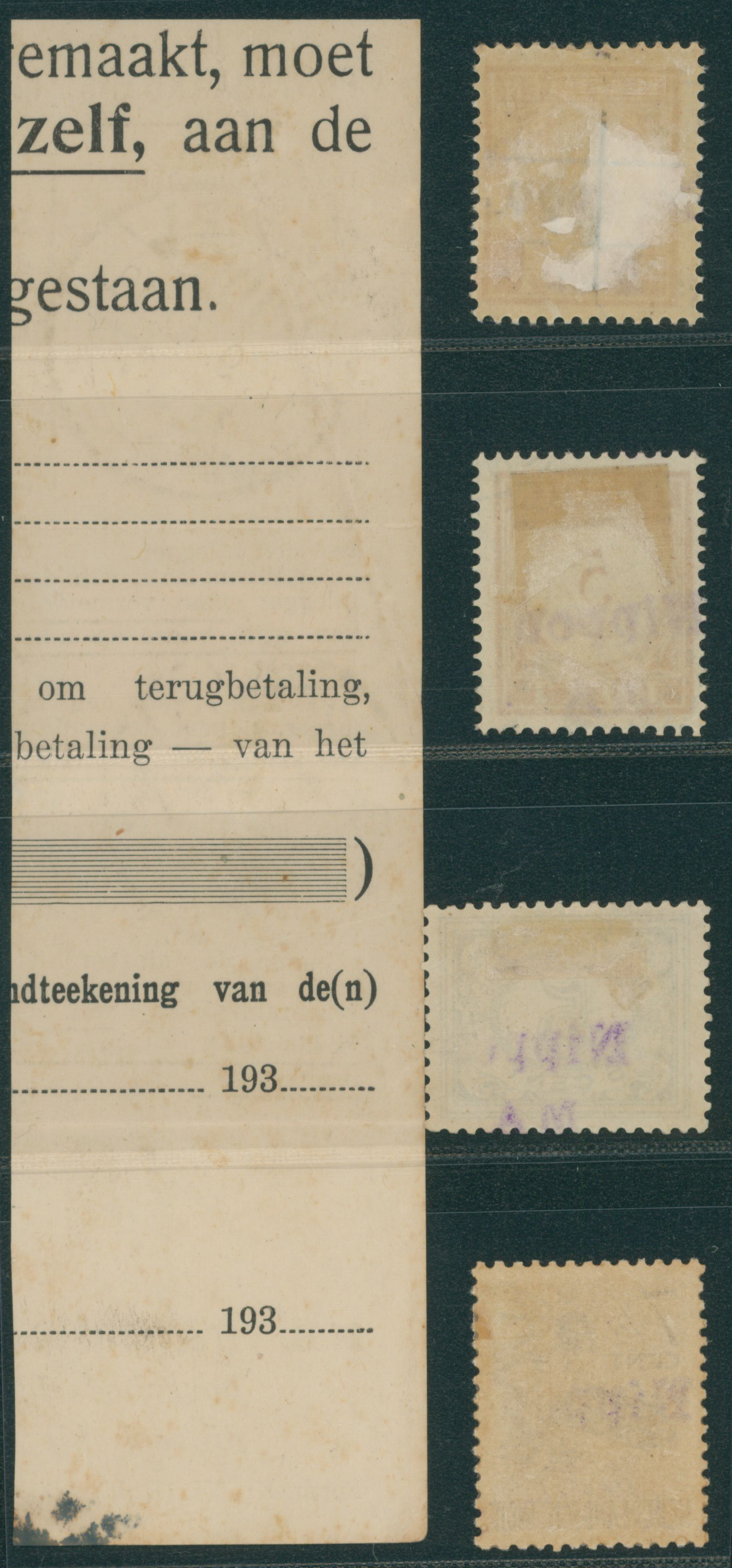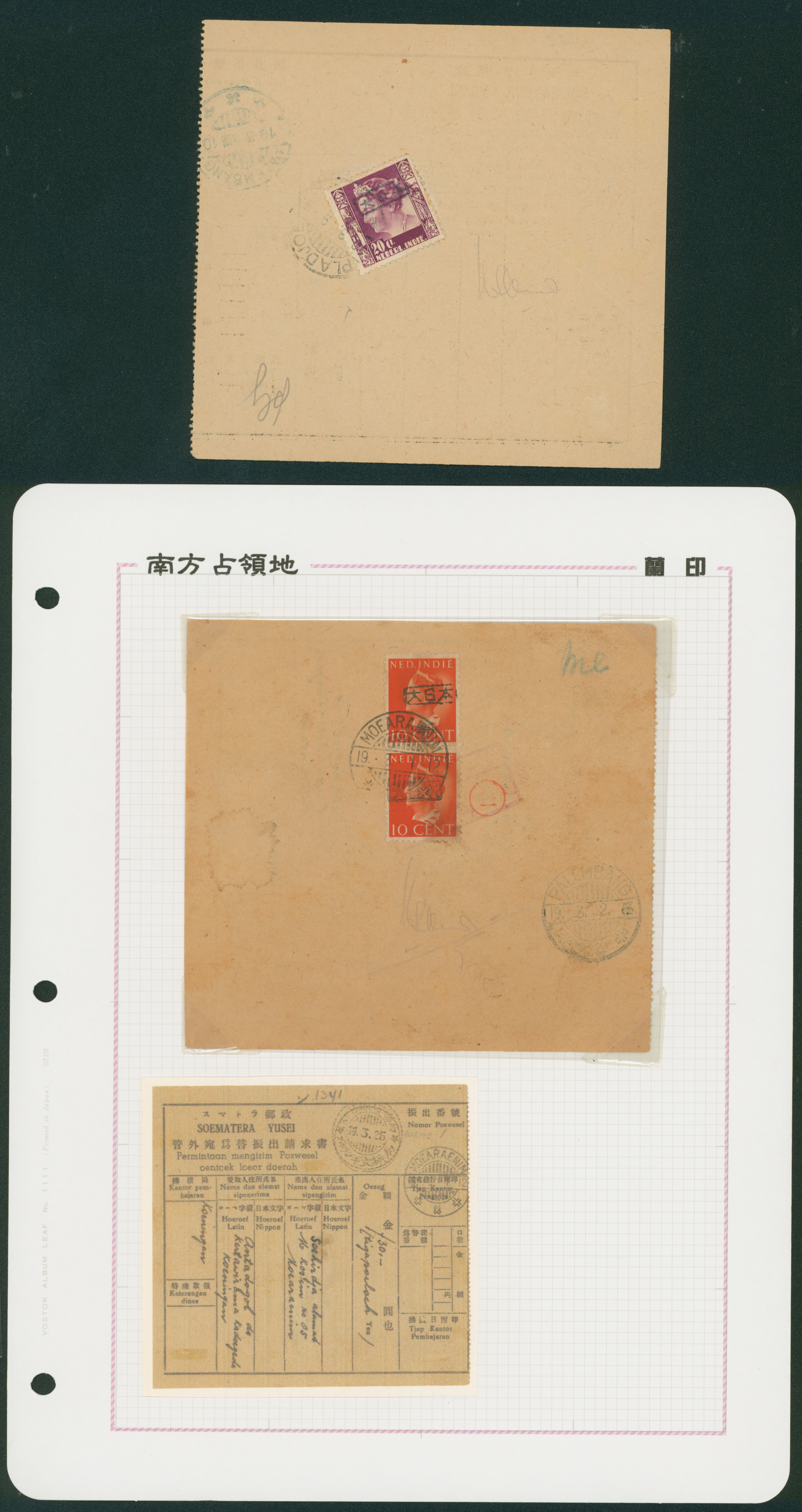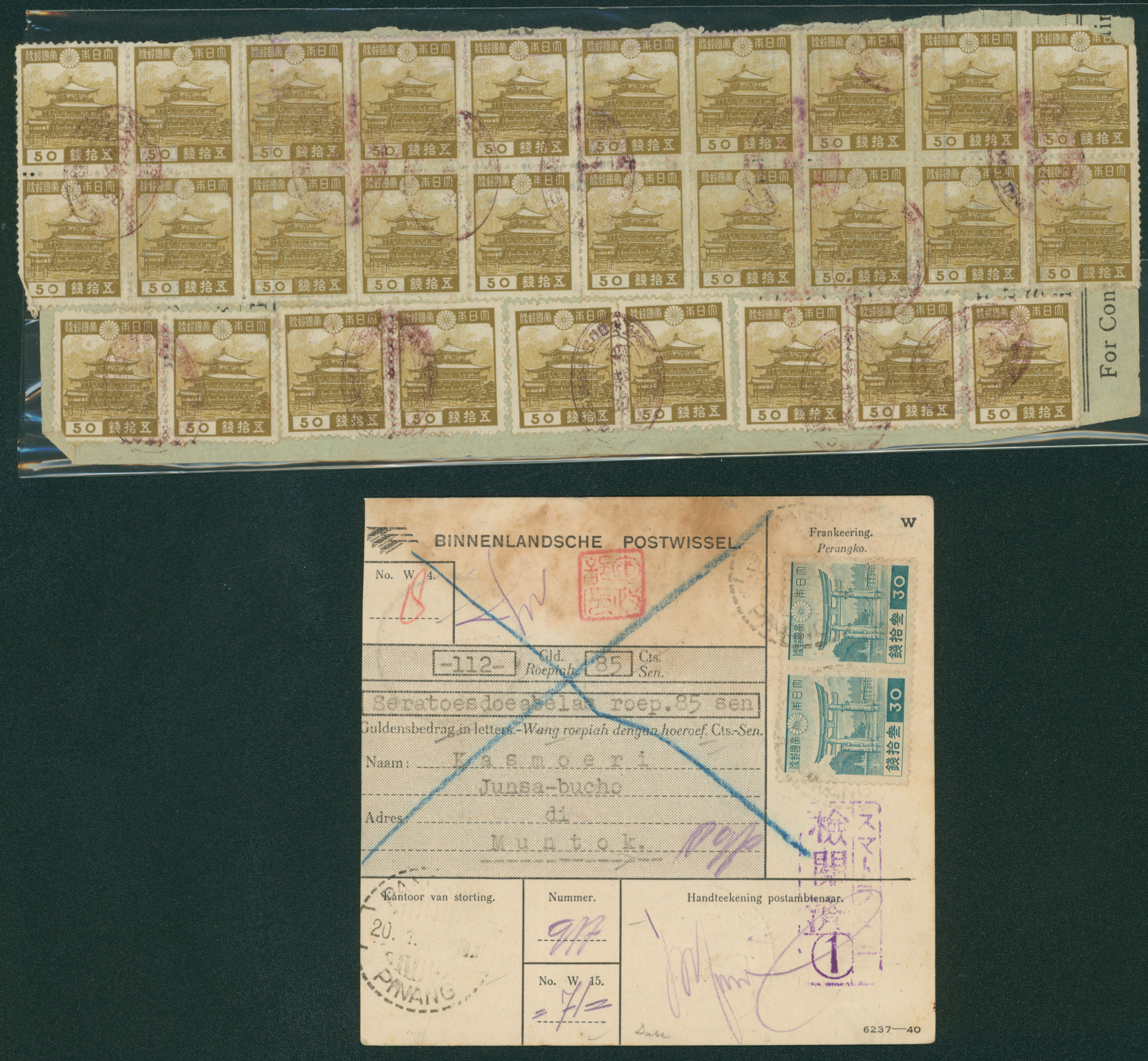 Ned. Indies Sumatra 1937-1940 issue 30 Sen, 50 Sen revenue, money order usages (Image1) (Image2)