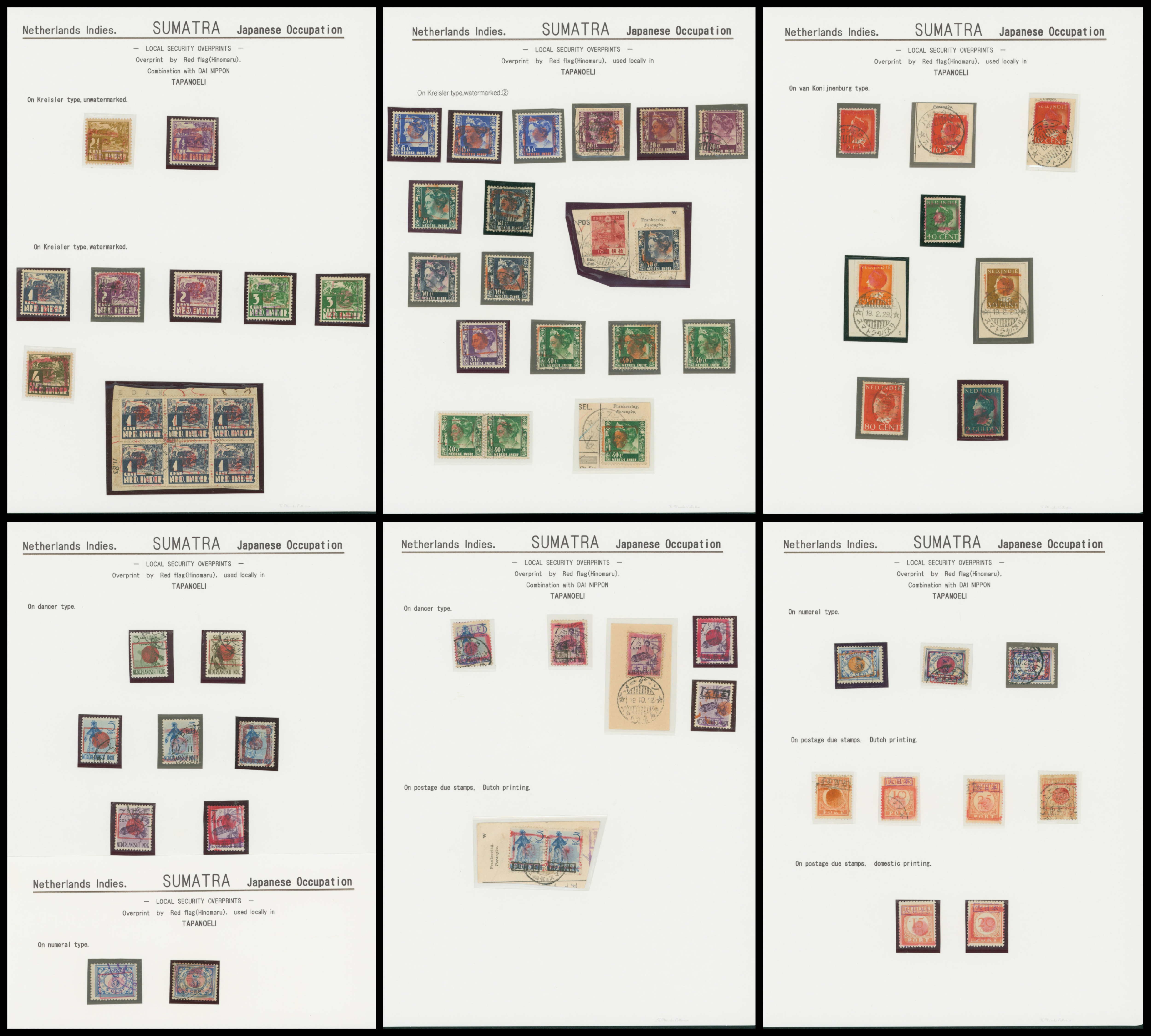Ned. Indies Sumatra Tapanoeli 6 leaves, 60 stamps mixed condition of unused and used, well collected,
