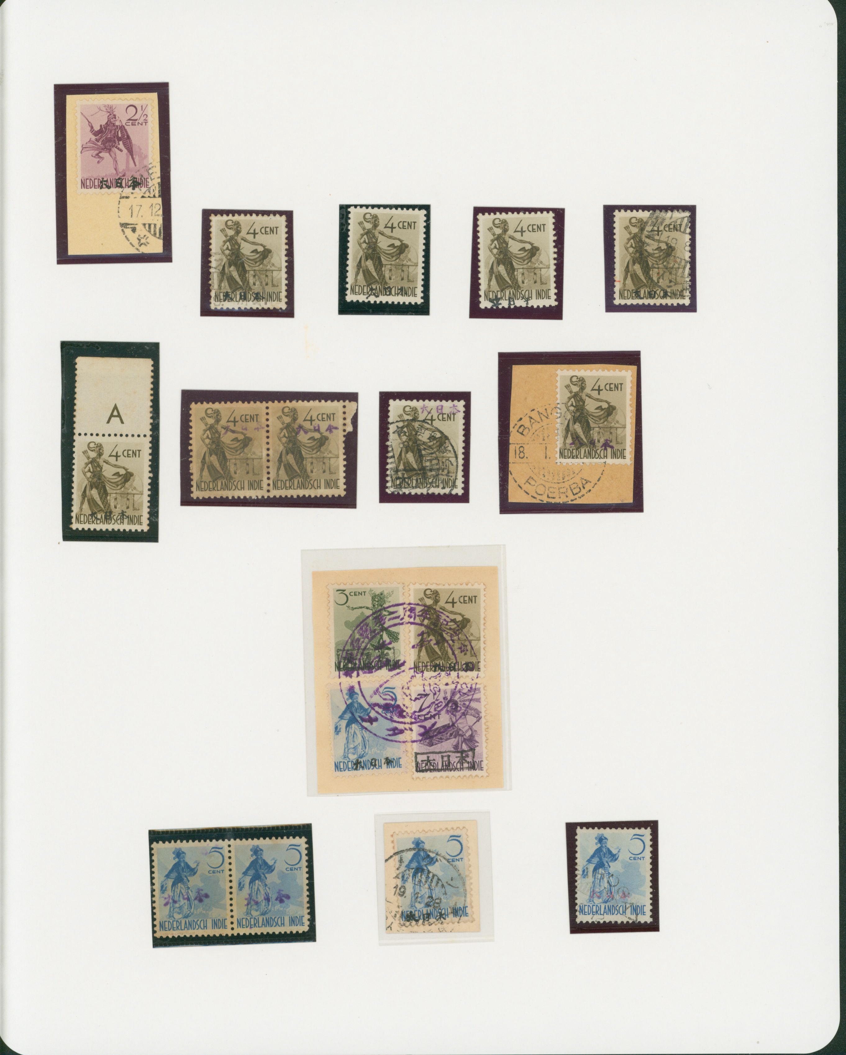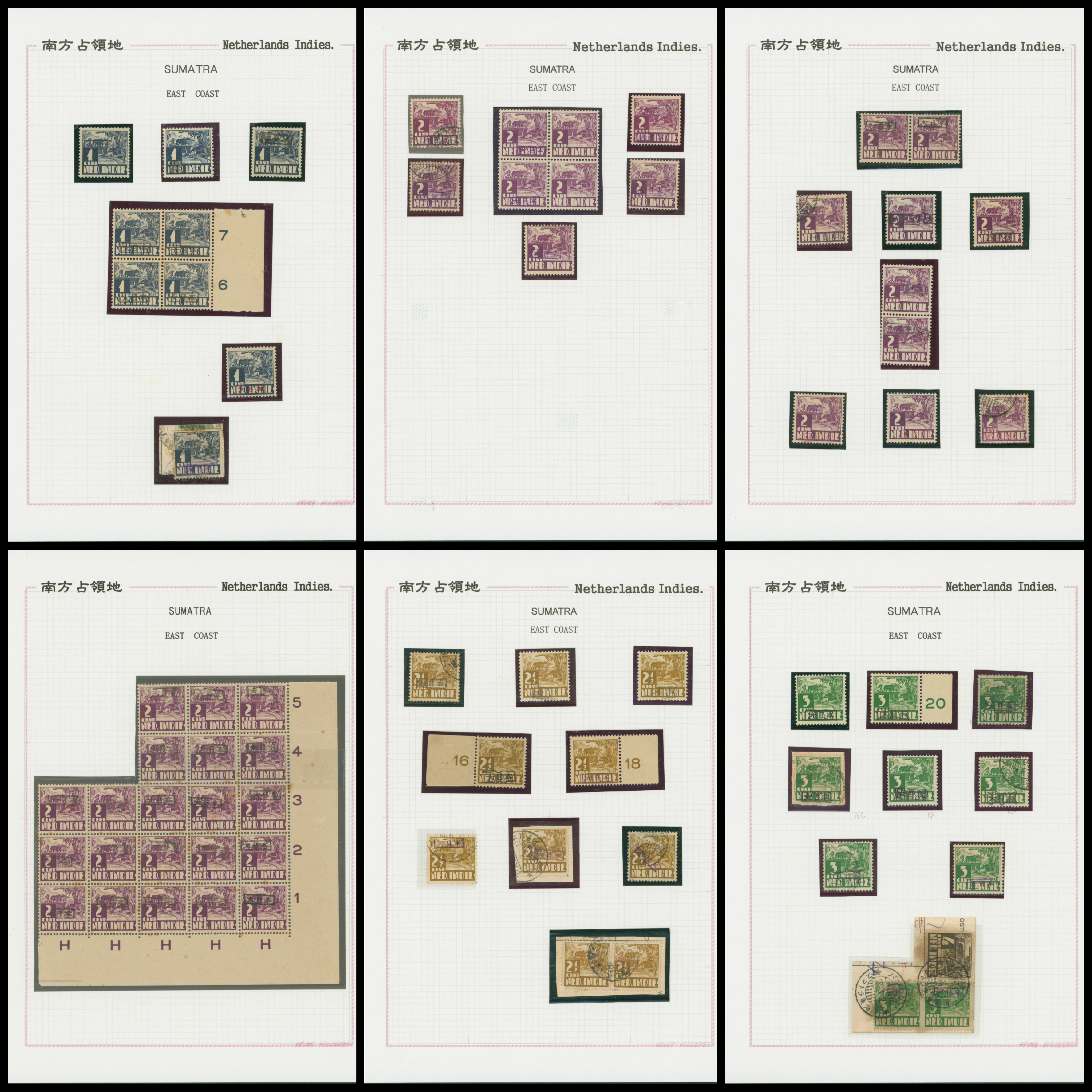 Ned. Indies Sumatra East Coast 4 leaves, 35 stamps mixed condition of unused and used, (Image1) (Image2)