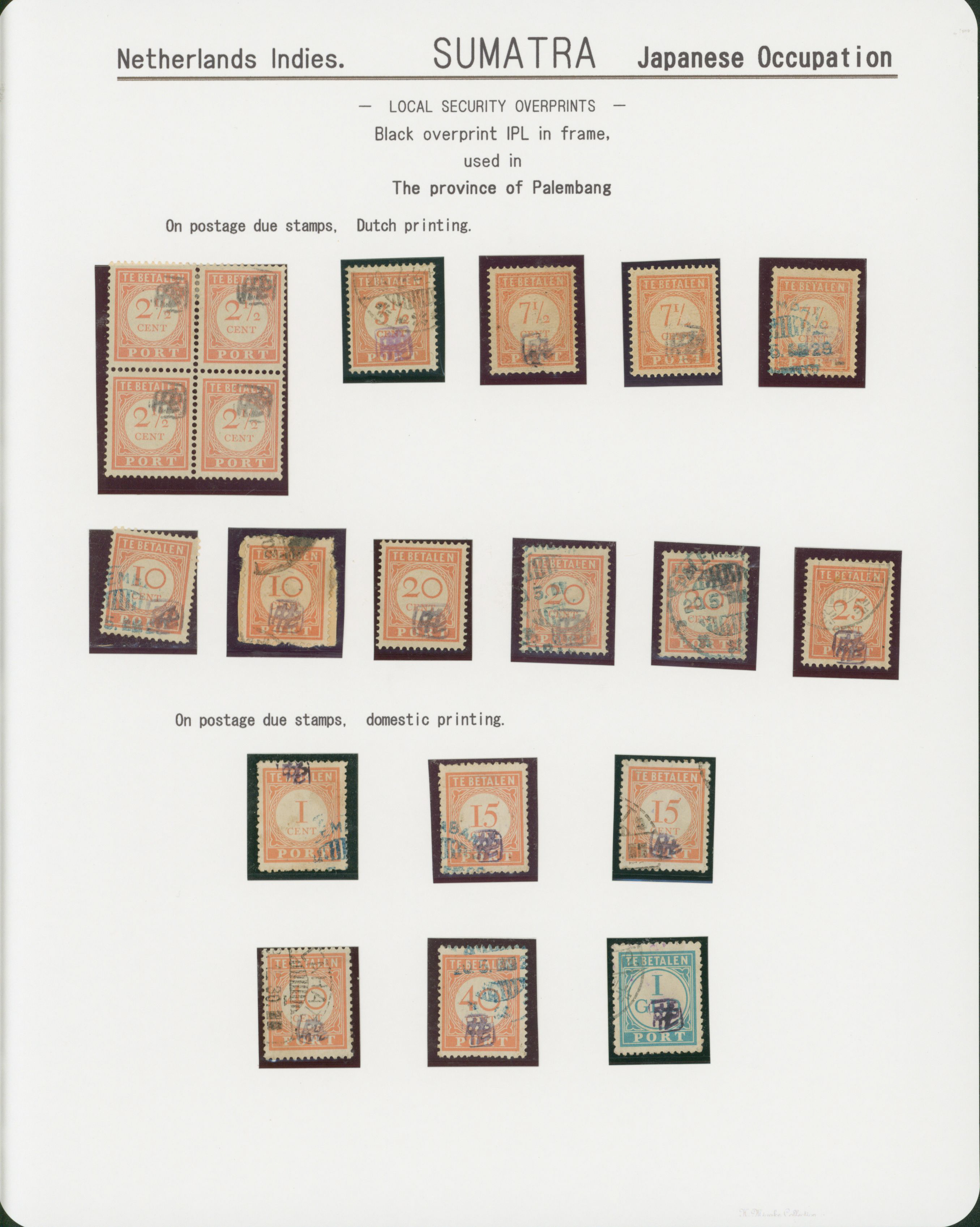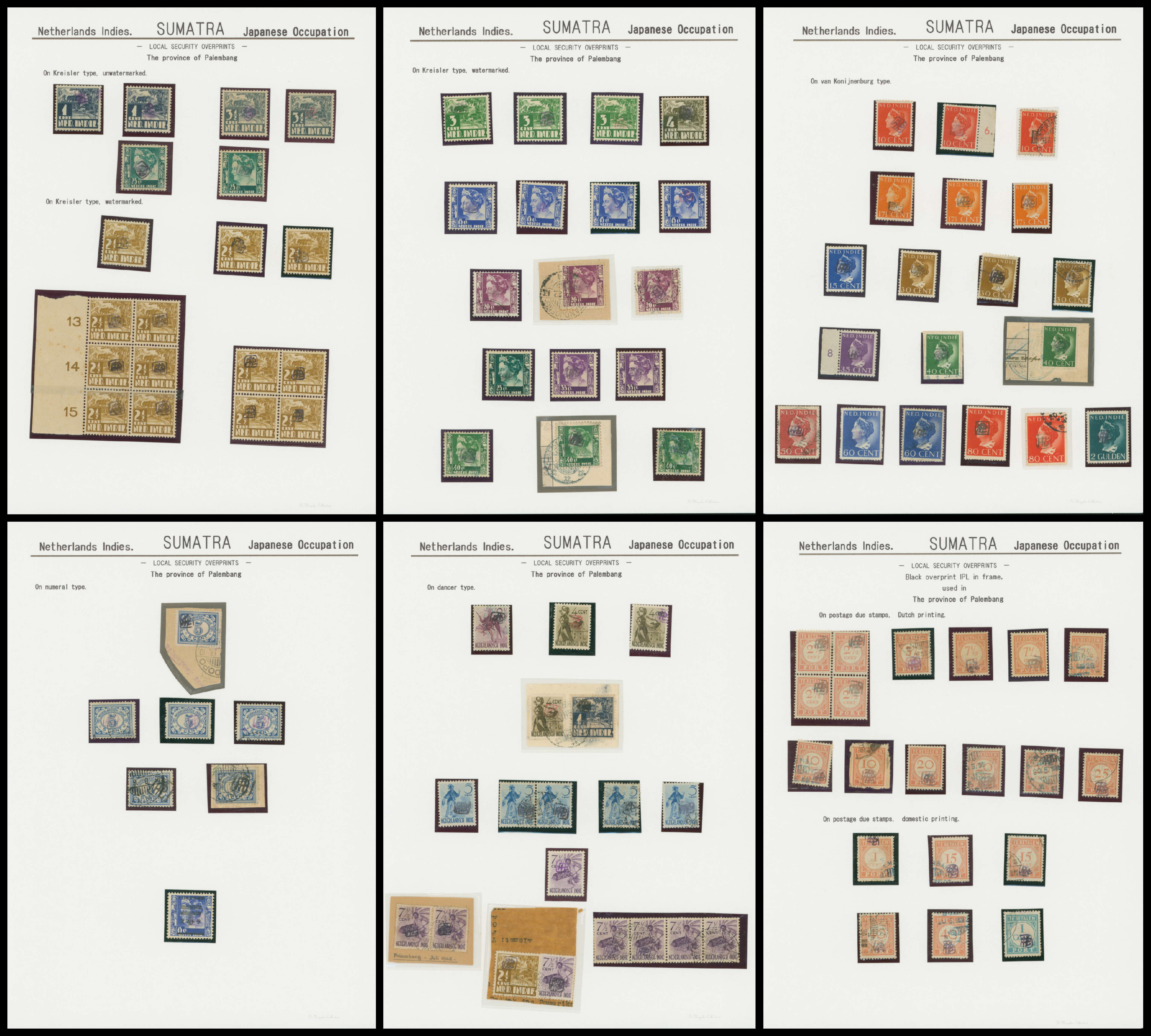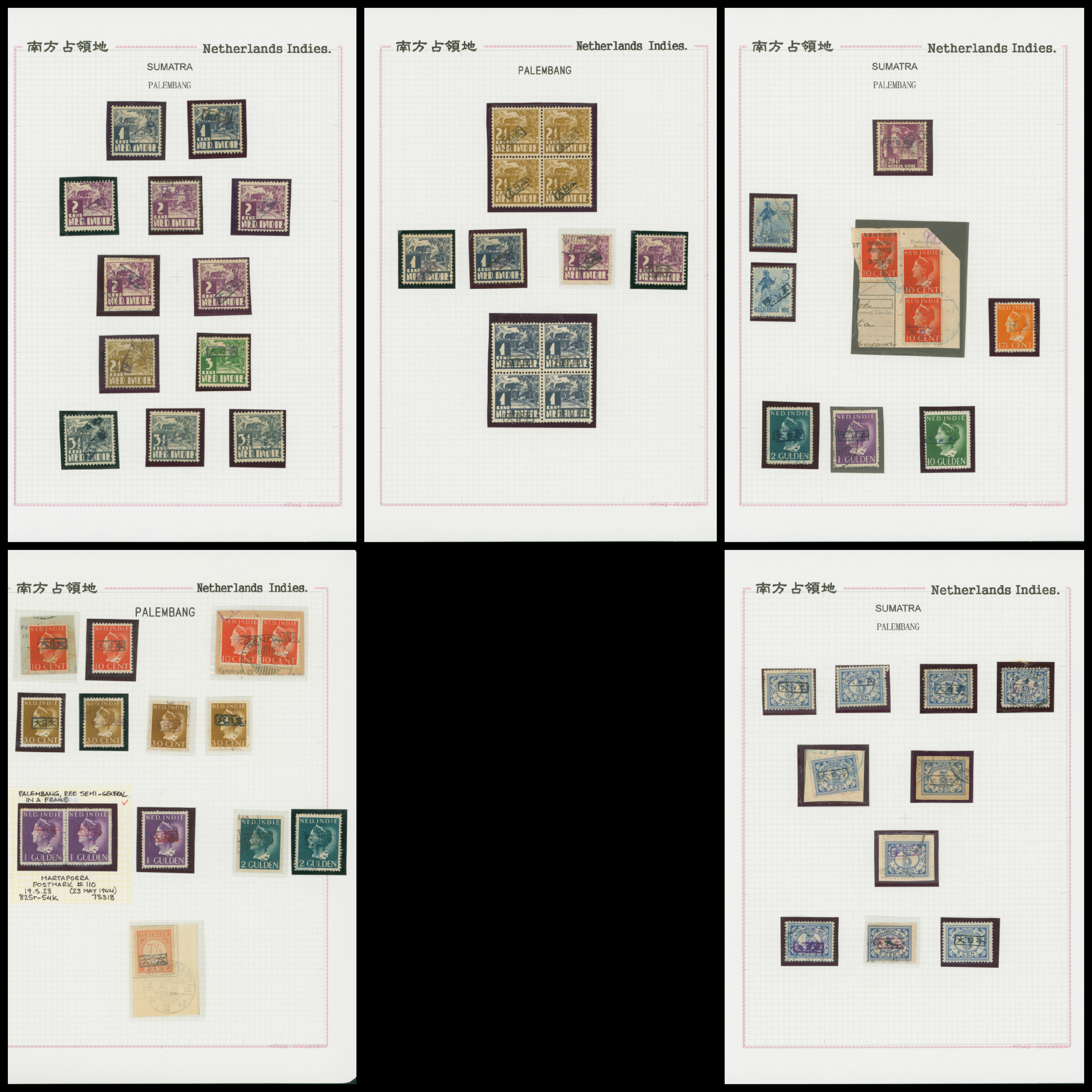Ned. Indies Sumatra Palembang IPL 6 leaves, 100 stamps mixed condition of unused and used, including