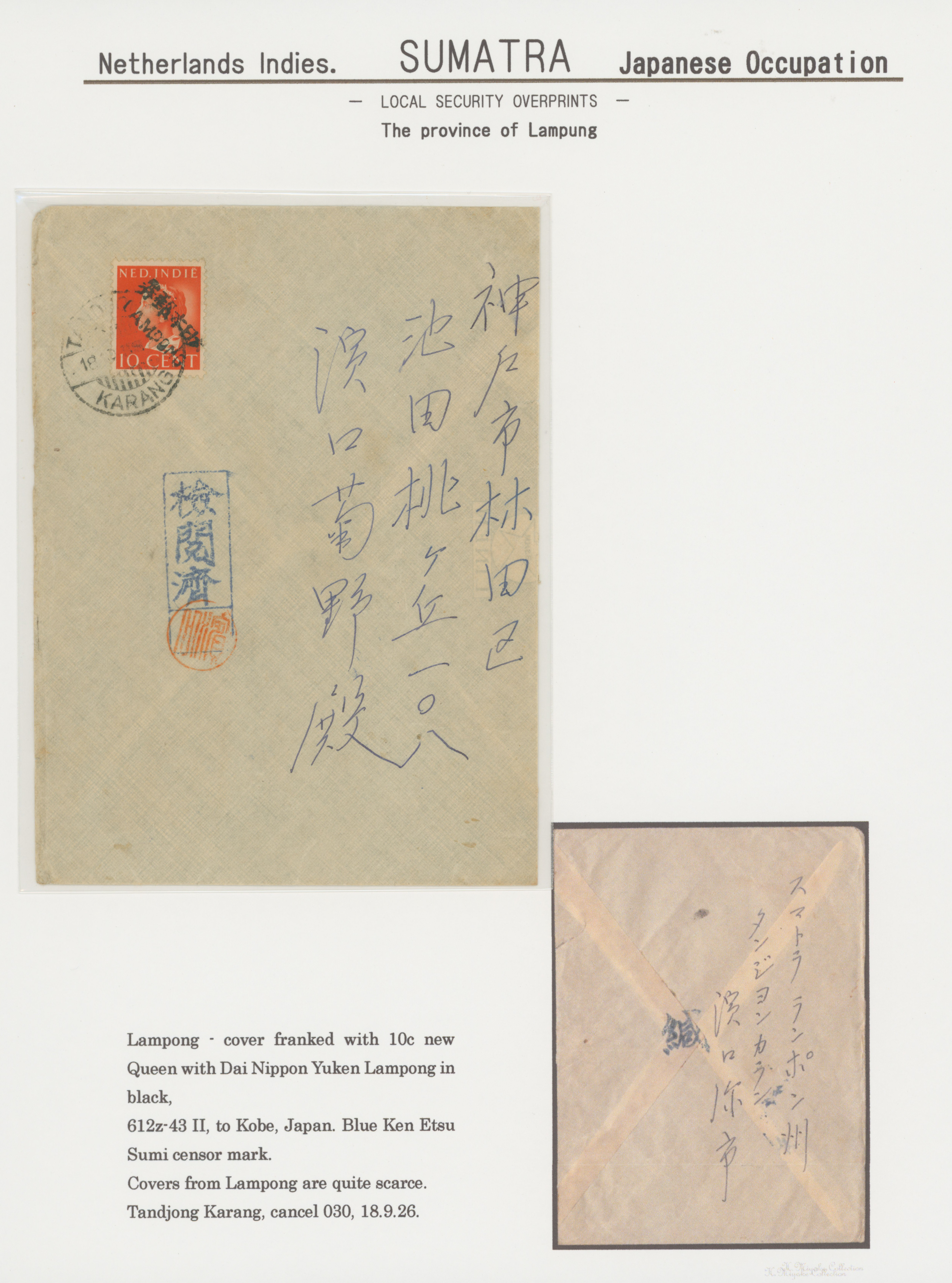 643 10S10 imageNed. Indies Lampong 10c single franking 1943-09-26 TANDJONG KARANG to Kobe letter, good condition, censored (Image1)
