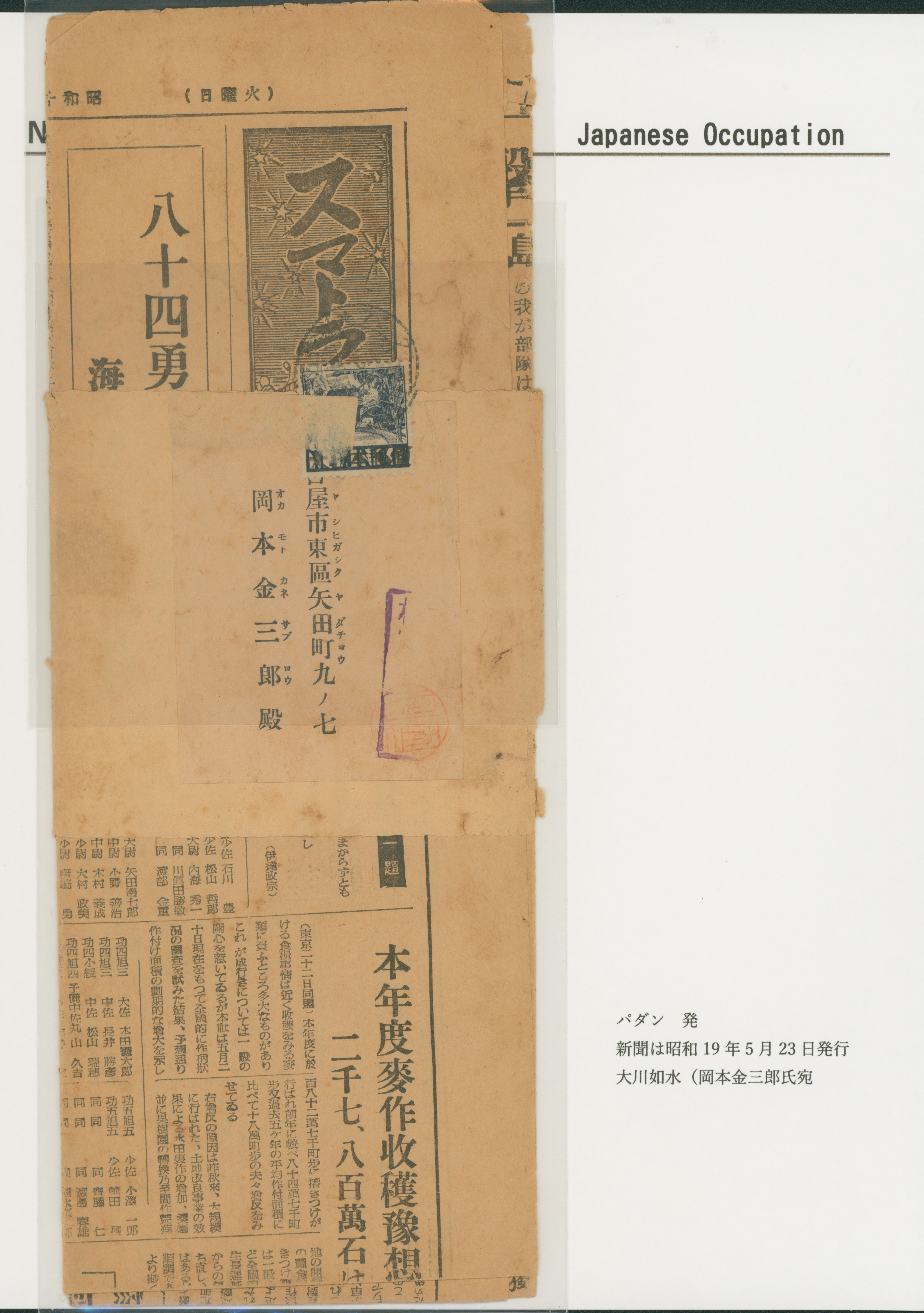 648 4S151 imageNed. Indies Sumatra Sumatra news, 1944-5-23 issue single franking Agriculture 1 Cent cancelled by datestamp Padang to Nagoya wrapper, censored (Image1)