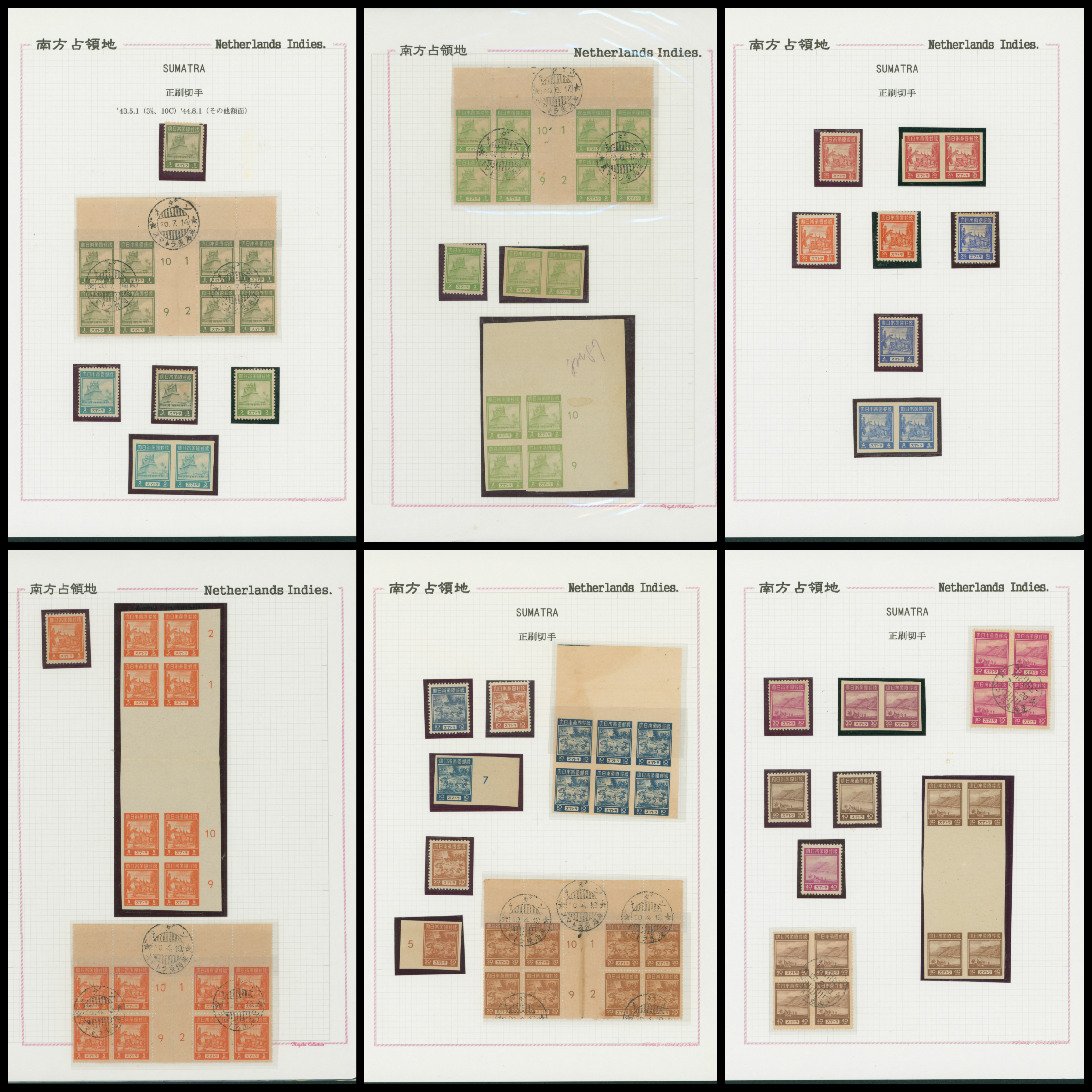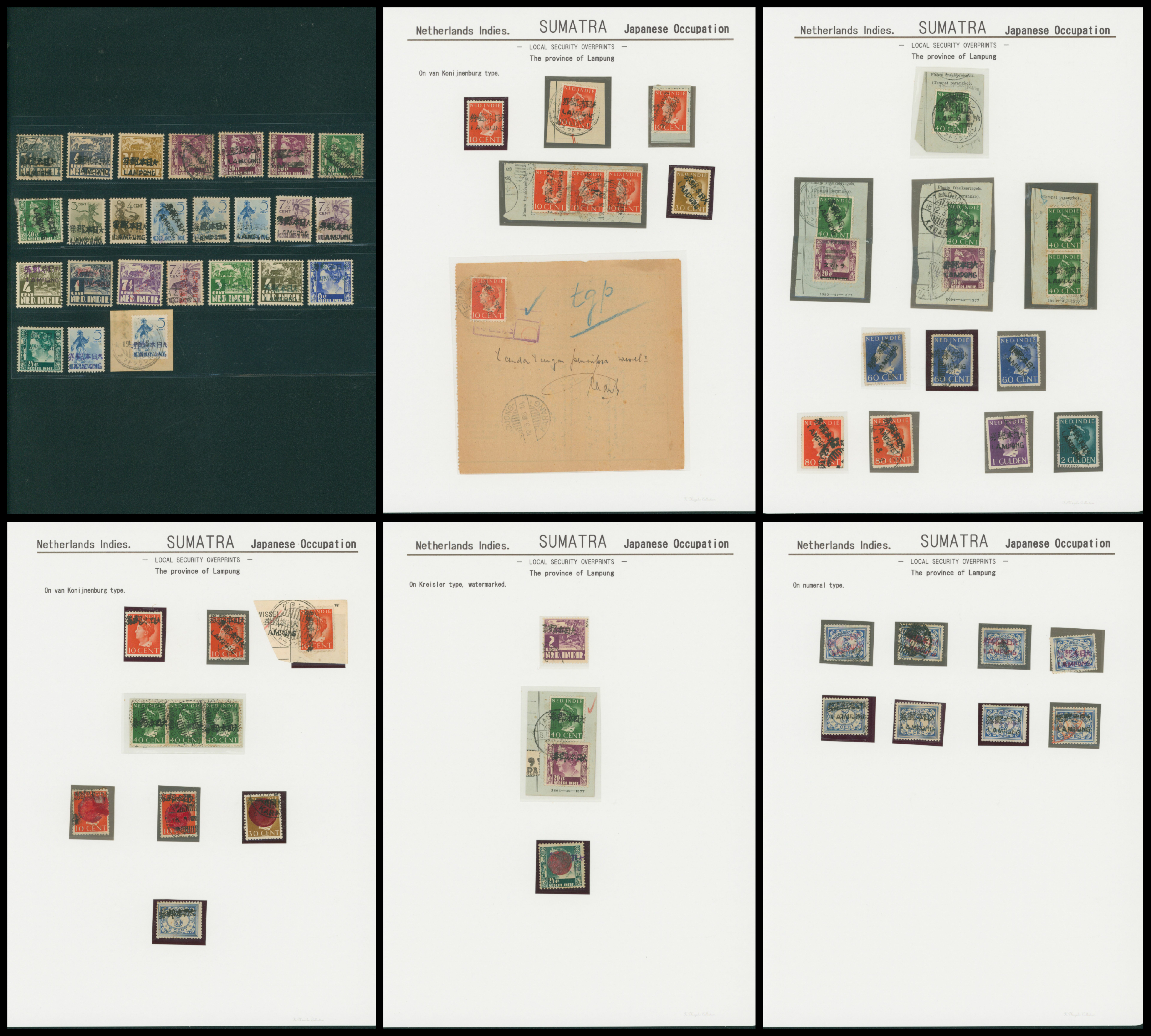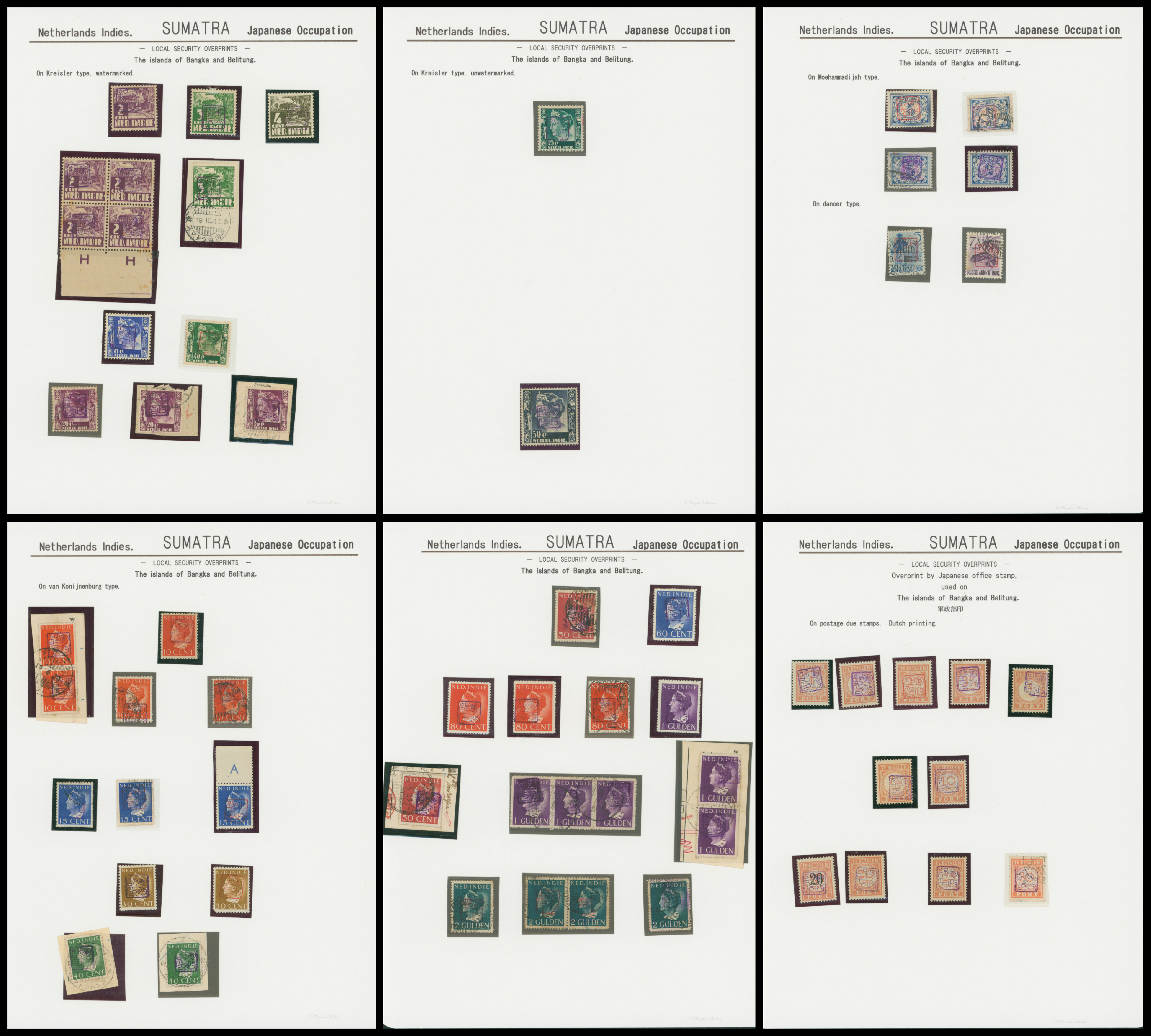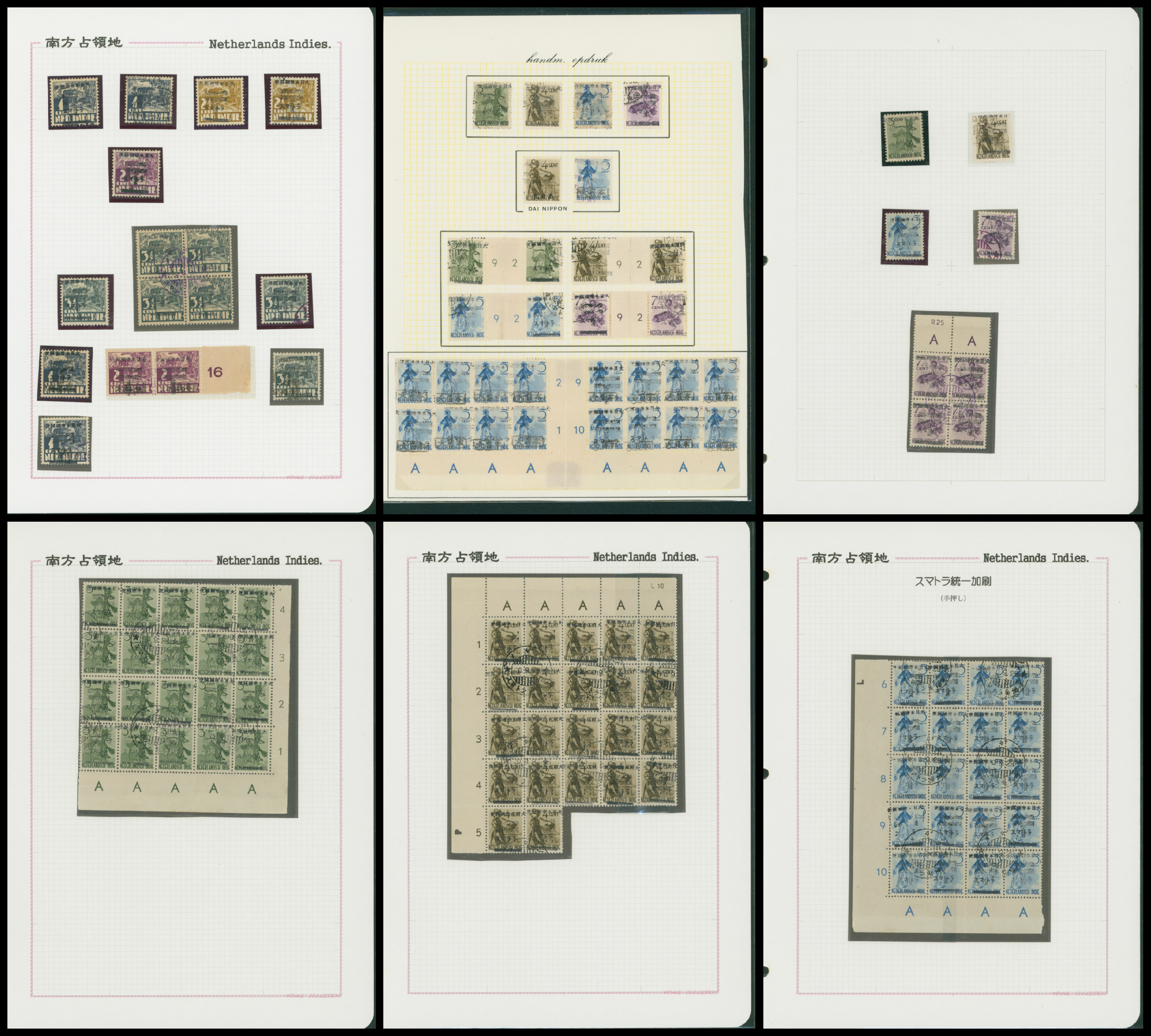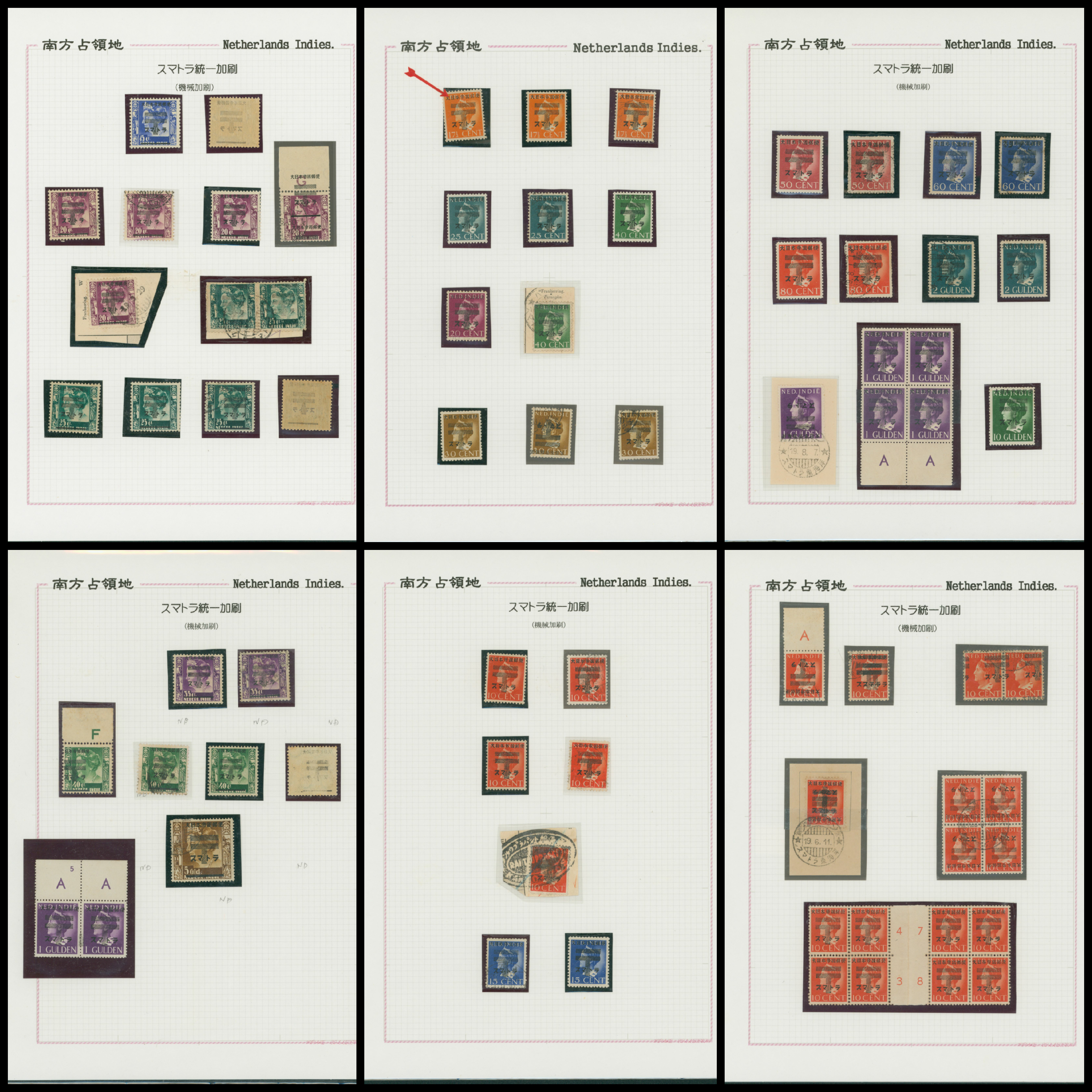 652   imageNed. Indies Sumatra Unification Overprint 6 leaves, 70 stamps unused used including shifted overprint, offset, and inverted ovpt. varieties (Image1) (Image2) (Image3) (Image4) (Image5) (Image6) (Image7) (All Images)