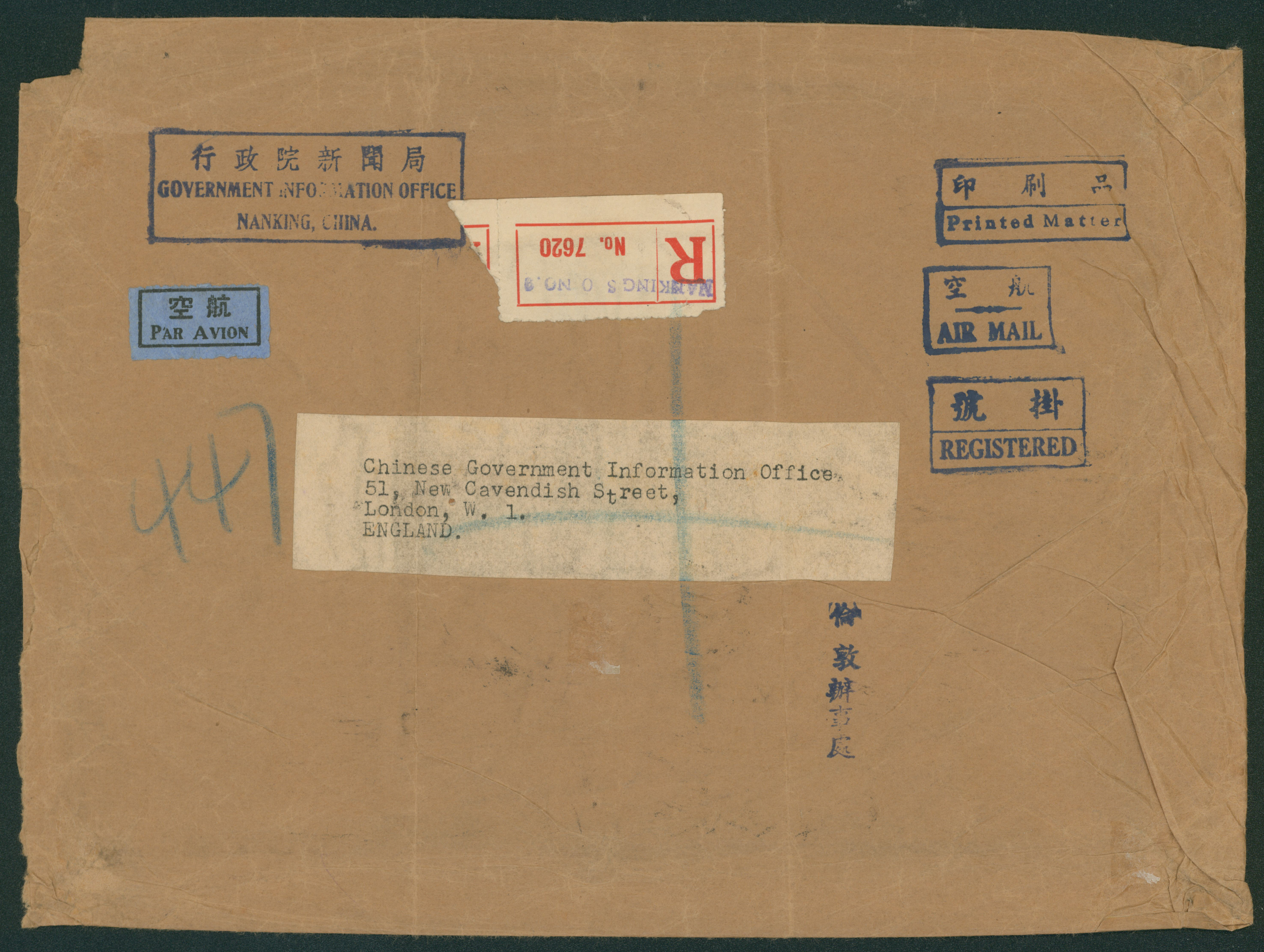 686   imageChina 39 SYS stamps attached. cancelled by datestamp in black 1947-12-25 Nanking to GB transit :Shanghai airmail , registered,weight letter printed matter (Image1) (Image2) (All Images)