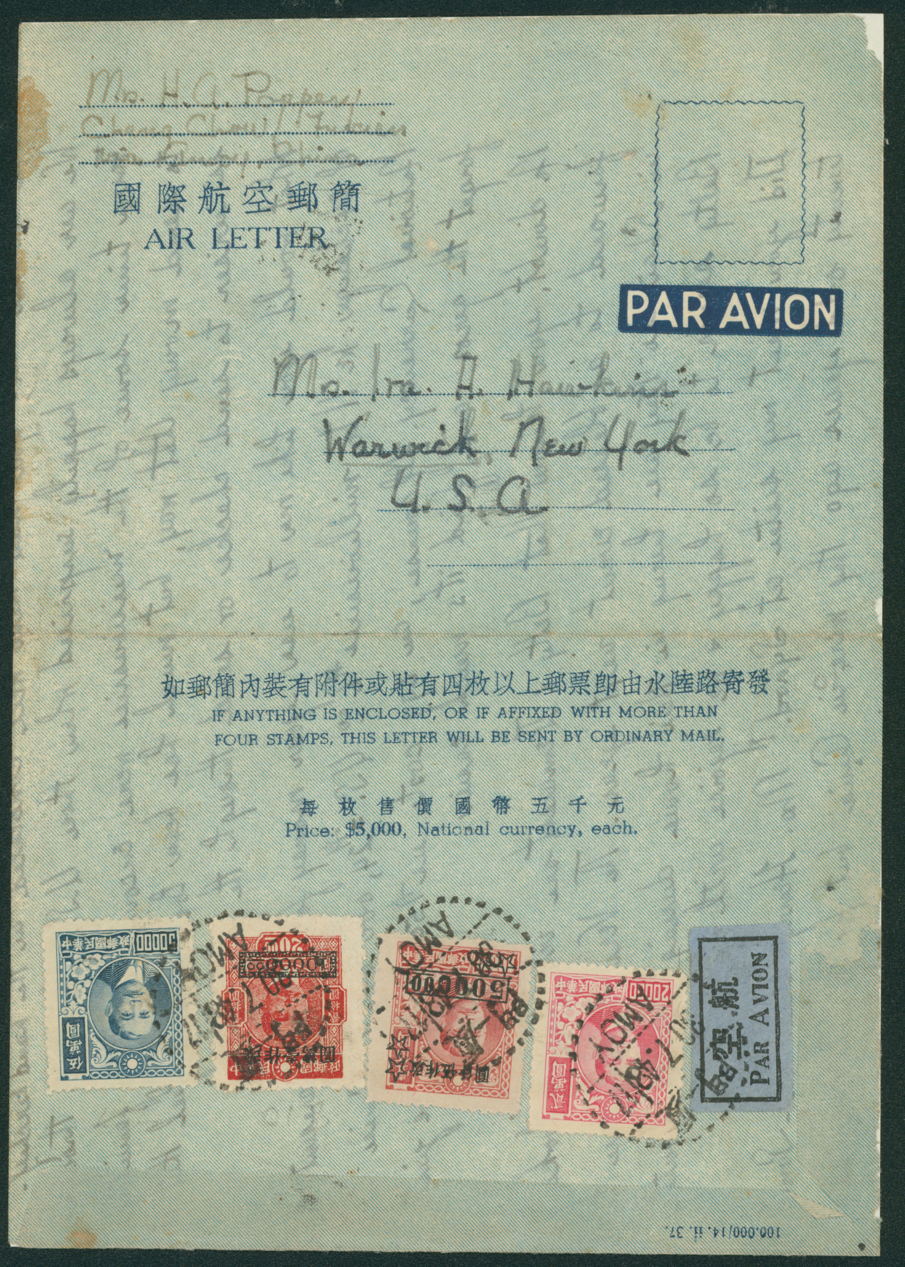 685   imageChina four stamps franking cancelled by datestamp in black 1947-07-30 Amoy to USA open cover, (Image1) (Image2) (All Images)