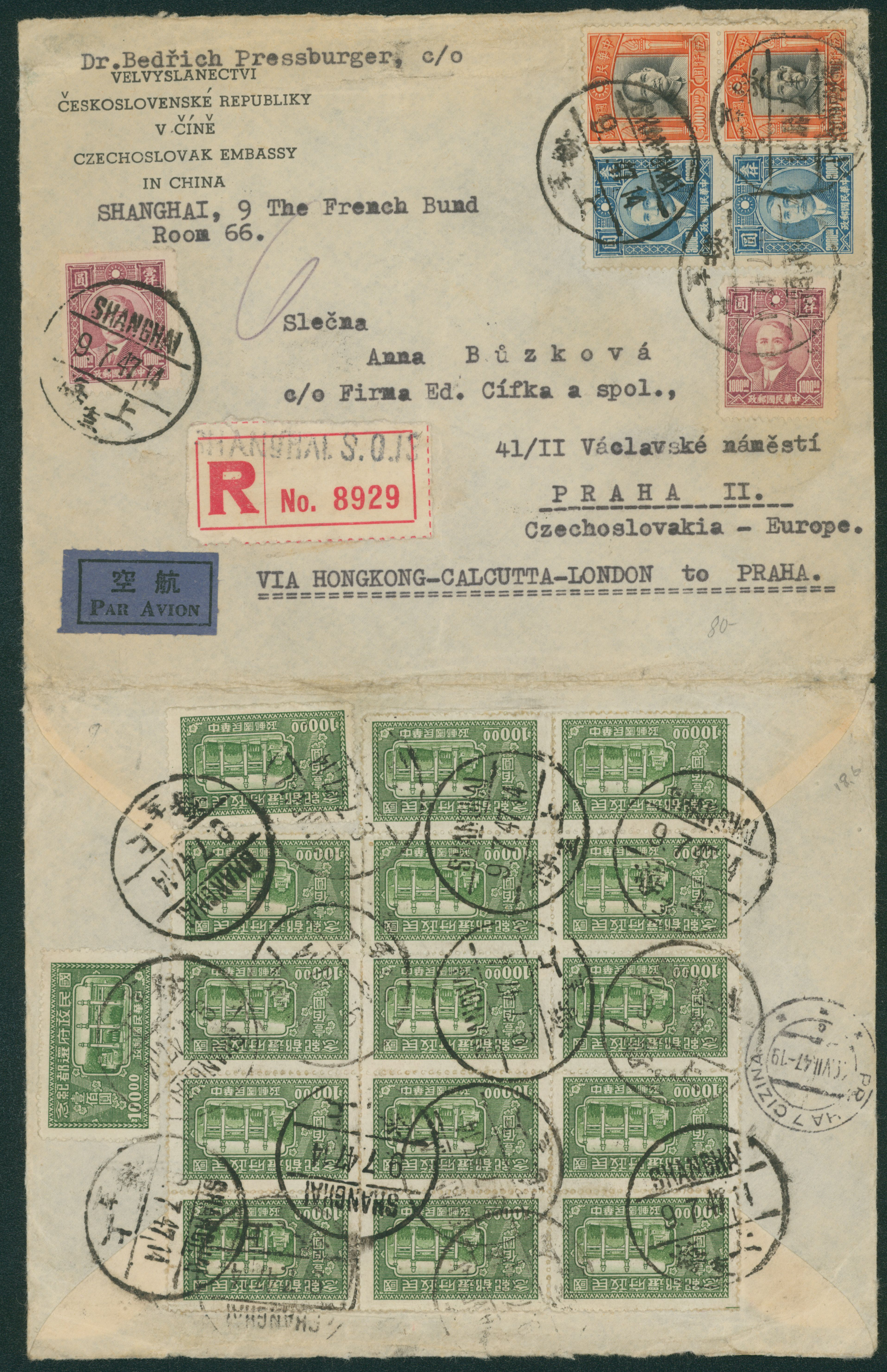 683   imageChina 22 stamps attached. cancelled by datestamp in black 1947-07-09 Shanghai to Czechoslovakia arrival : Praha open cover,weight letter (Image1) (Image2) (All Images)