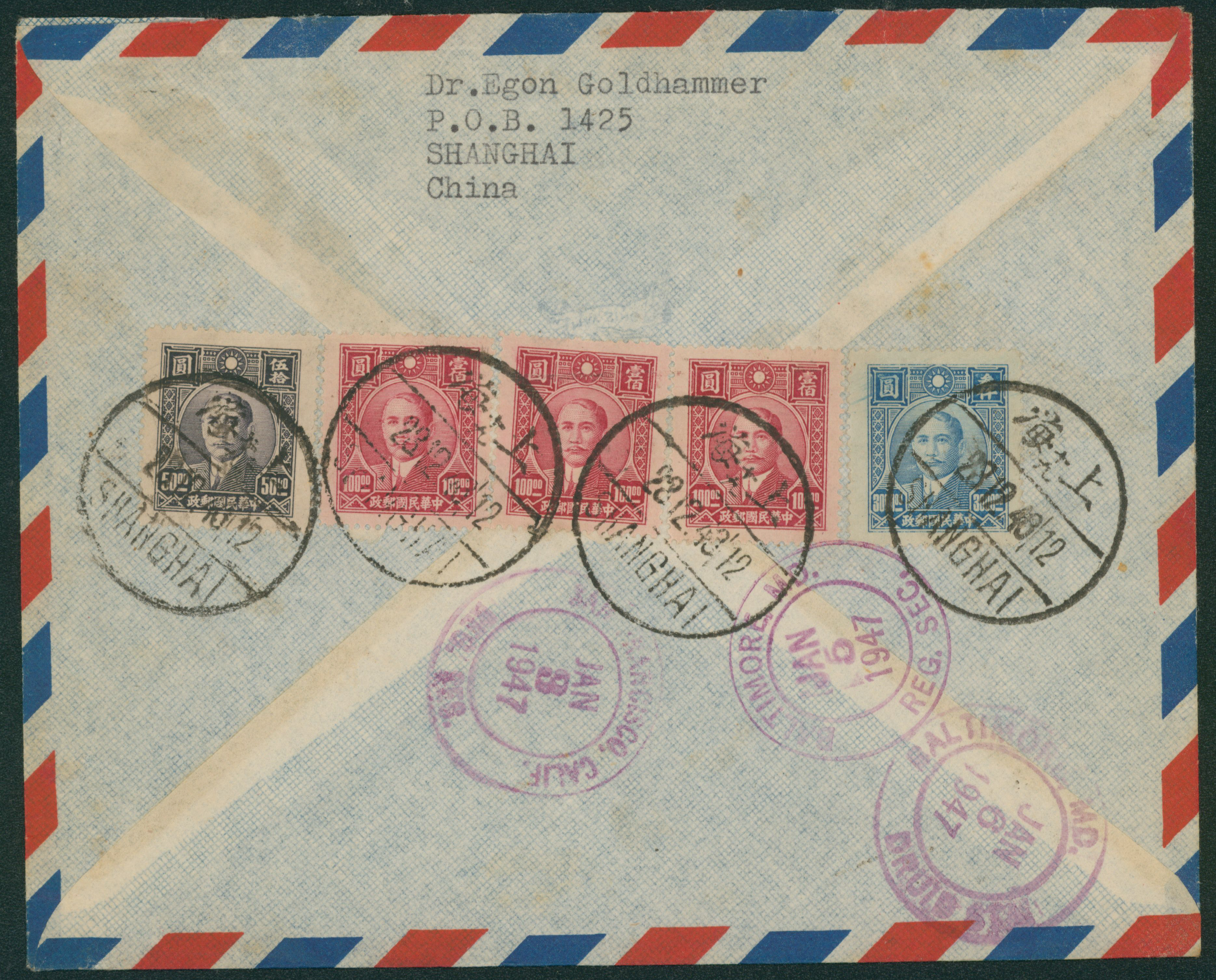 690   imageChina 11 stamps attached. cancelled by datestamp in black 1946-12-28 Shanghai to USA transit :San Francisco arrival :Baltimore airmail , registered, letter, open cover, (Image1) (Image2) (All Images)