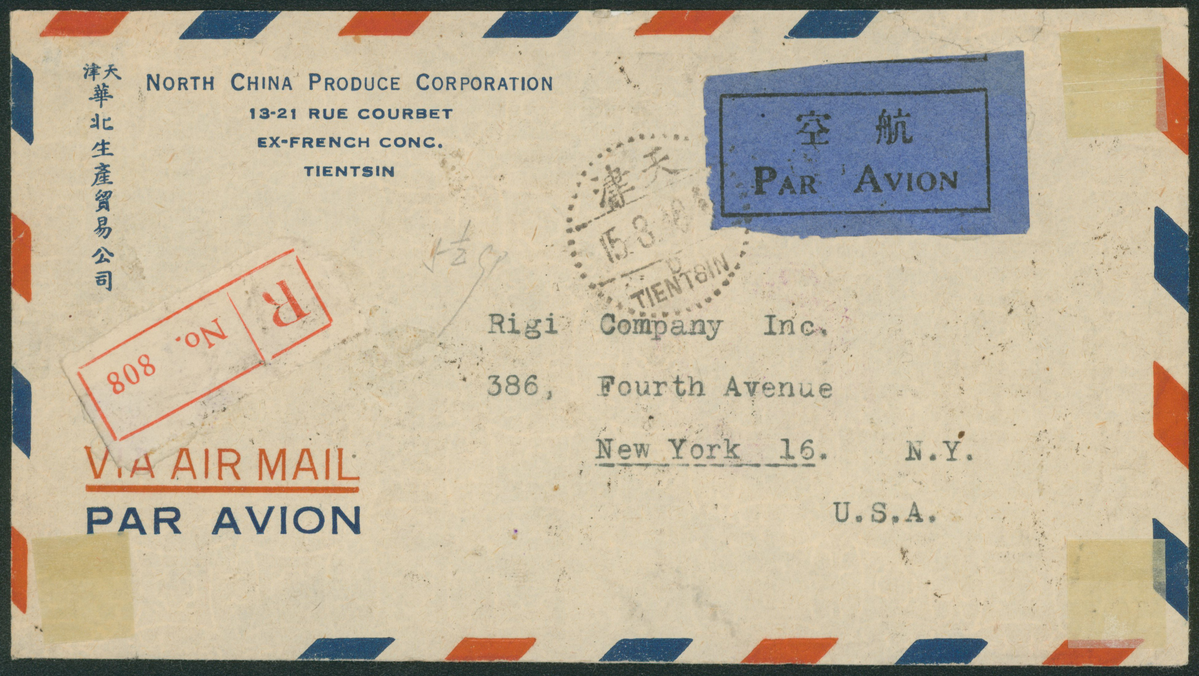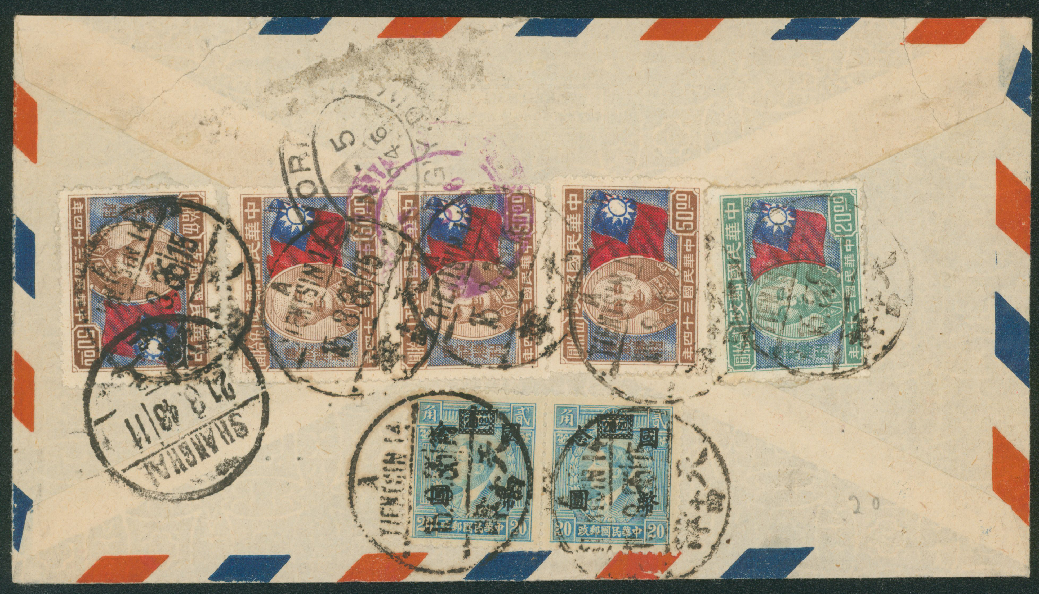 689   imageChina Seven stamps attached. cancelled by datestamp in black 1946-03-15 Tientsin to USA transit :Shanghai airmail , registered, letter, (Image1) (Image2) (All Images)