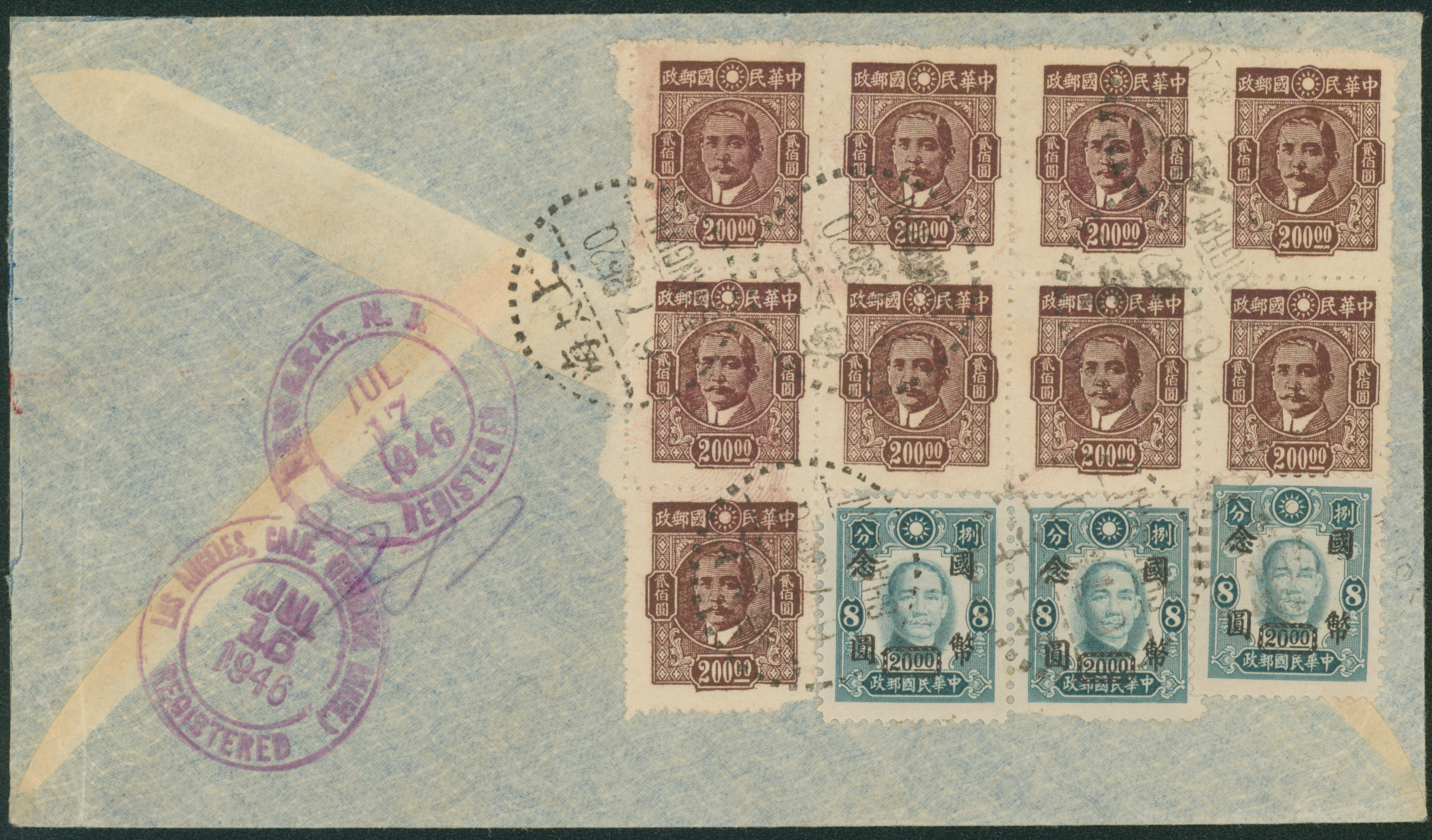 688   imageChina 12 stamps attached. cancelled by datestamp in black 1946-07-06 Shanghai to USA transit :Los Angeles arrival :New York airmail , registered, letter, AR (Image1) (Image2) (All Images)