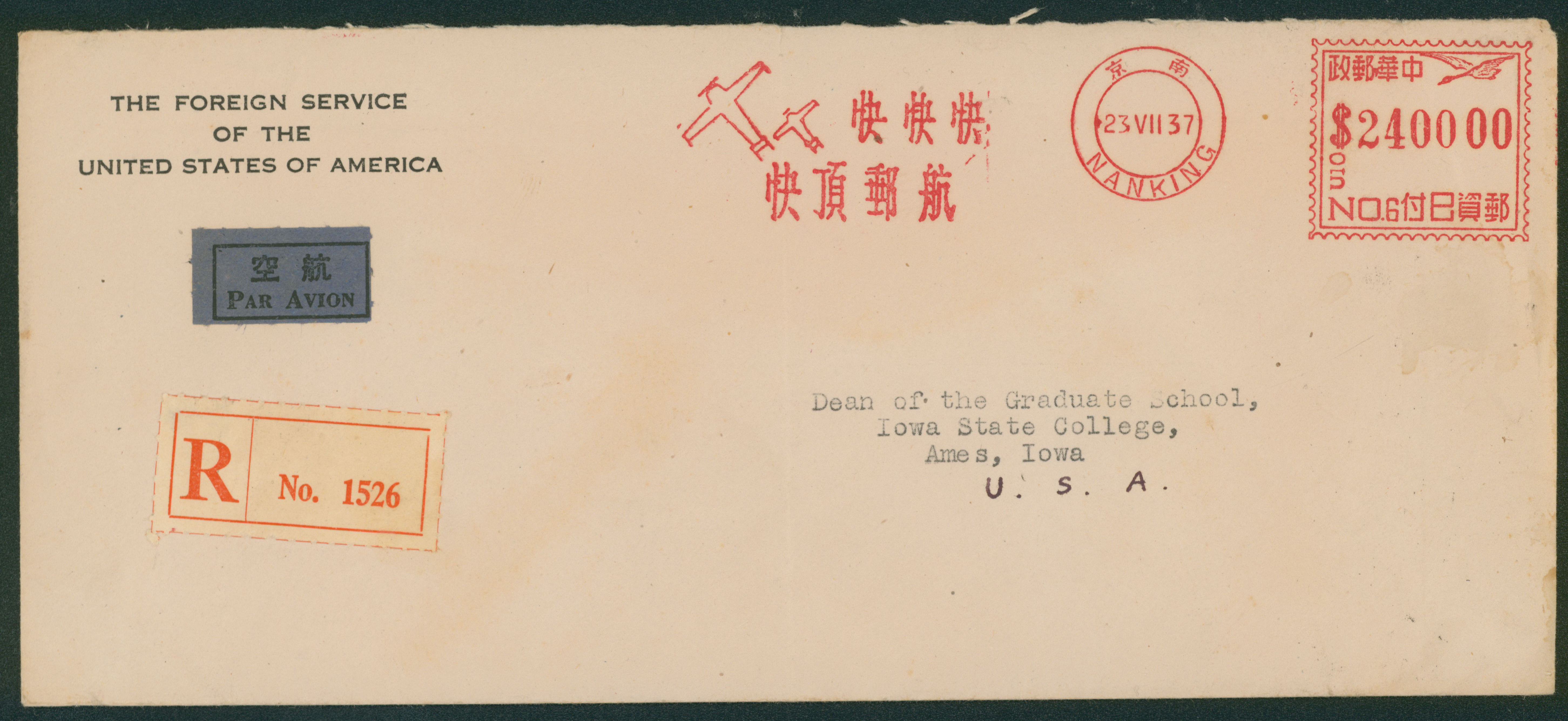 687   imageChina Frama 1948-07-23 Nanking to USA airmail , registered, letter, "International Postage Meter Stamp Catalog/China" "BA1. Universal Multi-Value" is valued at $2,000. (Image1) (Image2) (All Images)
