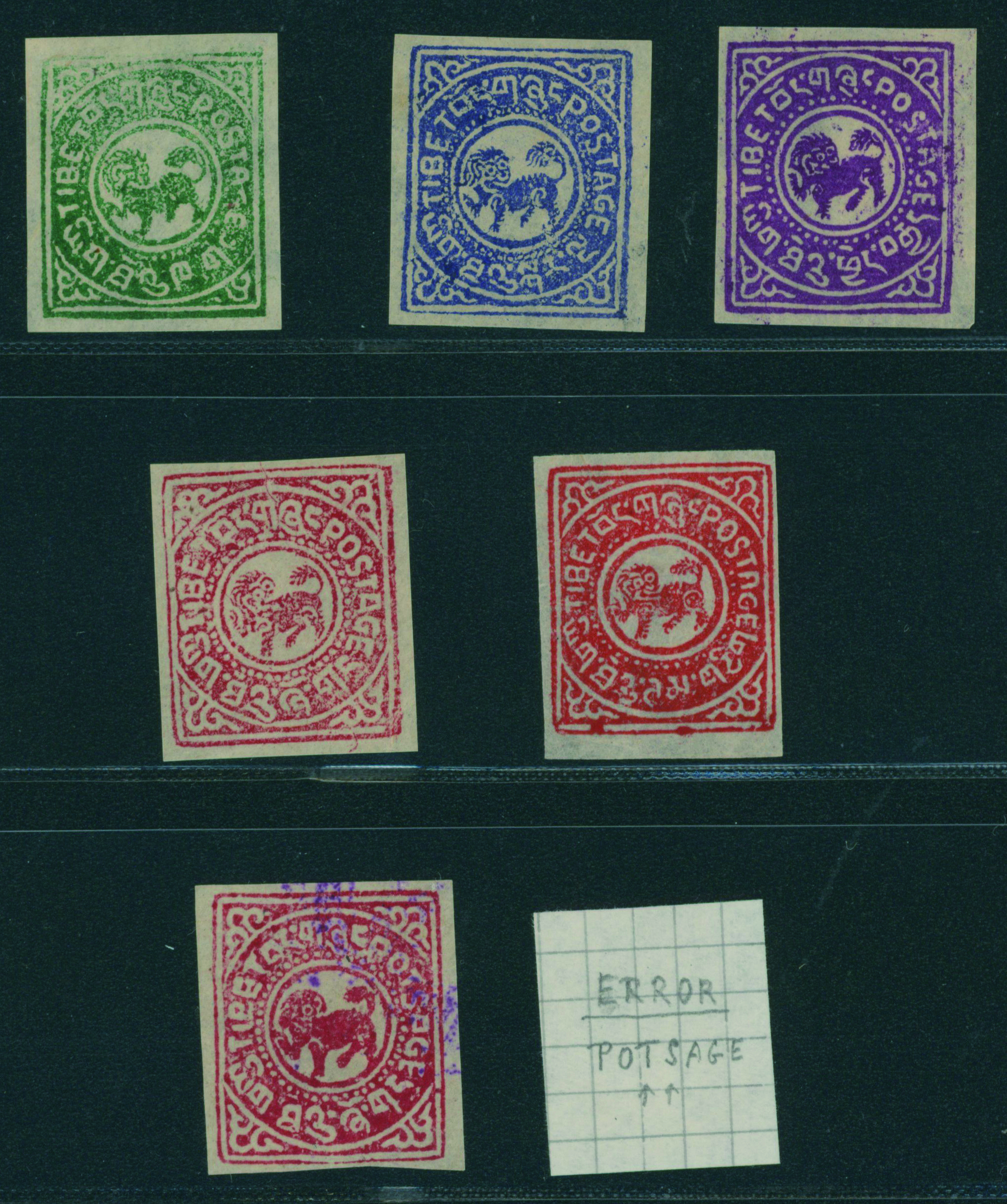 682 Chan #TL1-5, TL4ci imageChina 1912 Tibet's First Issue. Includes the spelling error in 2/3t. (POSTAGE → POTSAGE) mainly unused with some used, (Image1) (Image2) (All Images)