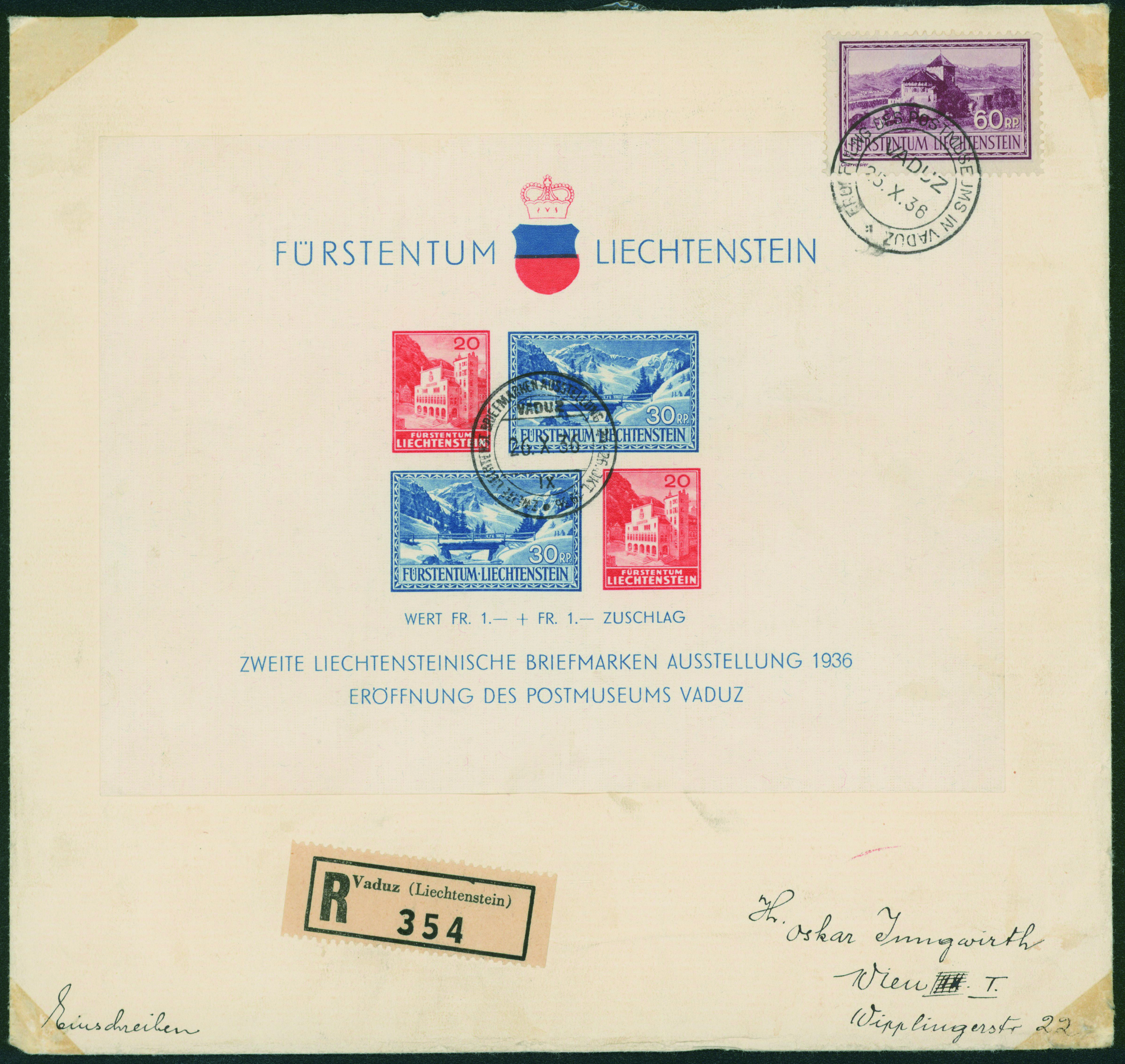 865 B14 imageLiechtenstein 1936 Postal museum S/S 1936-10-26 Vaduz was attached on an envelope which was sent as a registered letter in 1938. (Image1) (Image2) (All Images)