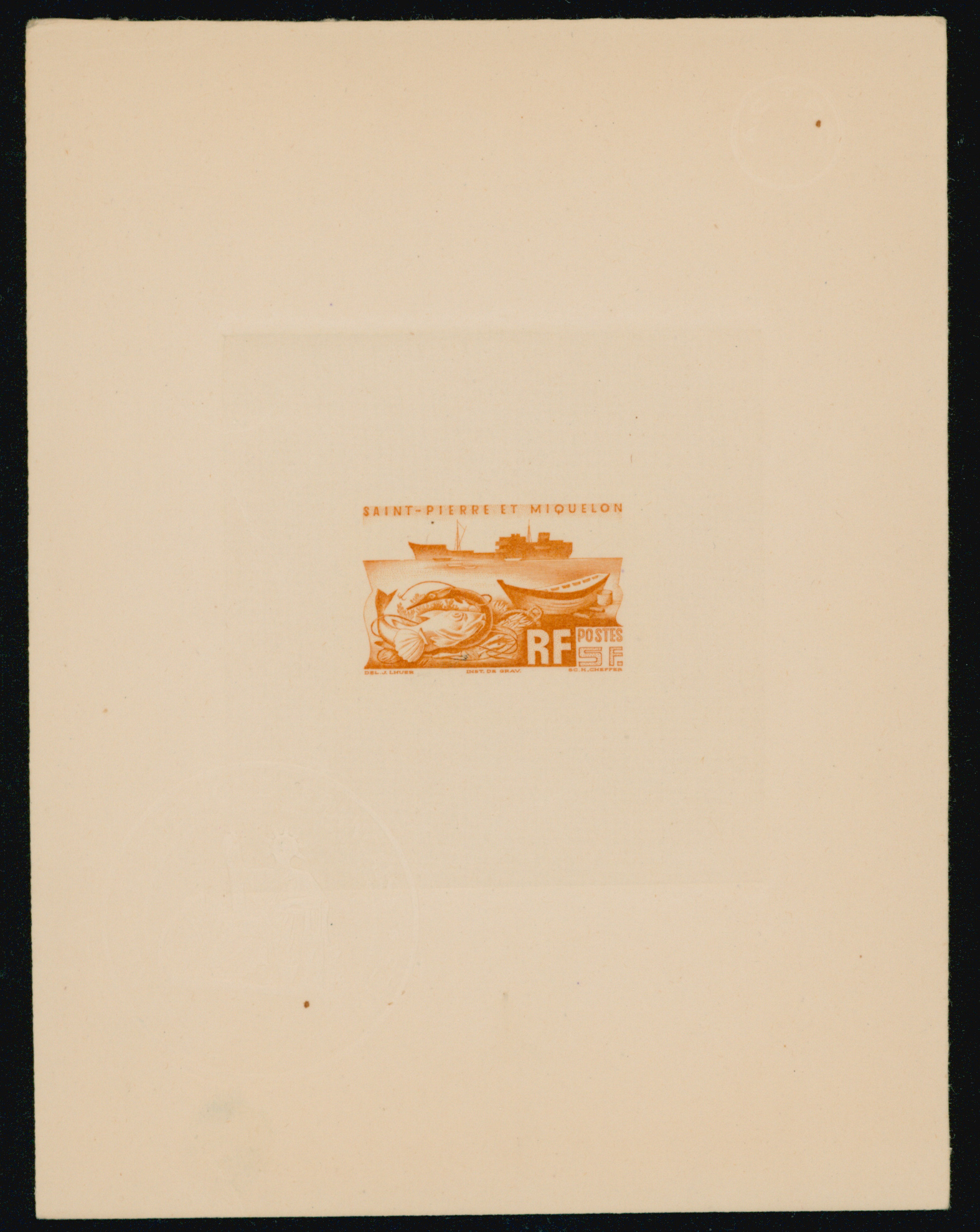 972 337 imageSaint Pierre and Miquelon 1947 5fr Die Proof stained, (Image1) (Image2) (All Images)