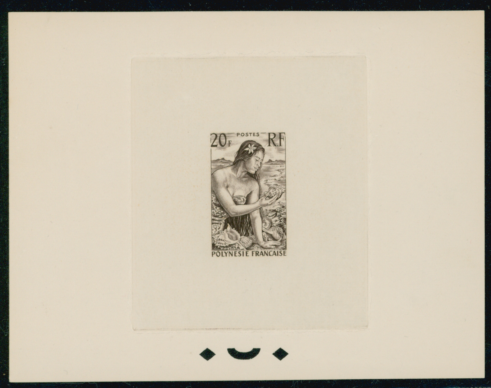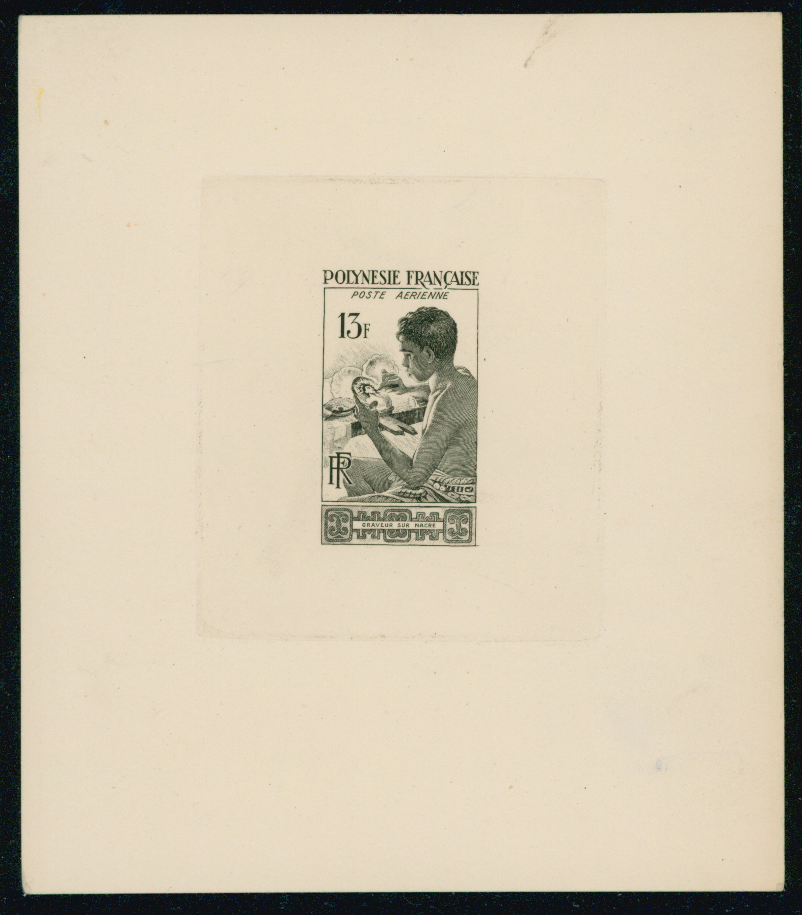 966 C34 imageFr. Polynesia 1958 Air Mail, Mother-of-Pearl Artist, 13fr Die Proof ih black unused stained, RC, (Image1) (Image2) (All Images)