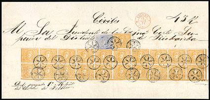 Ecuador, 1865, 1r bright yellow ochre, irregular block of 21. With complete first and second row of the sheet and showing full sheet margins and ruled lines at left and bottom, with full margins around, in combination with 1865, ½r fugitive blue (2) on large judicial wrapper to to Riobamba, all tied by fancy mute flower handstamps of Pelileo, with neat red "Pelileo, Franca, Set 15, 71" cds above, manuscript "43oz" weight notation a....Est. $7,500-10,000