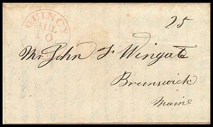 Nauvoo July 1844. Dateline on folded cover postmarked "Quincy, Ills Jul 10" red-orange cds with "25" rate and addressed to John F. Wingate (Brother), Brunswick, Maine; letter with FANTASTIC CONTENT REGARDING THE CAPTURE AND MURDER OF MORMON LEADERS, JOSEPH SMITH AND HYRUM SMITH WRITTEN BY A BODYGUARD, EDWARD B. WINGATE, reads, in part, "…Our whole troubles originated from a few Apostaties from this Church because Joseph would not uphold them in there Hellish Deeds they h....Est. $5,000-7,500