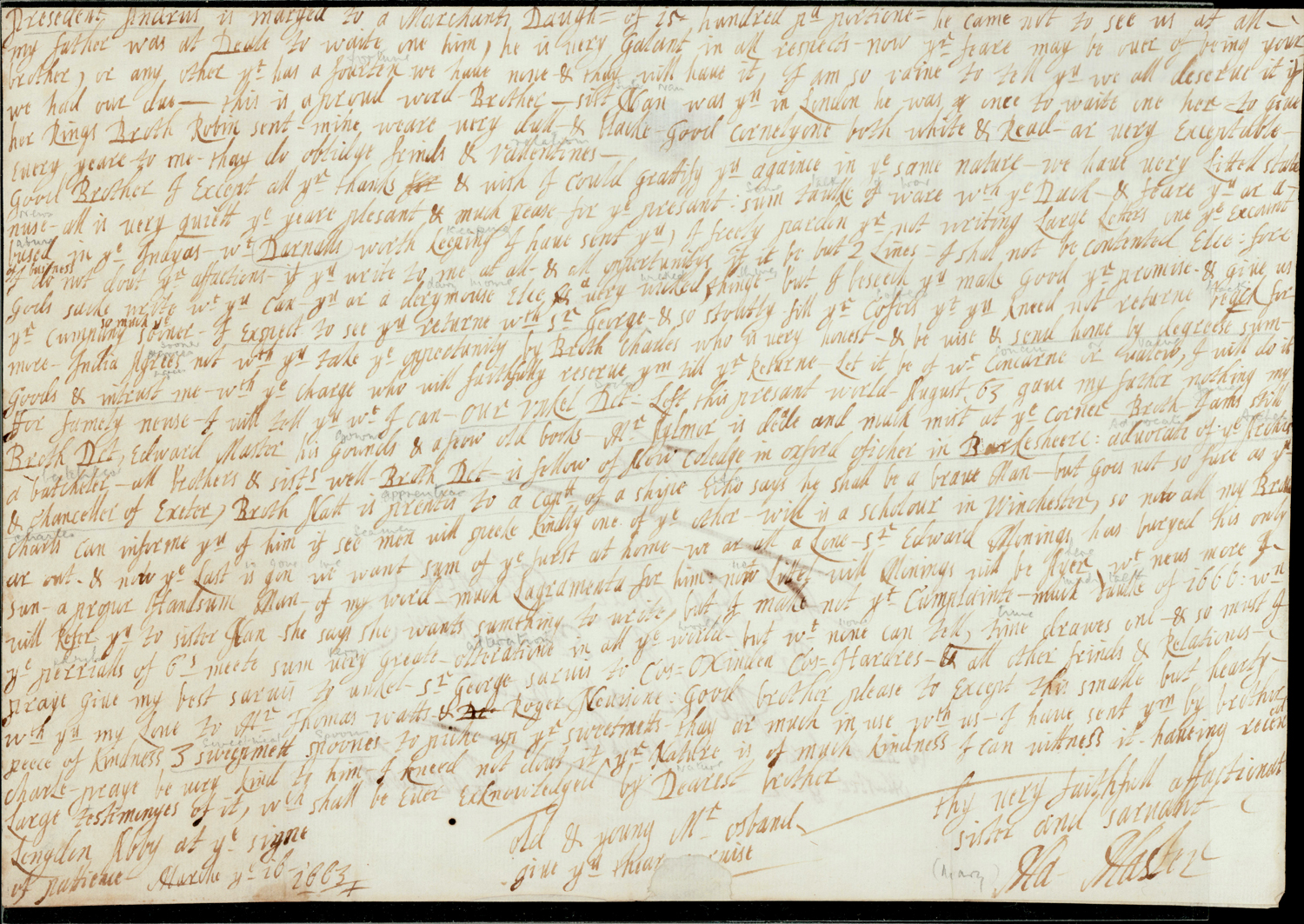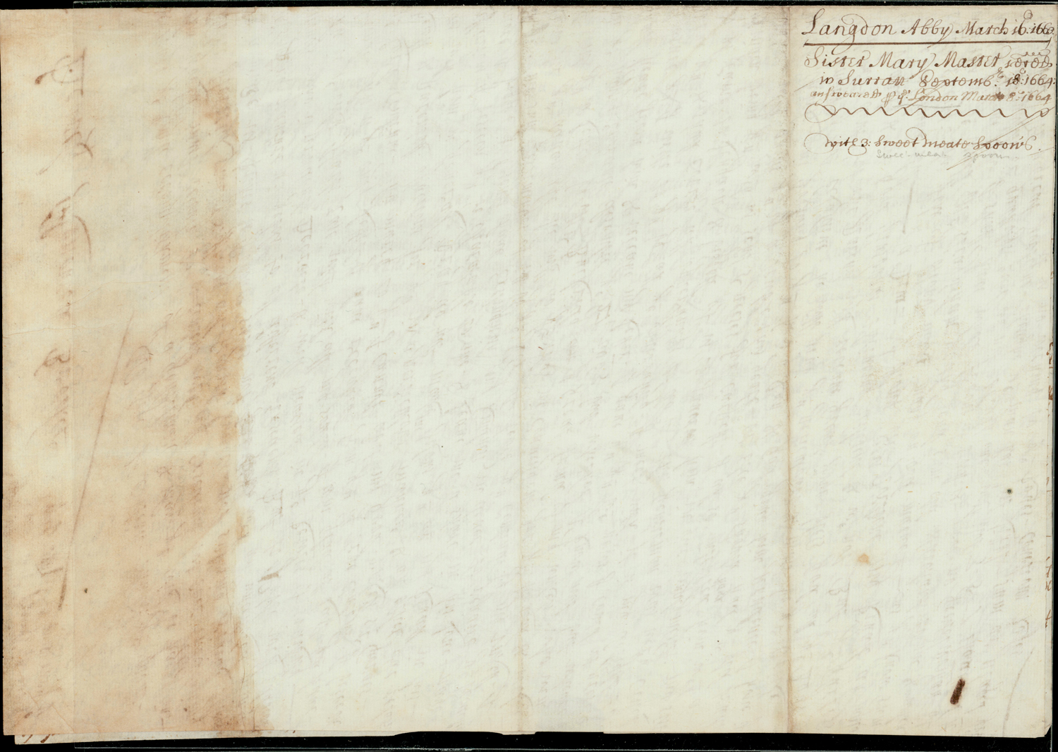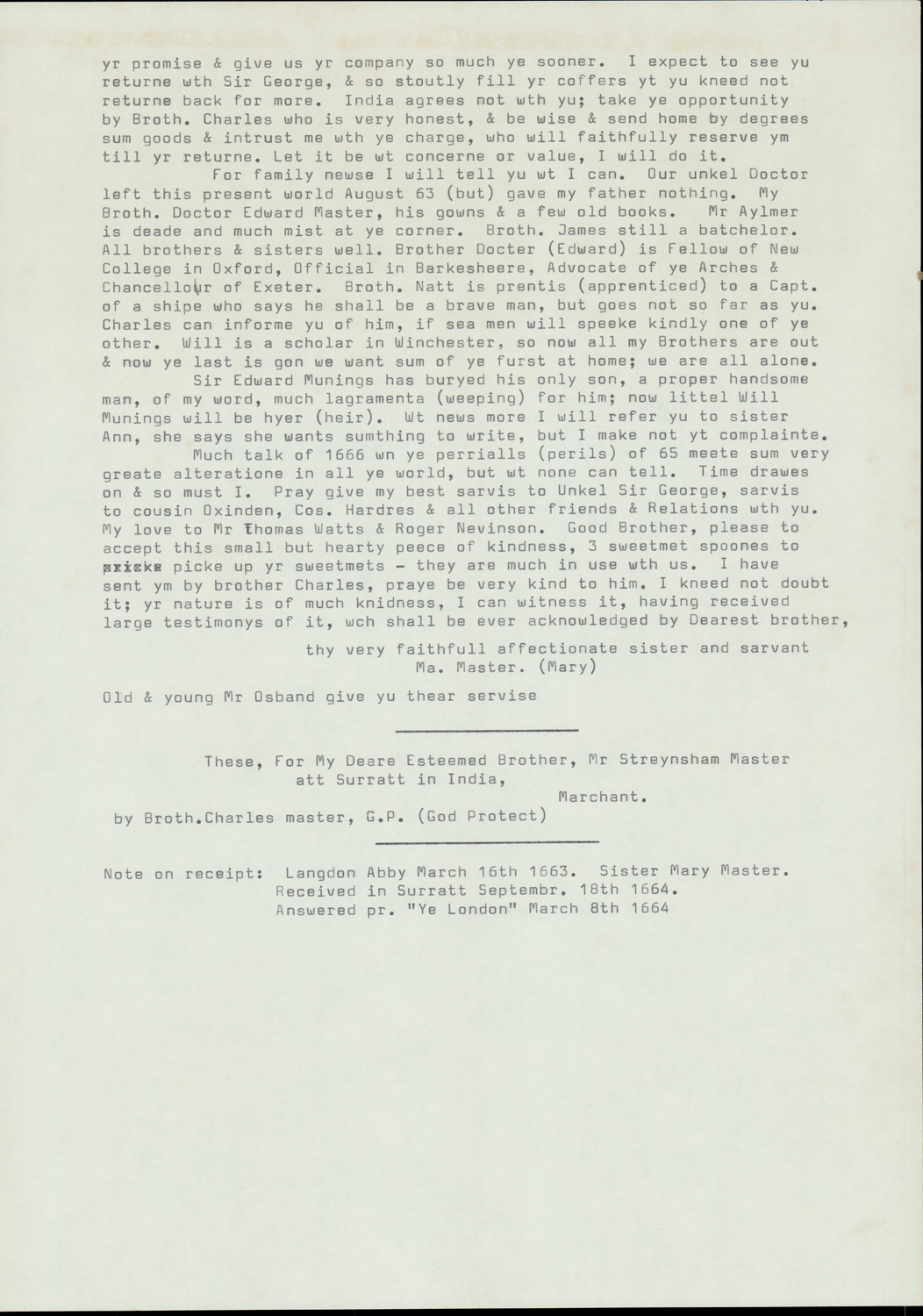 incoming letter from England to Mr. Streynsham Master at Surat written by his sister, Margaret Master, sent by brother, Charles Master at Langdon Abbey. Received in Surat 1664 (Sep 18). Travel time 1½ years. Transcript of letter