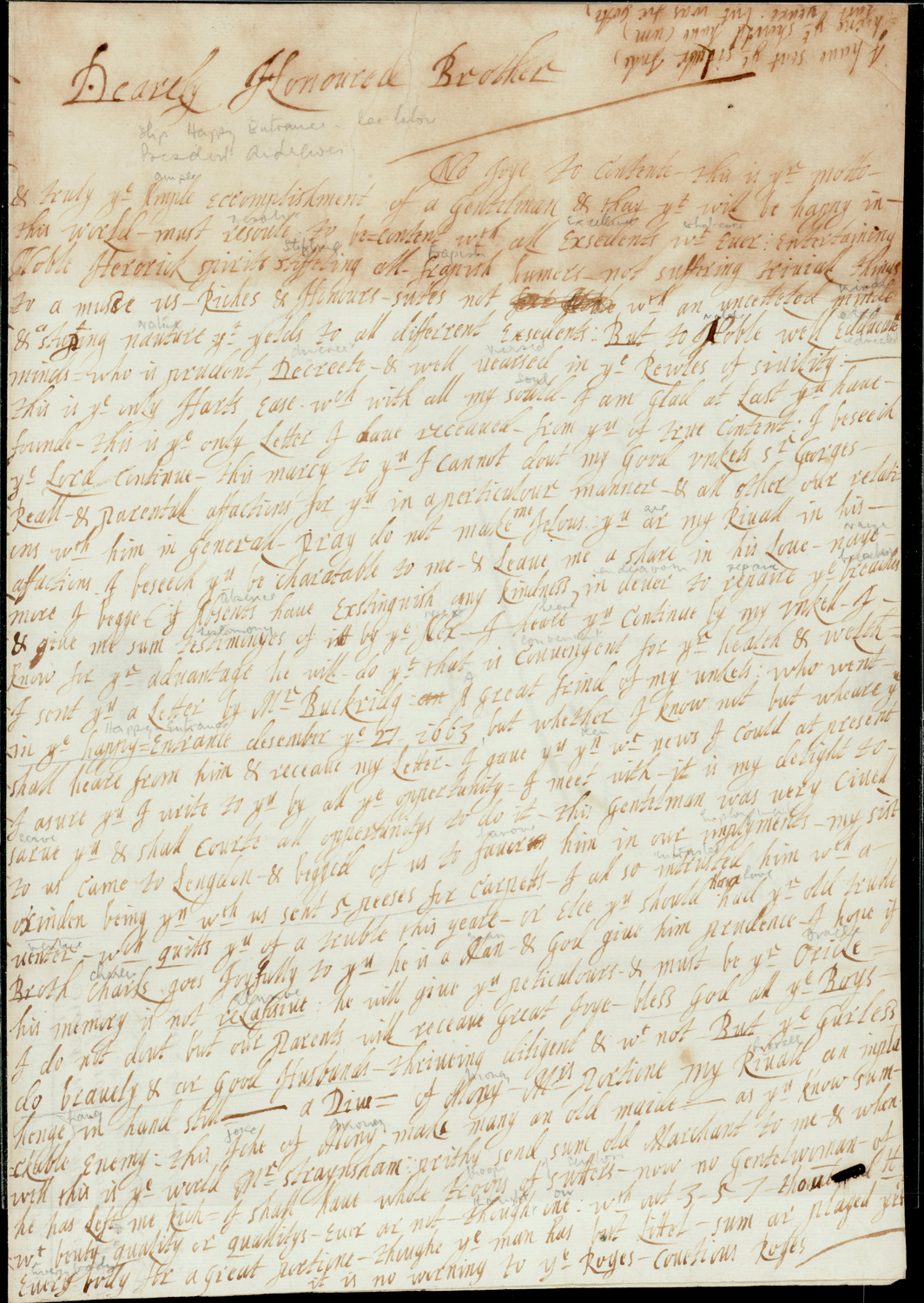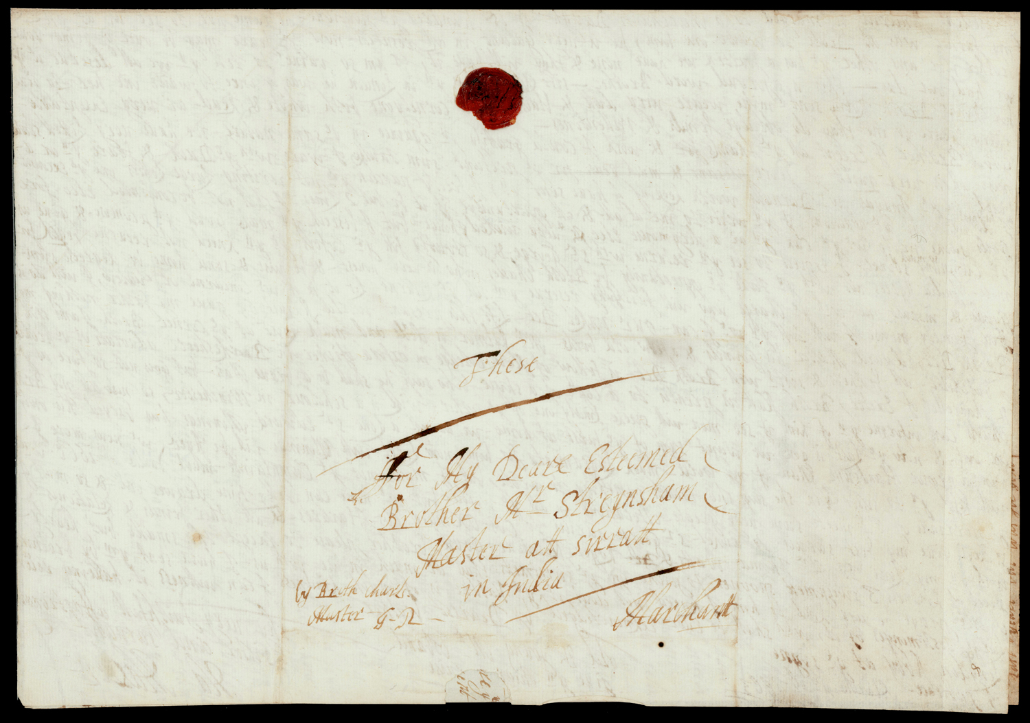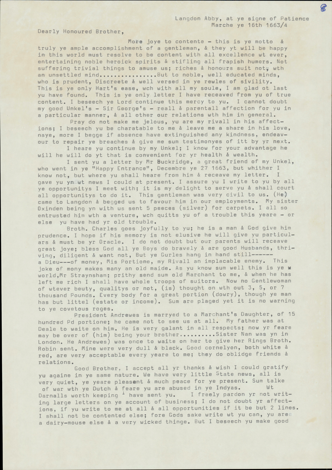 incoming letter from England to Mr. Streynsham Master at Surat written by his sister, Margaret Master, sent by brother, Charles Master at Langdon Abbey. Received in Surat 1664 (Sep 18). Travel time 1½ years. Transcript of letter