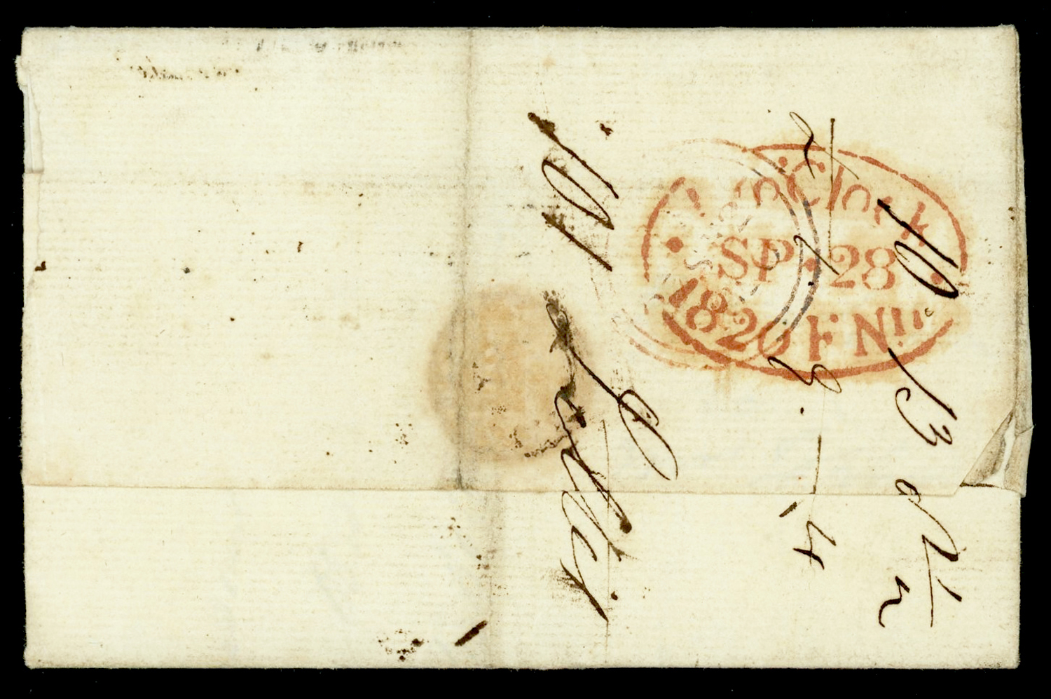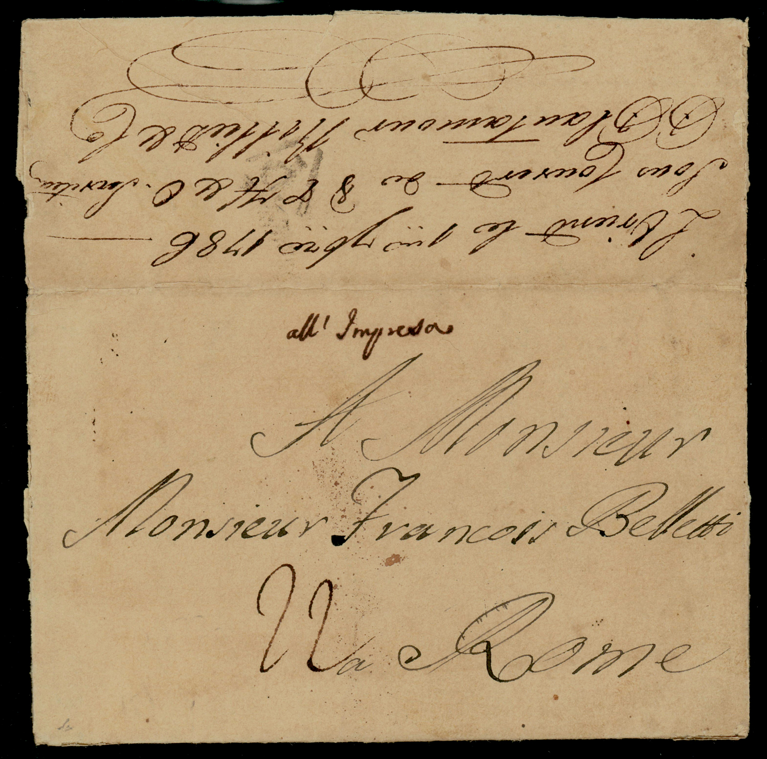 "L'Orient le 7bre 1786 - sous couvert de votre tres humble and obedient serviteurs Blantamour Rillied & Co." in manuscript with "22" charge (Bajocchi) on front panel. A very rare and early entire to an unusual destination.