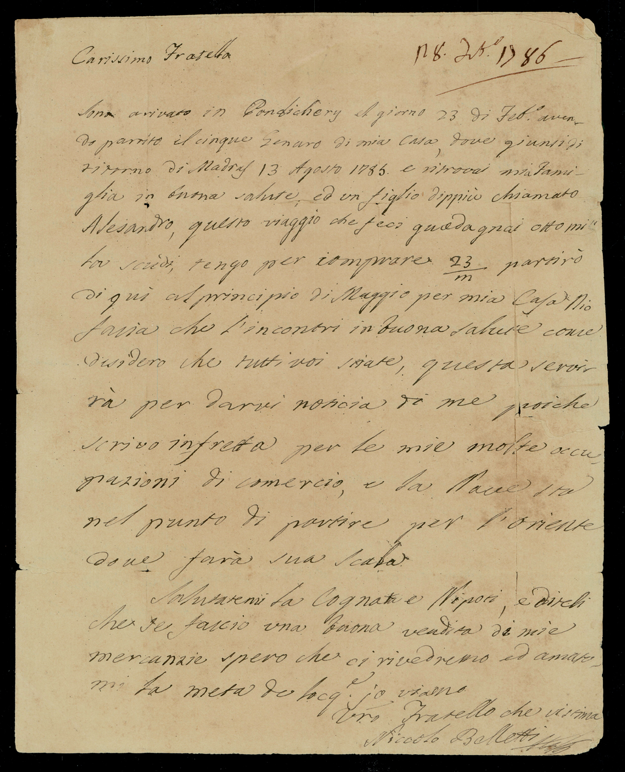1786 (Feb 23) entire letter from an Italian trader recently arrived in Pondicherry from Madras, mailed back to Rome and carried by a ship from the "La Campagnie de Calonne" via the Cape to L'Orient. Reverse with forwarding agent's notation