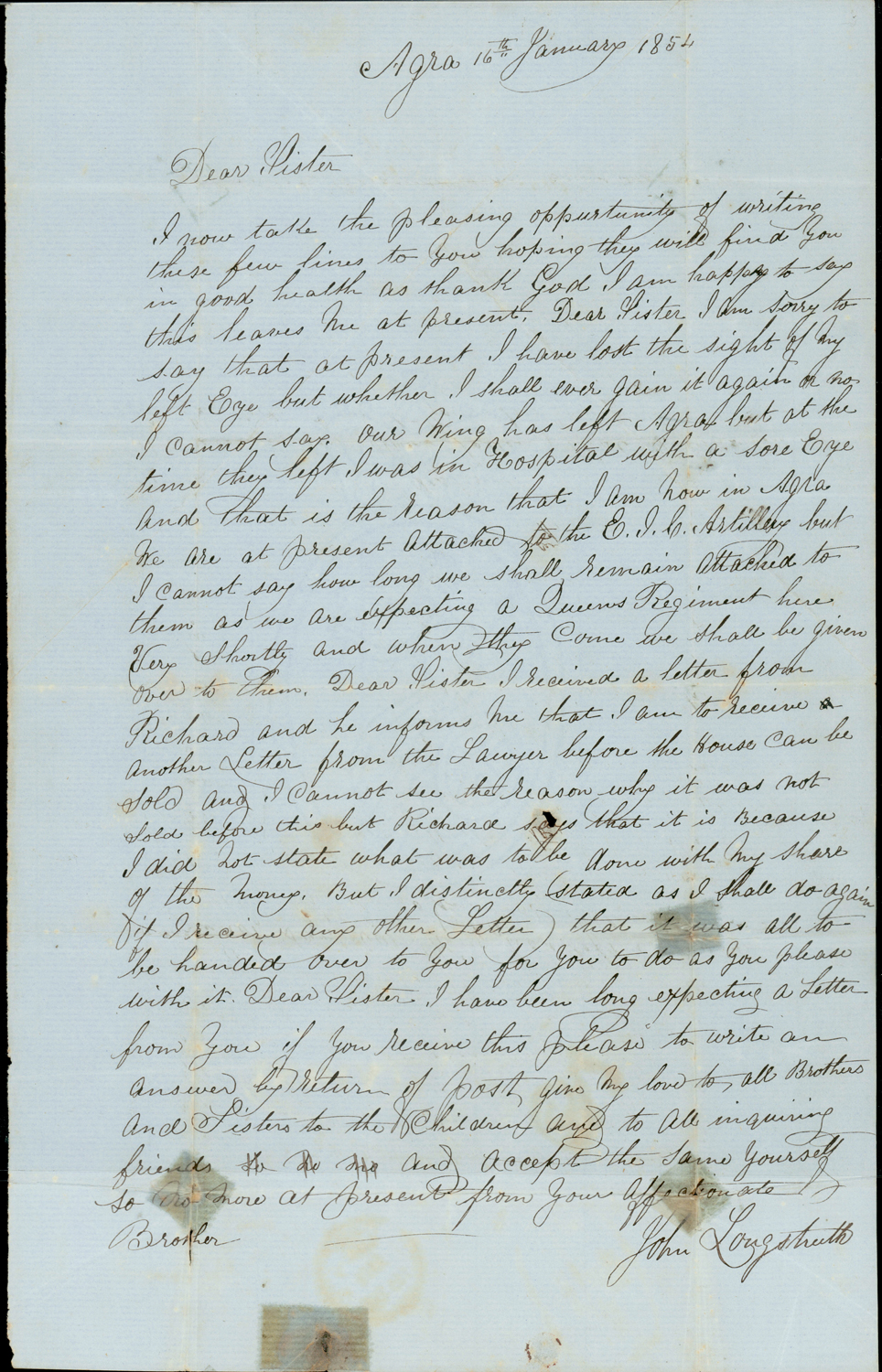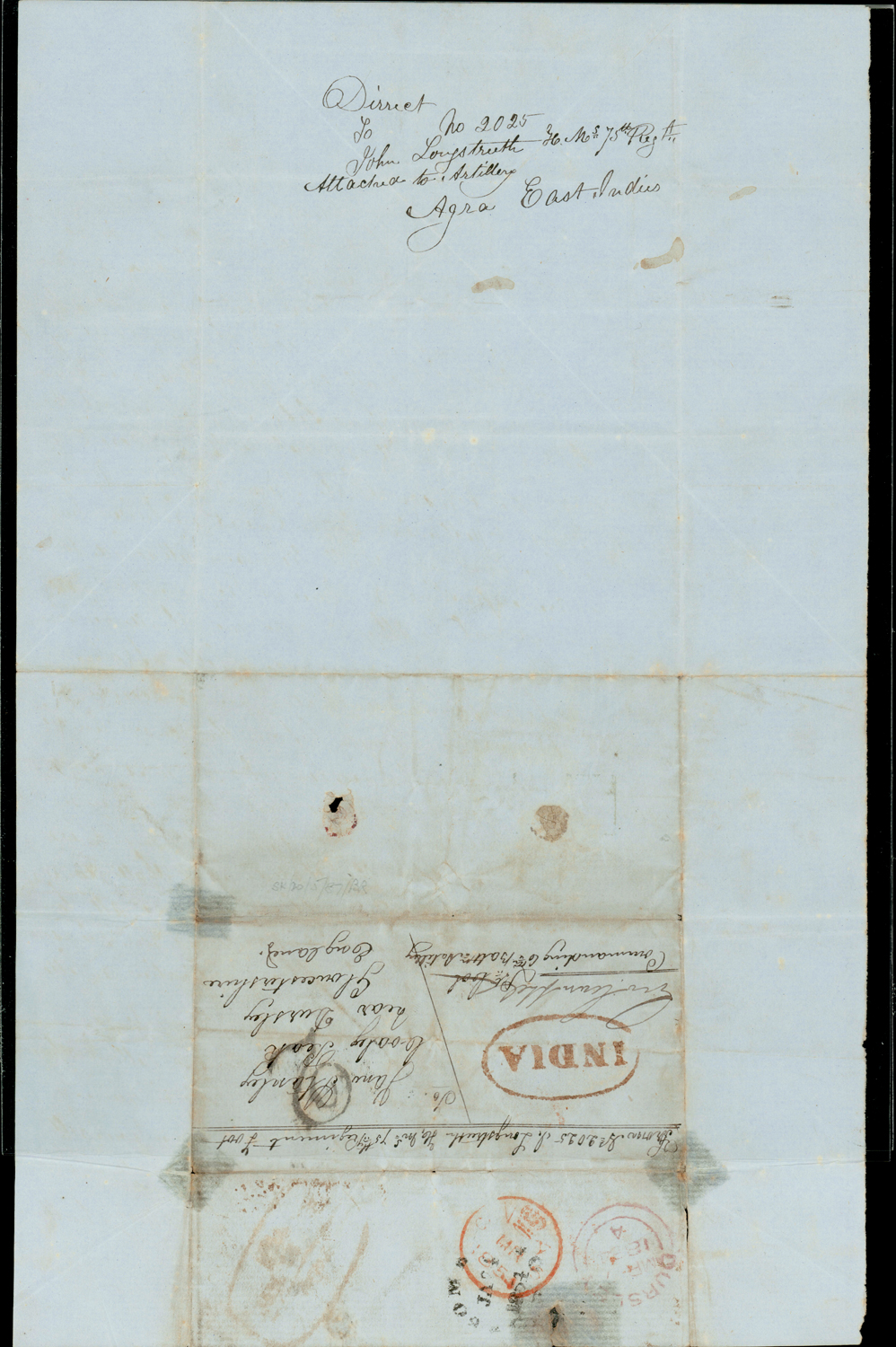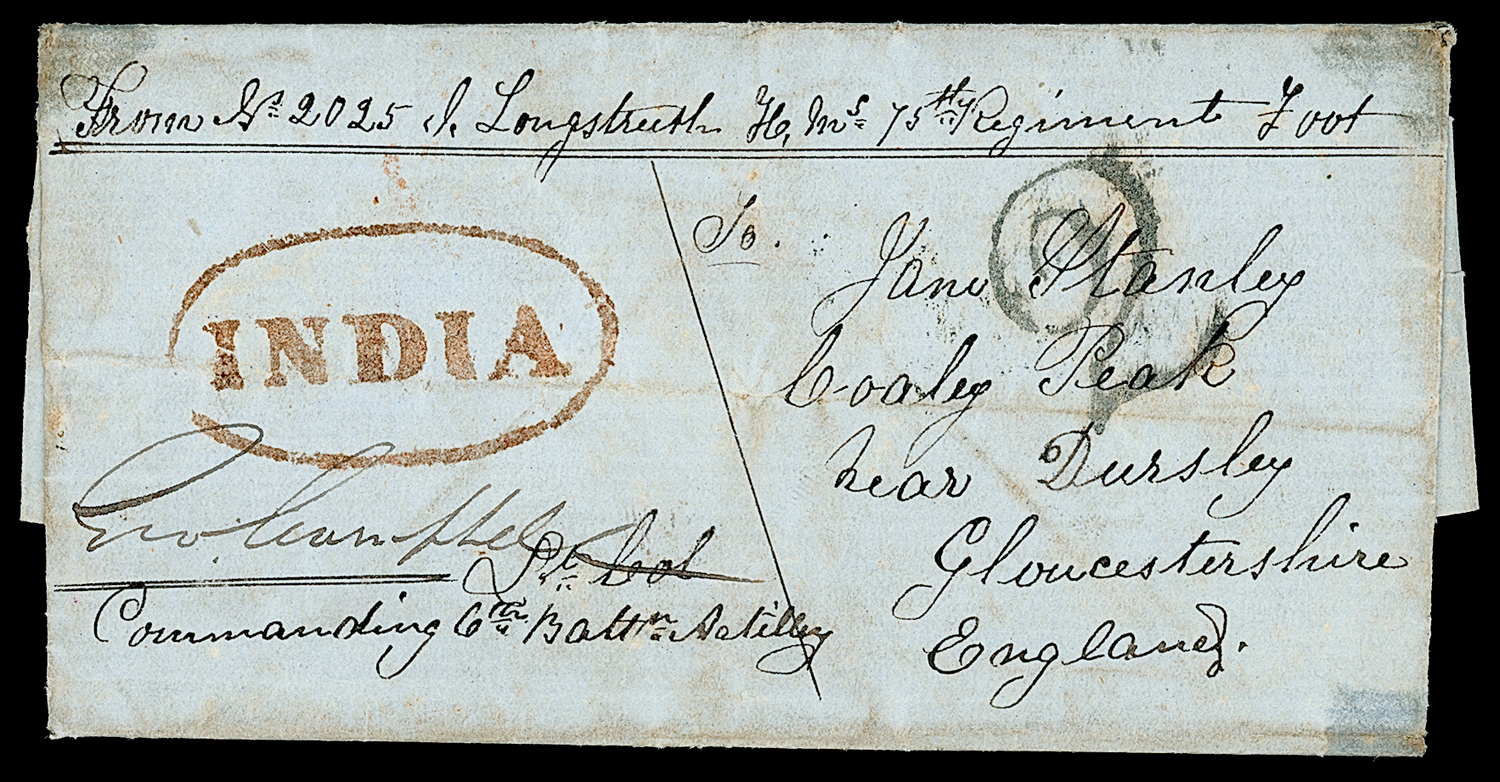 AGRA Service Giles 15 on Soldier's Concessionary Rate folded letter datelined "Agra, 16th January 1854" and endorsed "From No. 2025 J. Longshuth, H.M.S. 15th Regiment Foot", properly countersigned by commanding officer,