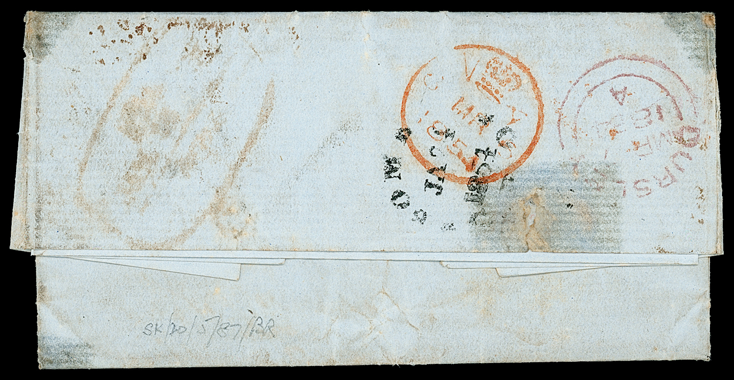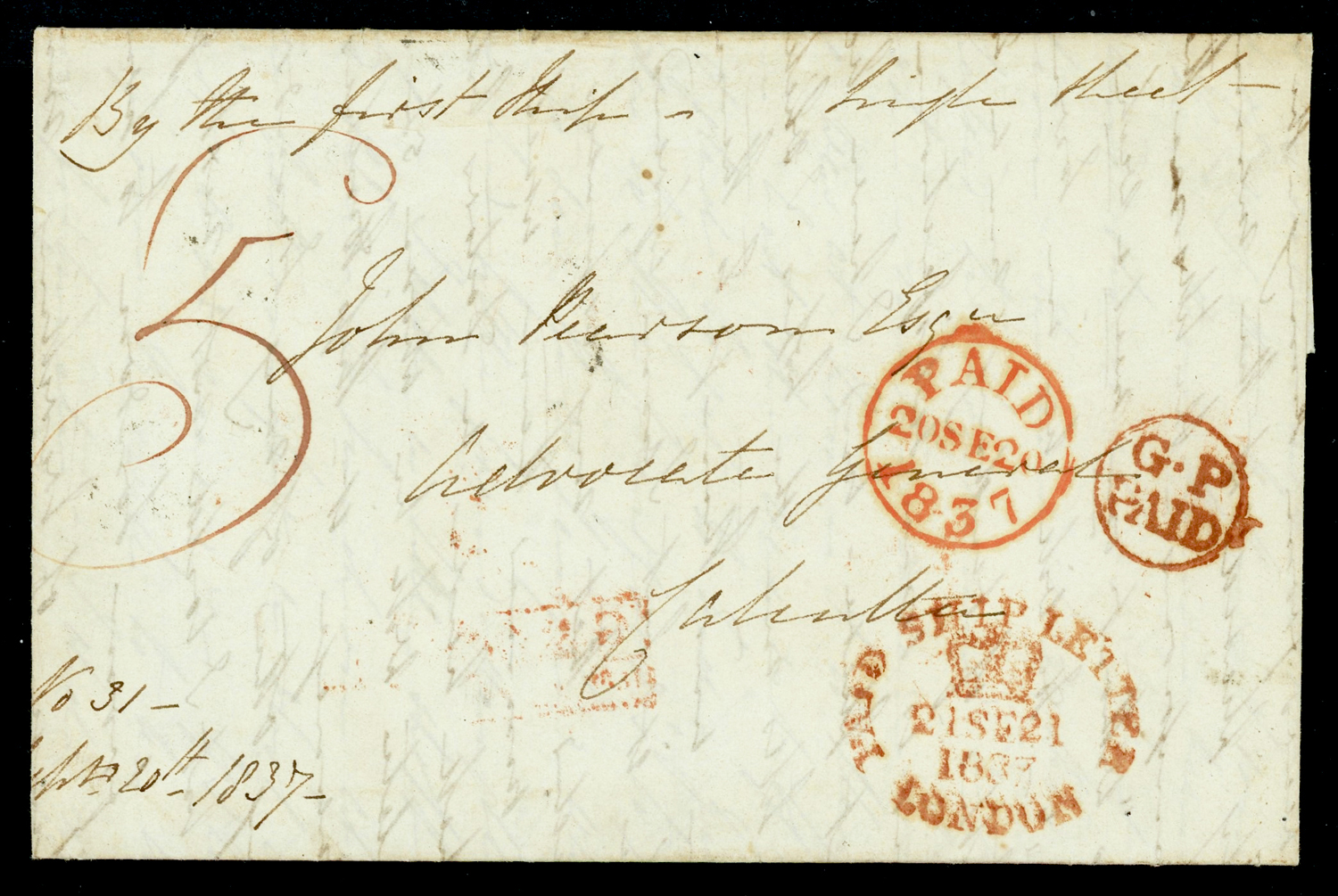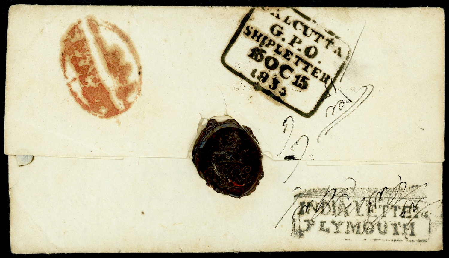 DEHLI PtPd Giles 1 in red on folded letter to UK, with CALCUTTA G.P.O. SHIPLETTER Giles SD10, and boxed INDIA LETTER PLYMOUTH (Image) (Imageb)