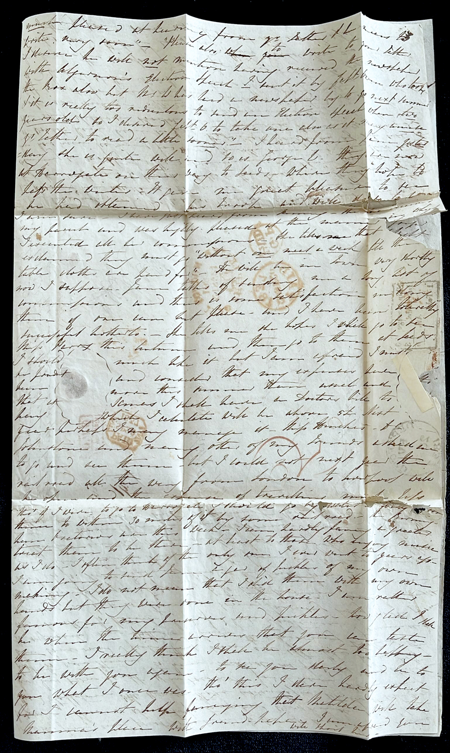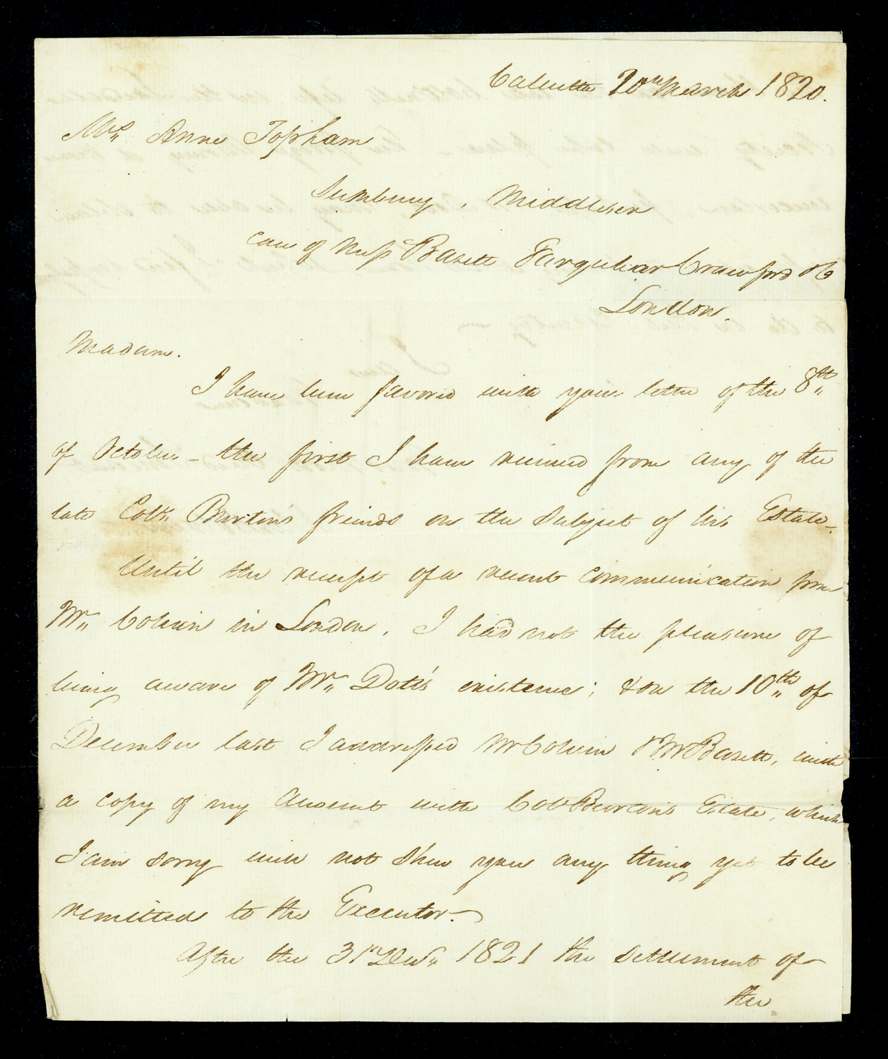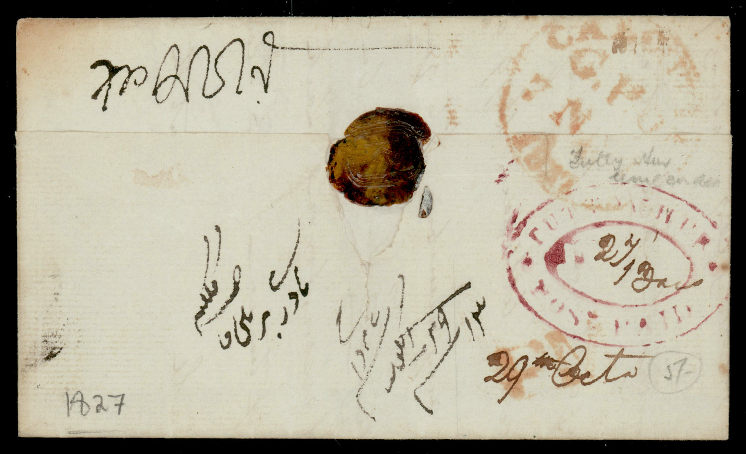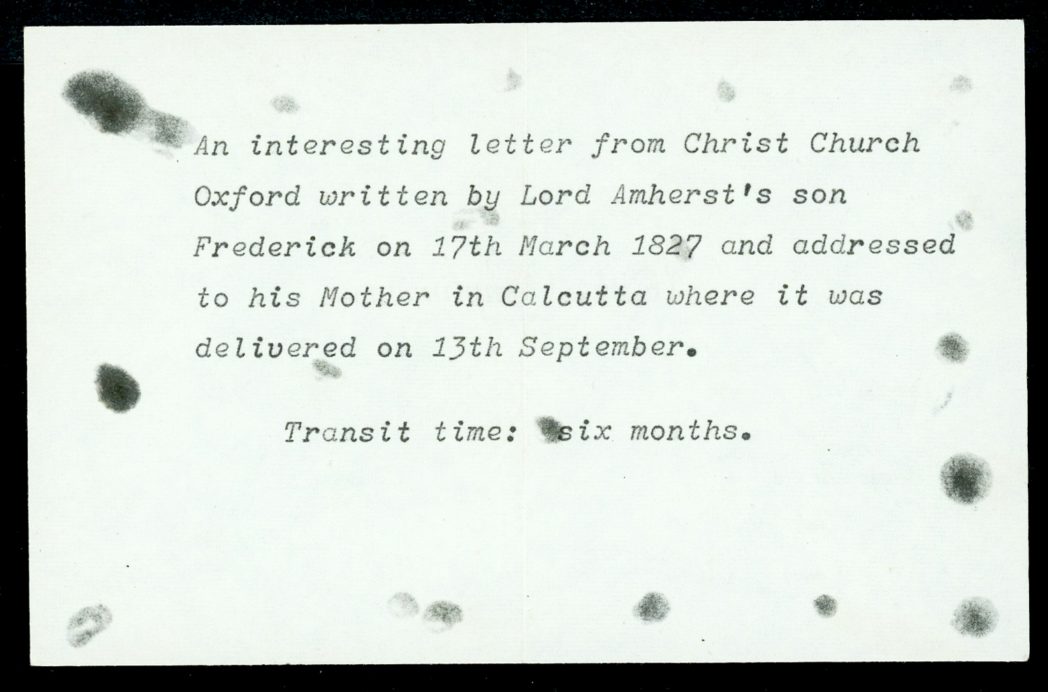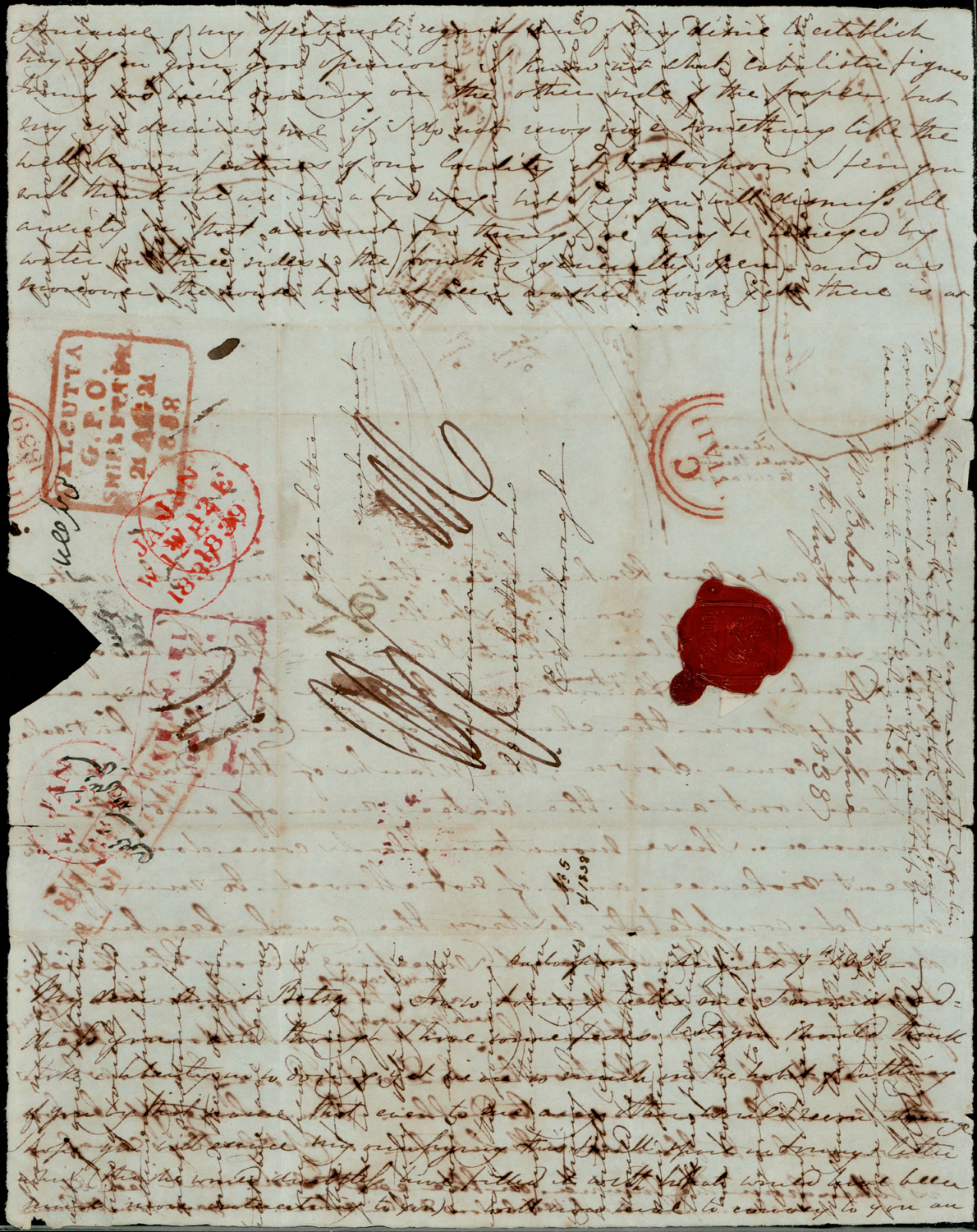 CALCUTTA G.P.O. Giles G9 on incoming folded letter from UK, written by Lord Amherst's son Frederick to his mother, Countess Amherst. (Image) (Imageb)