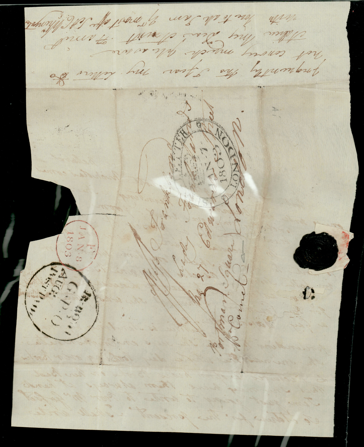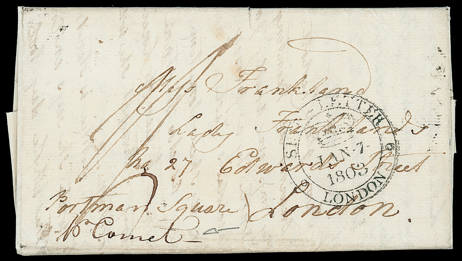 Bengal/G.P.O./AUG:/POST PAID oval Giles SD2 bold and complete strike on back of folded letter to London, England, sender's directive "Pr Comet", letter datelined "Mahabad July 28th, 1802", Crowned Ship Letter London