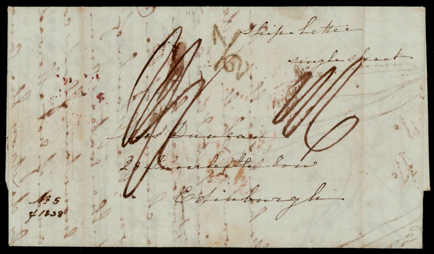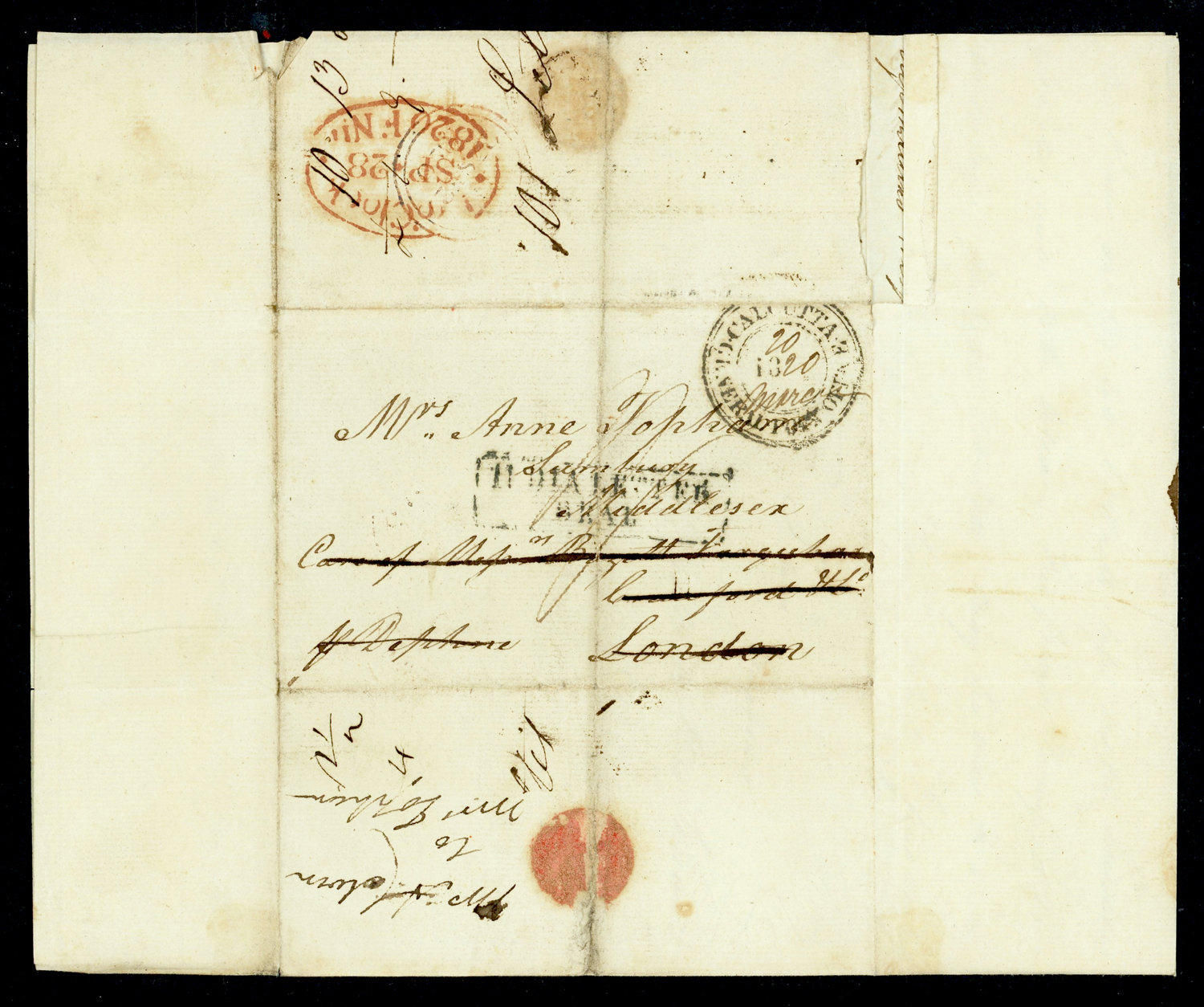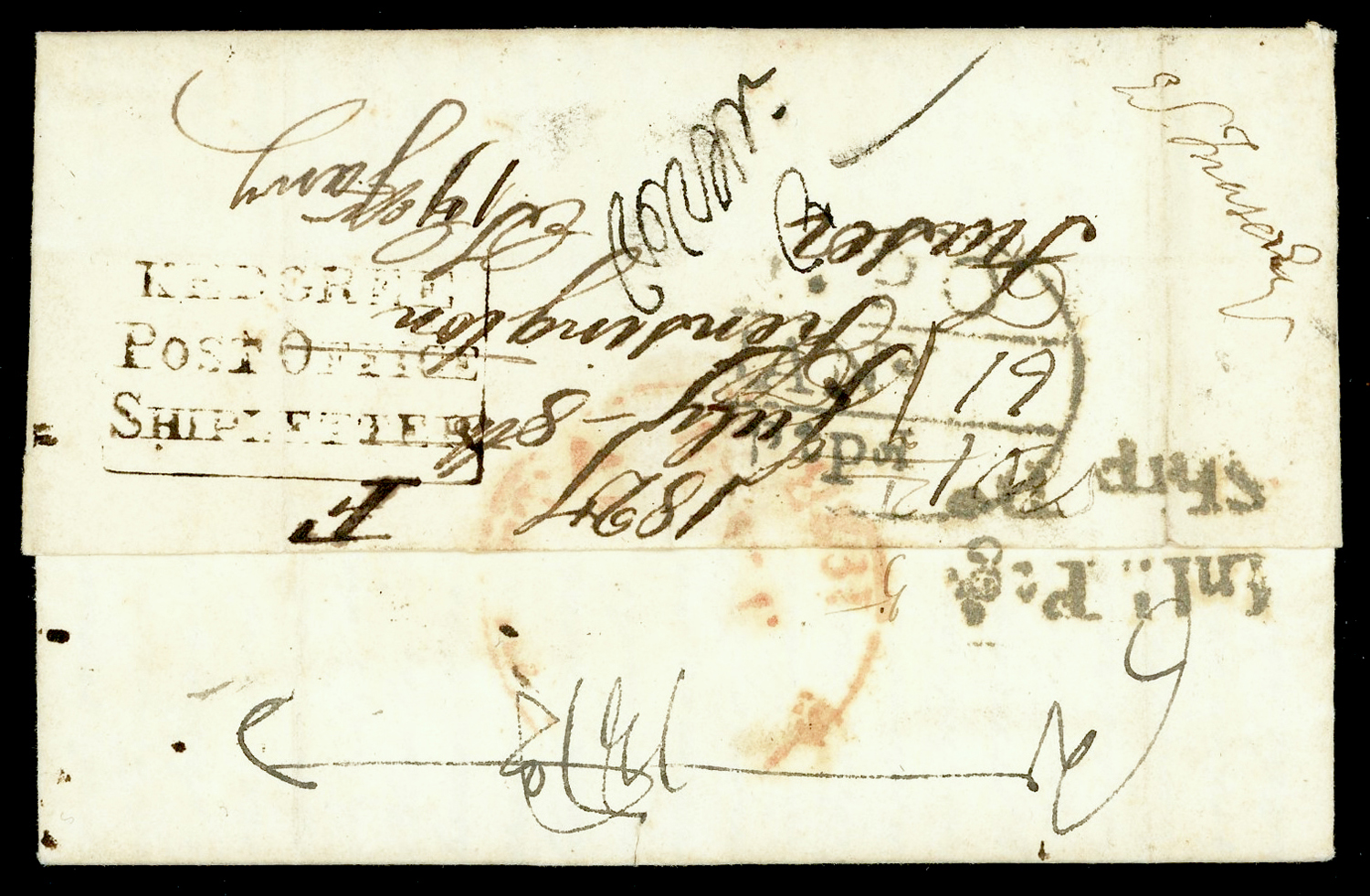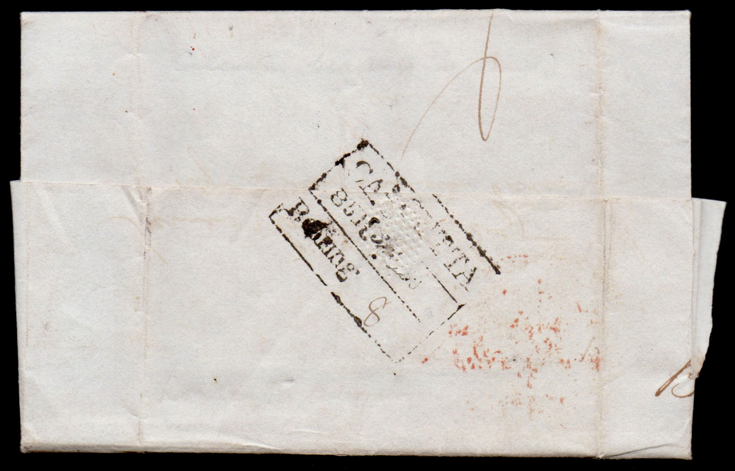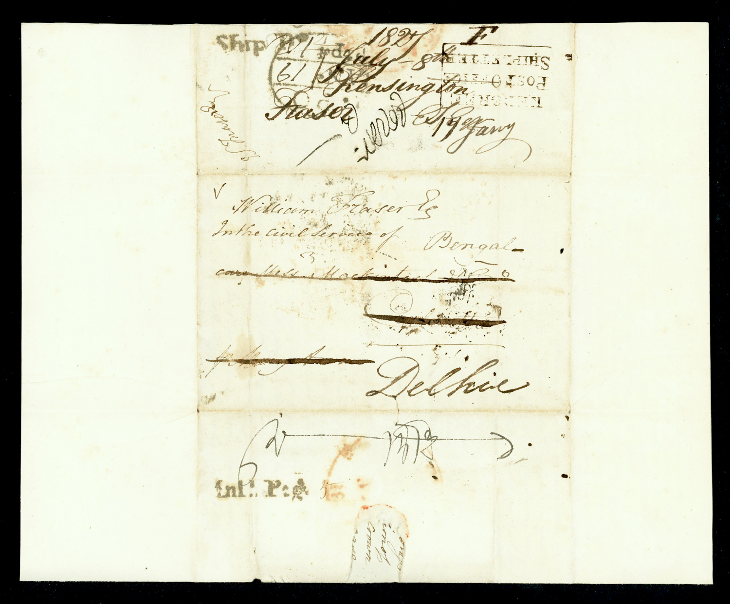 KEDGREE POST OFFICE SHIPLETTER Giles S2 on folded letter from "William Fraser Esq / In the civil service of Bengal" UK to Calcutta, redirected to Delhi, with various Calcutta markings (Image) (Imageb)