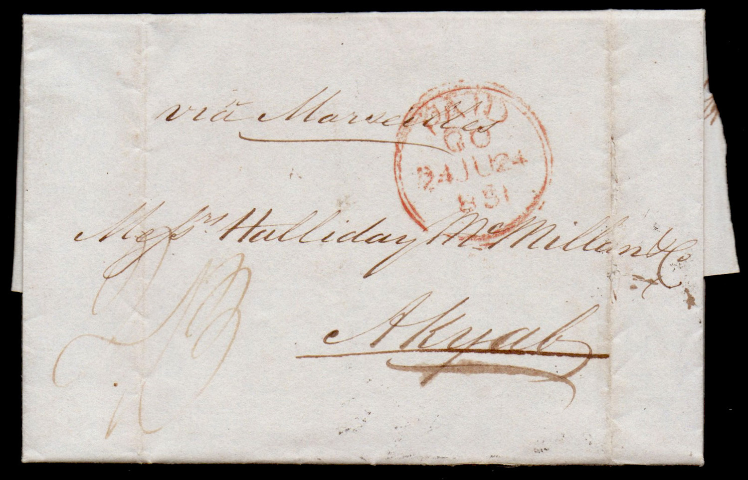 CALCUTTA Bearing Giles 22 on incoming folded letter from London to Akyab, Burma vaia Marseilles (Image) (Imageb)
