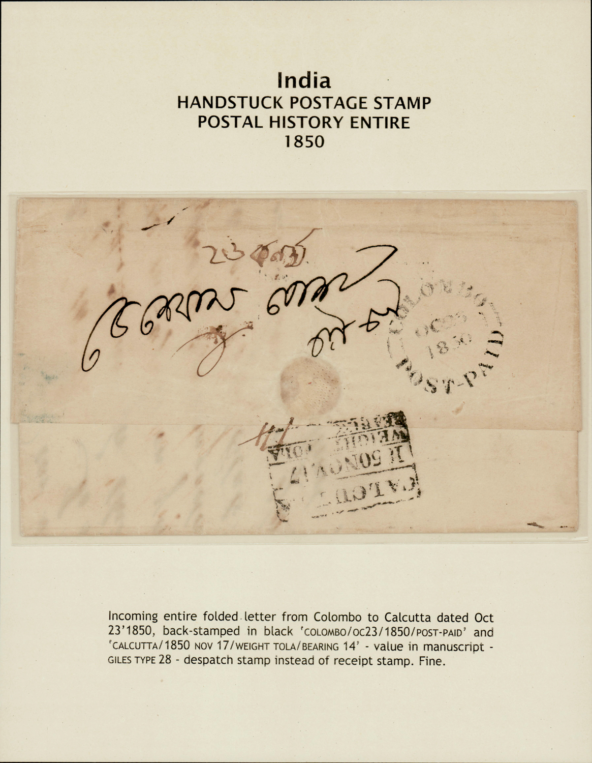 CALCUTTA BEARING Giles 28 used as receiving mark on folded letter from Columbo (Oct 23) per "Dawk", with COLOMBO POST-PAID