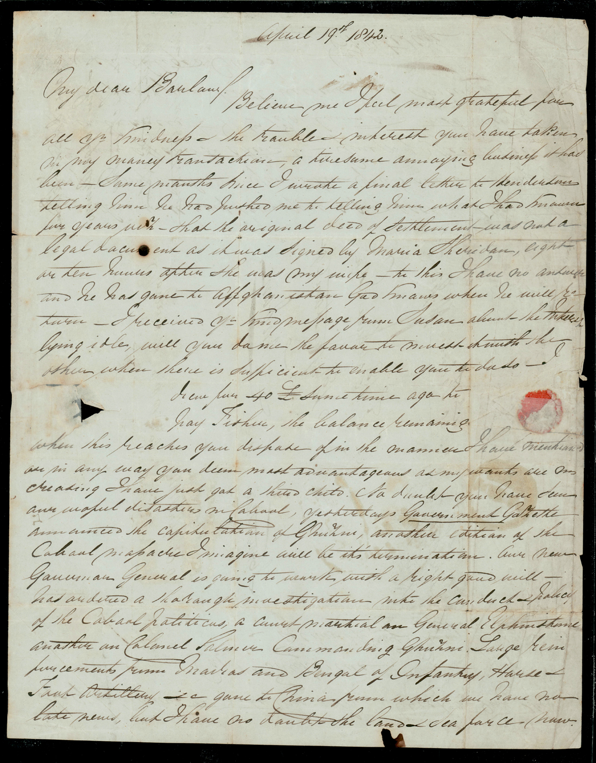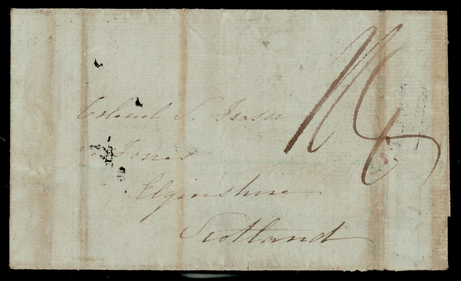 War: BENARES Bearing Giles 8 on 1843 (23 Feb) incoming folded letter from Inverness, endorsed "Overland via Falmouth" to C MacAndrew 47th B.N.I. (Bengal Native Infantry). Interesting contents detailing history of Afghanistan. Transcript of