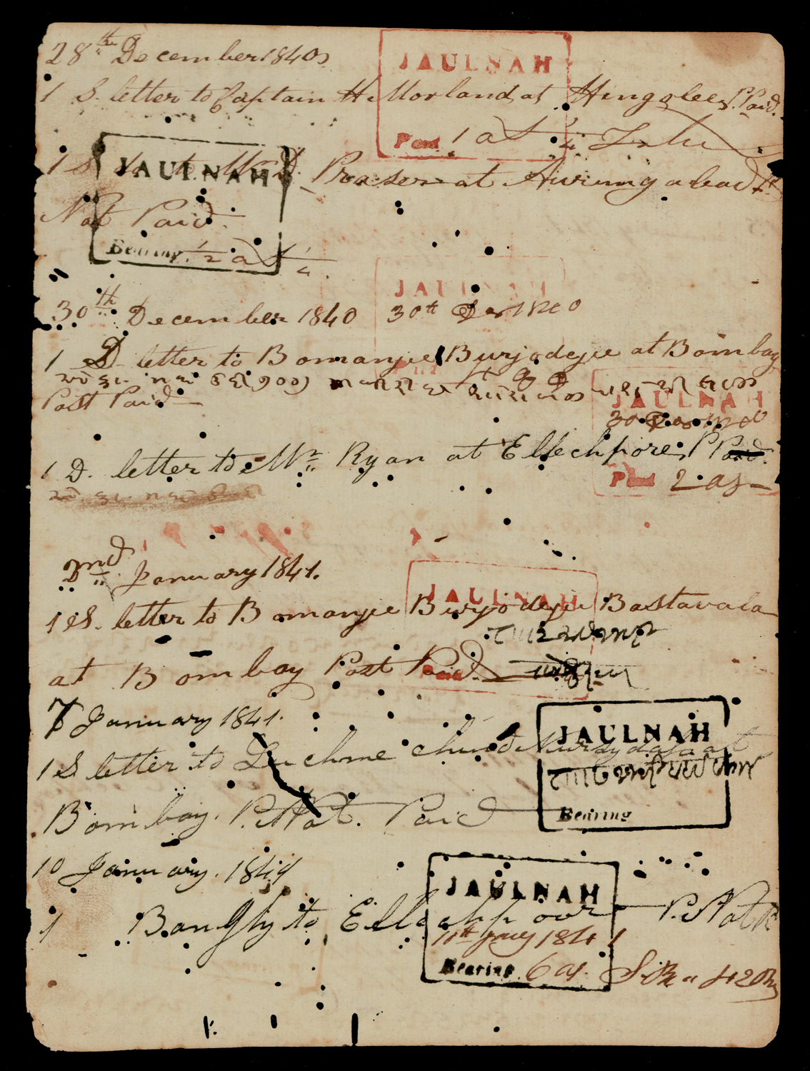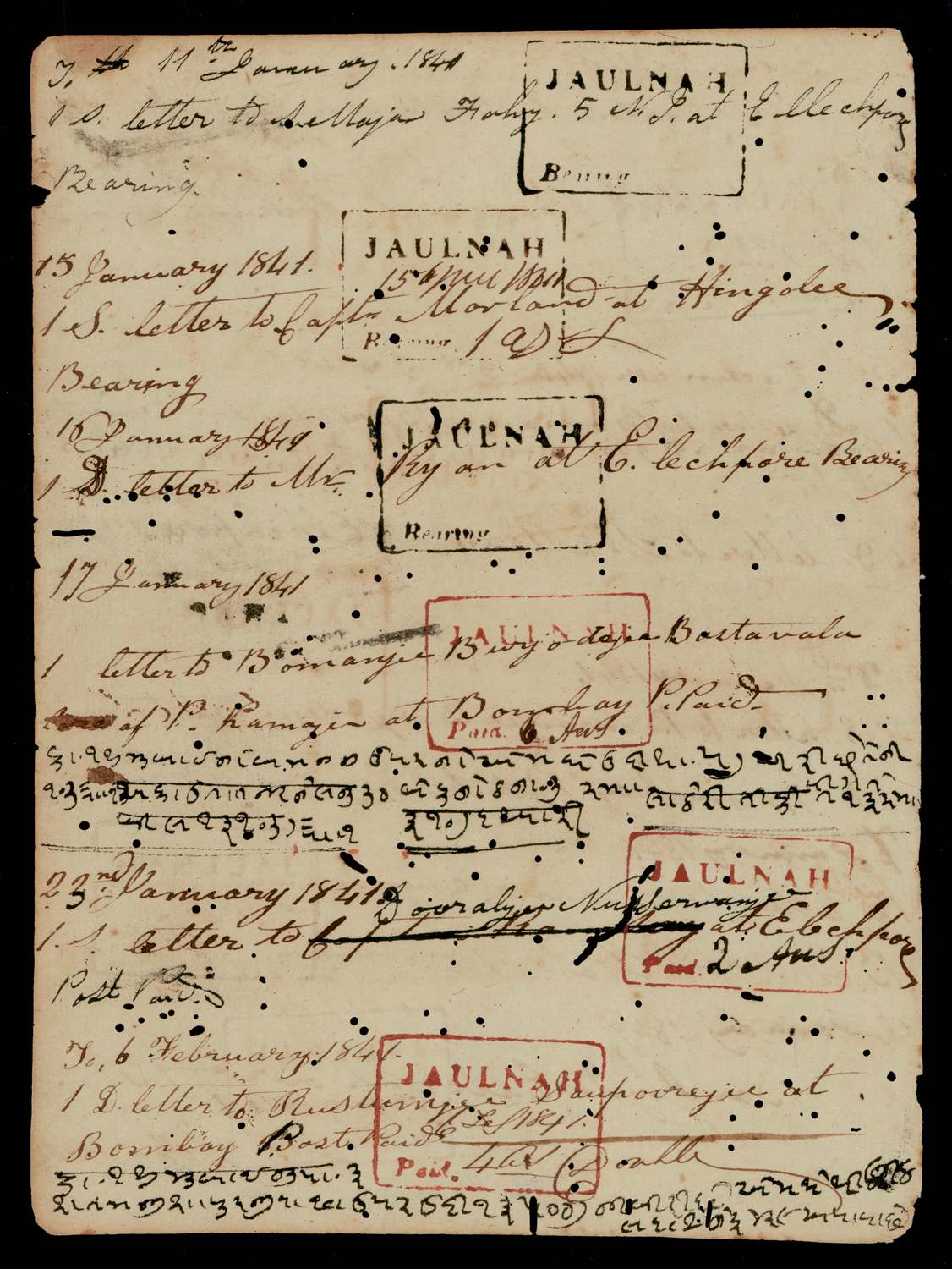 JAULNAH Paid Giles 3 in red and JAULNAH Bearing Giles 4 in black x 13 total strikes on front and back of register page (Image) (Imageb)