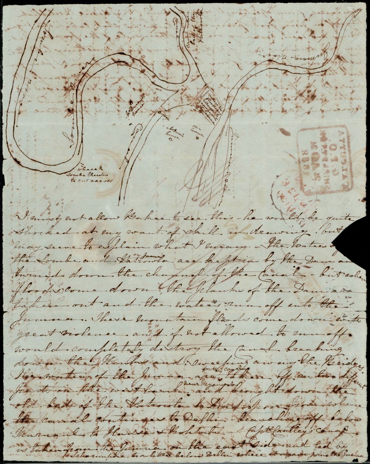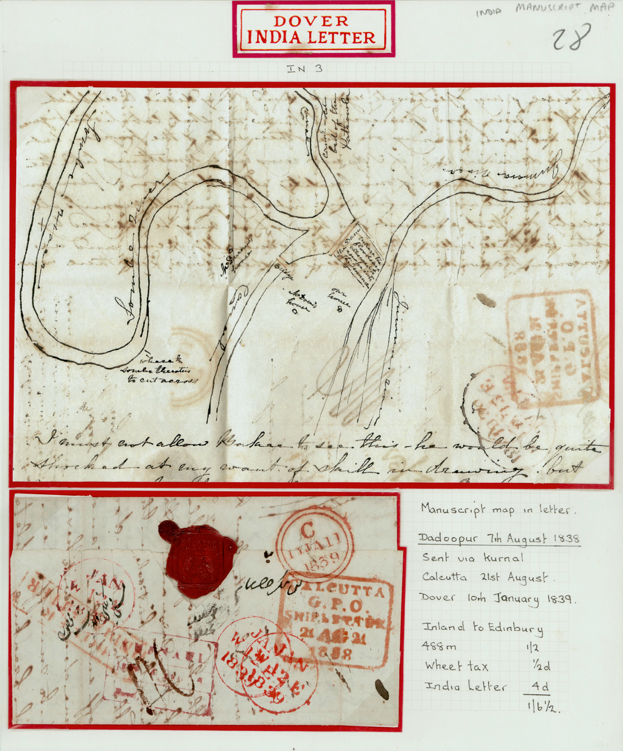 KURNAUL Paid Giles 3 on folded letter from Dadoopore to UK with CALCUTTA G.P.O. SHIPLETTER Giles SD10, with handdrawn map of the surroundings showing the Jumna river and Dams/Canals, from the Duncan correspondence (Image) (Imageb)