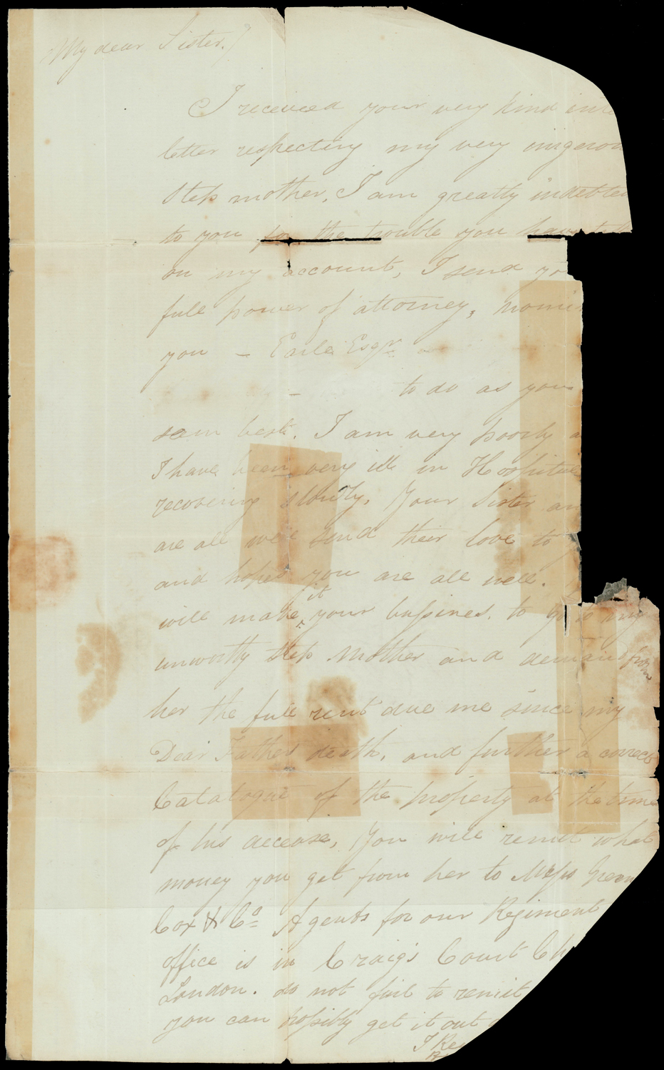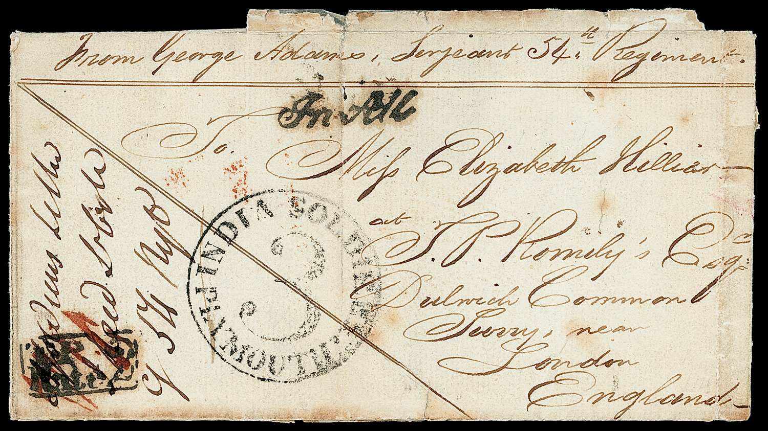 MADRAS SOLDIERS LETTER/FREE Giles SD10 on folded letter (and Power of Attorney) endorsed "From George Adams, Sergeant 54th Regiment" and properly countersigned by commanding officer, addressed to Dulwich Common, England,