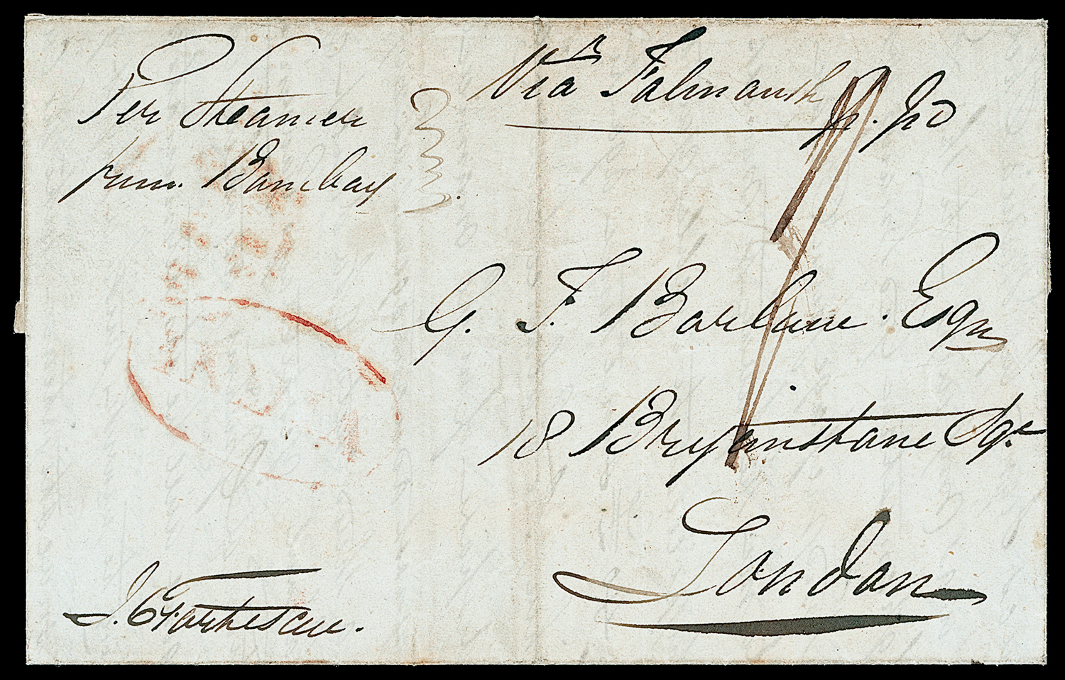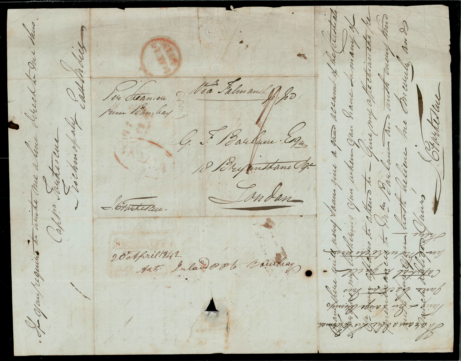 NEGAPATAM/Paid Giles 5 faintly struck in red with manuscript "20th April 1842" date and "As 5 Inland PP to Bombay" rate added on back of folded letter to London, England, sender's directive "Per Steamer from Bombay, Via Falmouth",