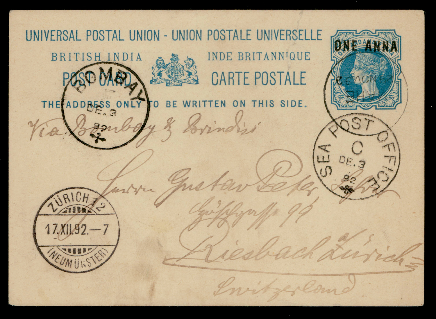 India: MAHE straight line within single circle ds on East India QV 1a on 1½a UPU postcard used 1892 to Switzerland with SEA POST OFFICE cds and Bombay transit
