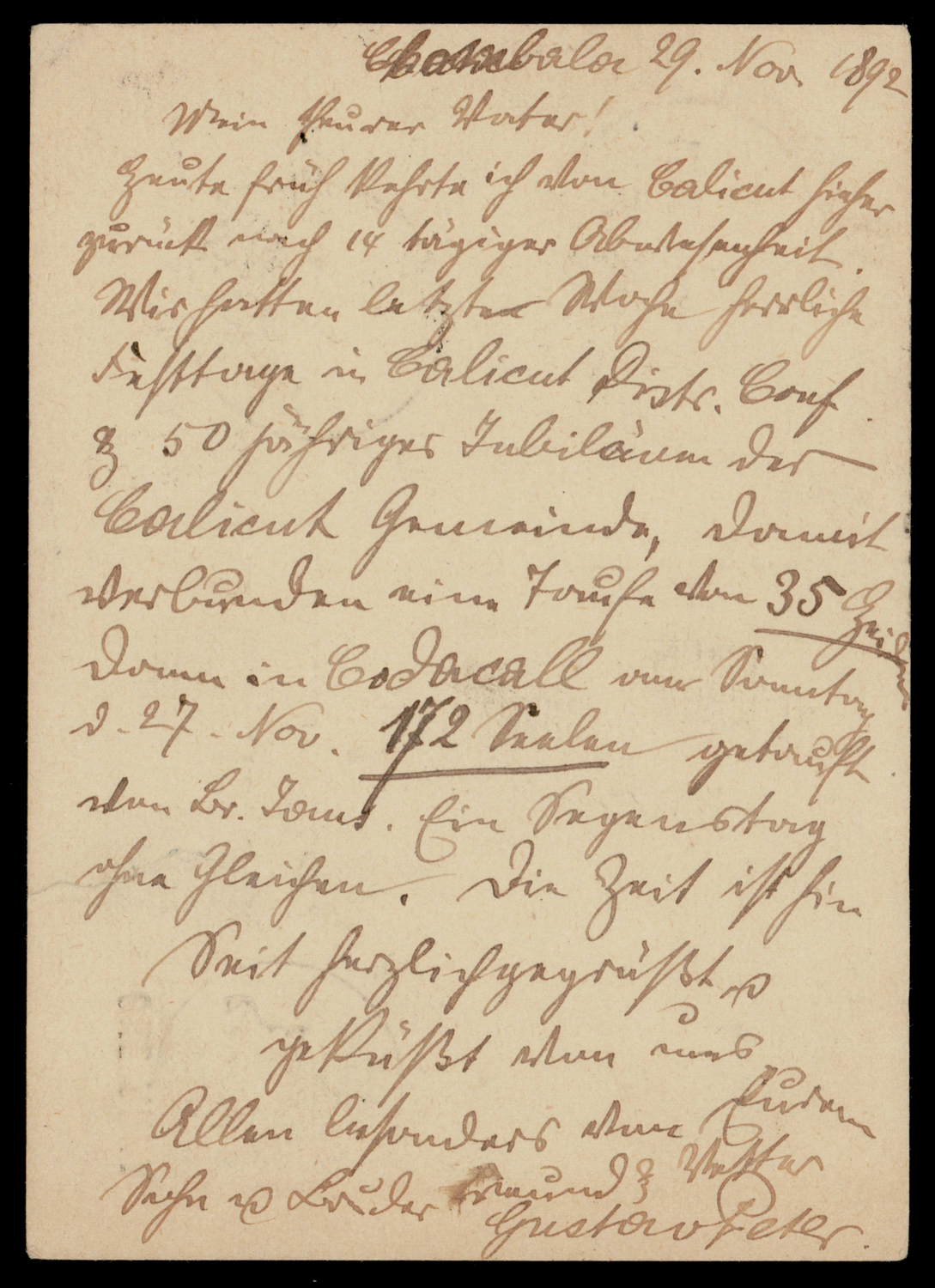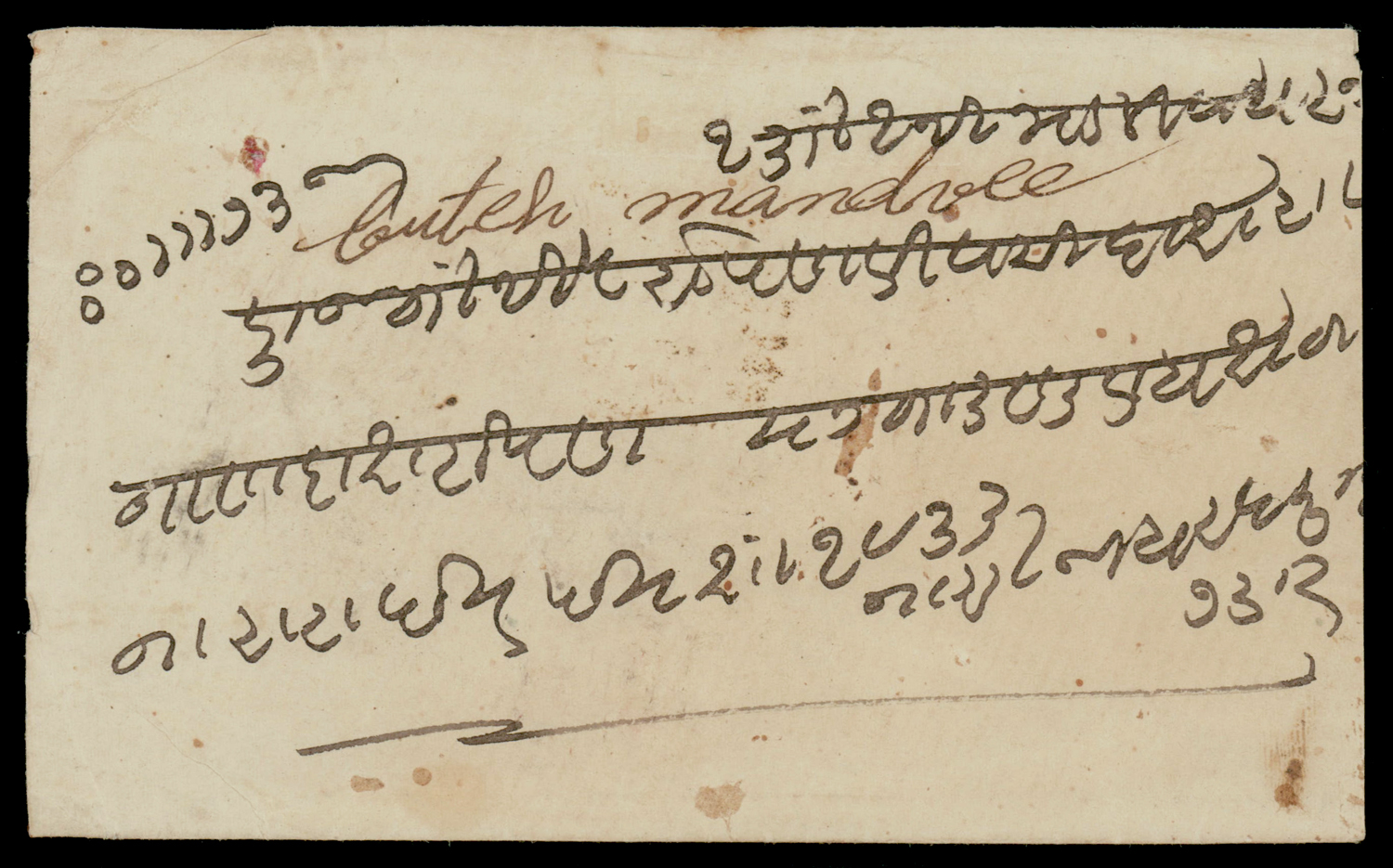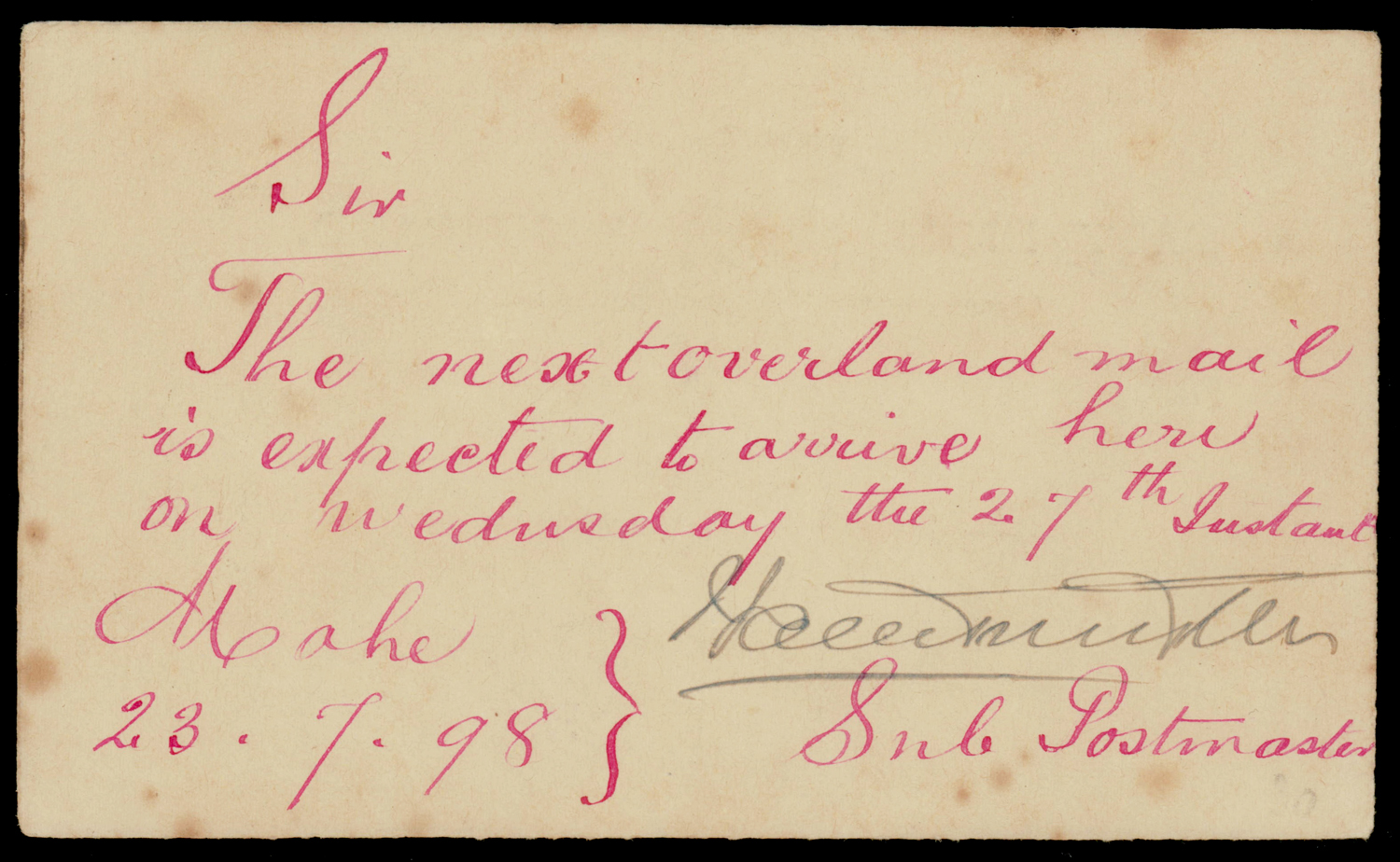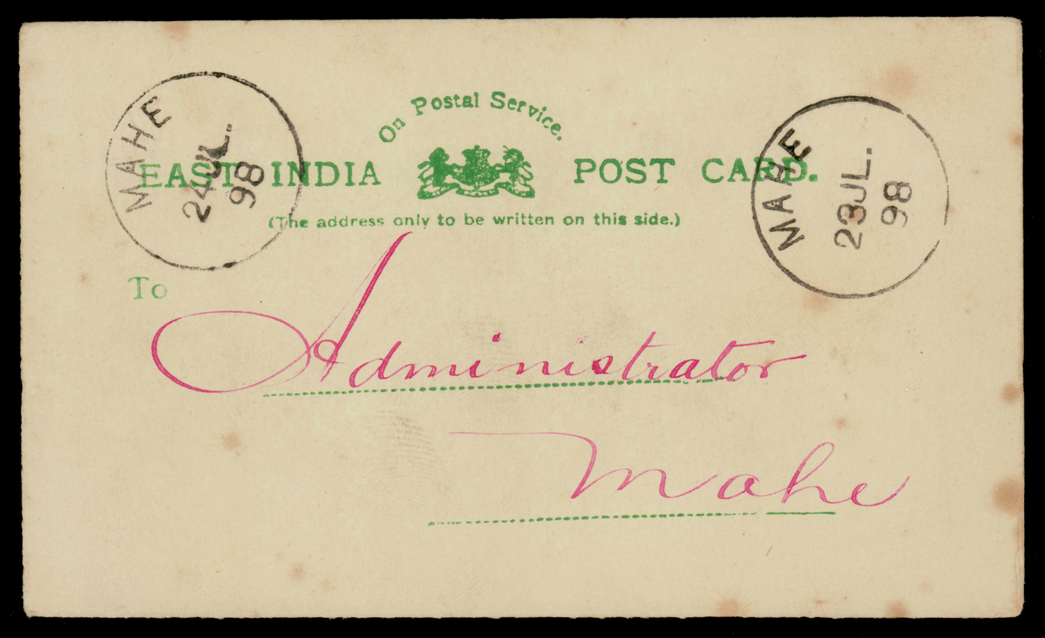 India: MAHE curved line within single circle ds on East India Service postcard used 1898 within Mahe (Image) (Imageb)