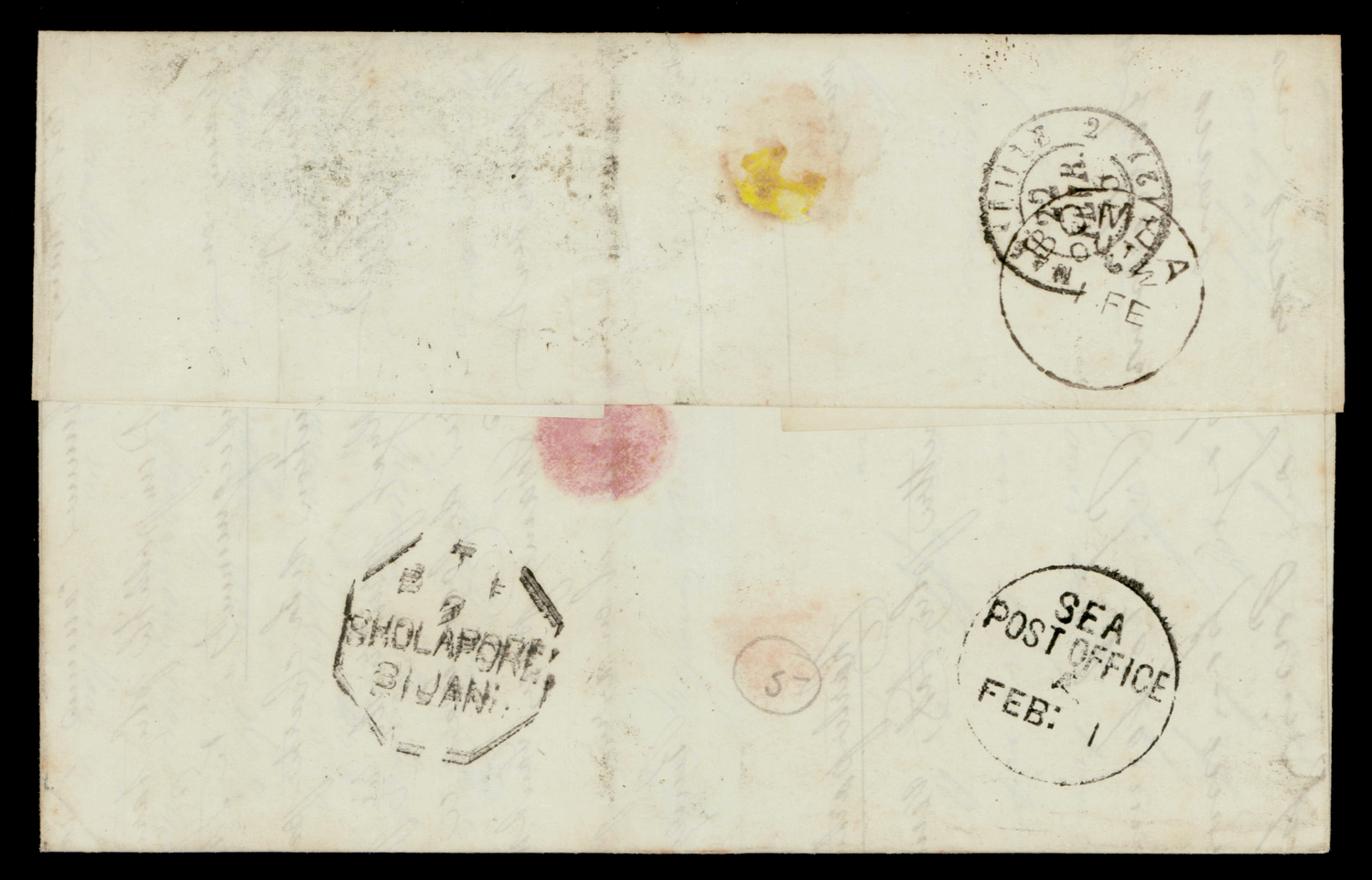 India: PONDICHERRY/M-19 duplex on 1875 cover franked with 26 annas (quadruple weight) to Marseilles via Brindisi, with Amalric & Co. forwarding agent's oval, Bombay and Sholapore transits, SEA POST OFFICE A, and